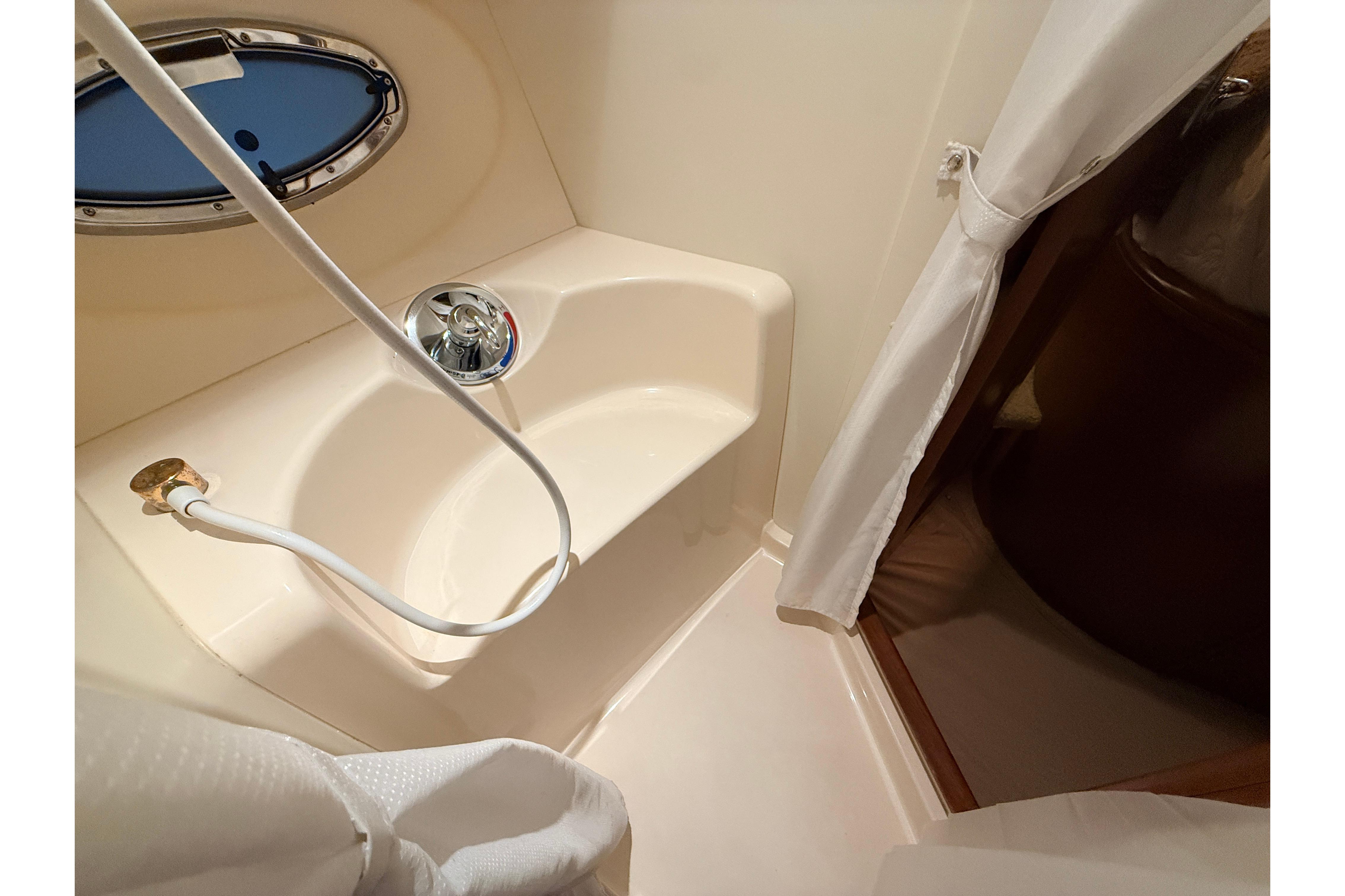 ‘Bellissimo’ features a smartly designed split-head to maximize space and usability with a Vacu Flush toilet and sink to starboard and large stall shower to port. Both head and shower have private access from the master stateroom.