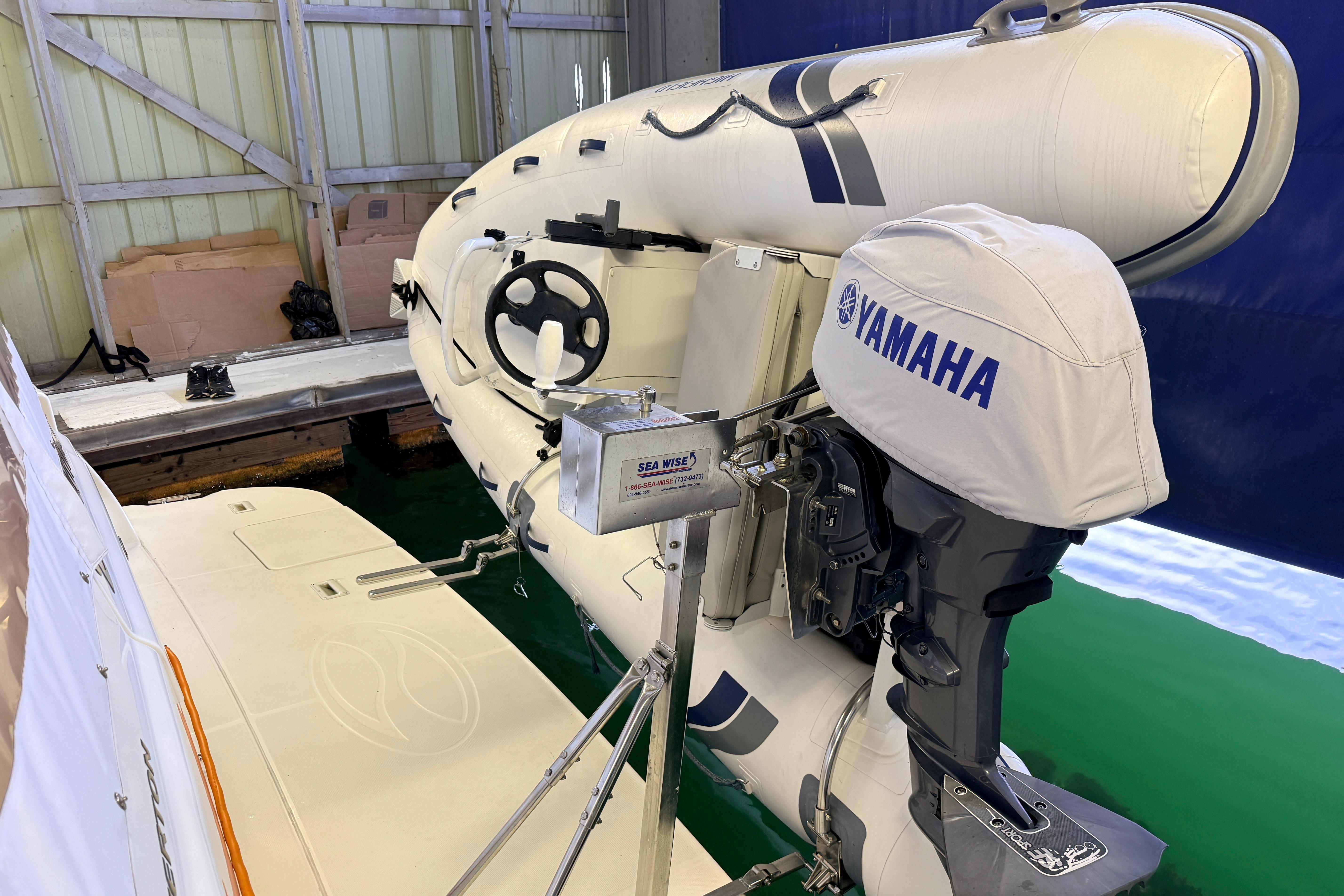 2016 Highfield center console dinghy with 25 hp Yamaha on SeaWise davits and a trailer