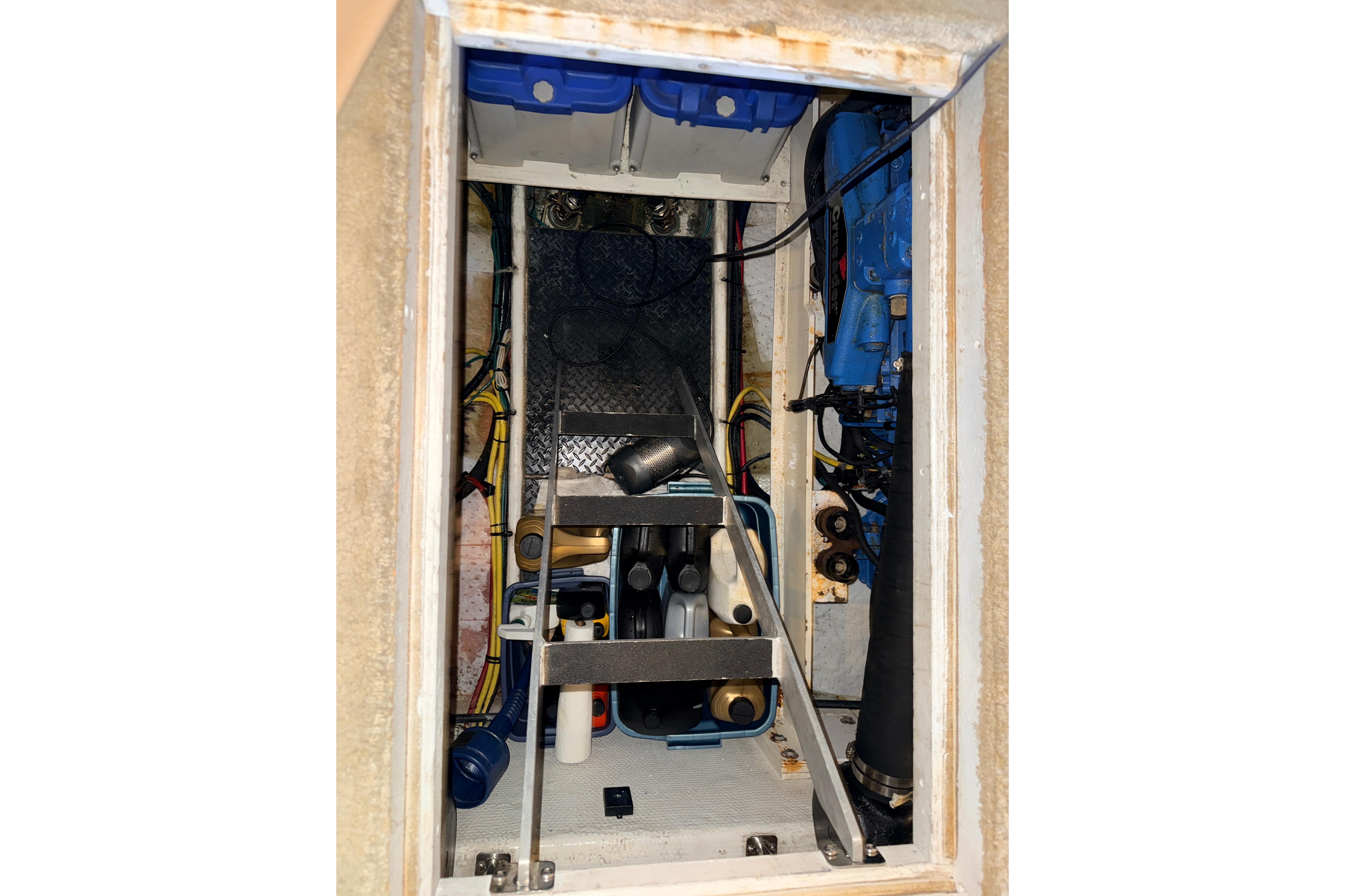 Stepping aboard from the swimgrid you enter a large fully enclosed cockpit. Here is the first of 3 new fridges to keep your beverages cold. Opening the cockpit hatch there is a large storage insert in the floor to keep your gear tidy and when it is lifted out there is great access to the lazarette which has the generator and ample storage space.
