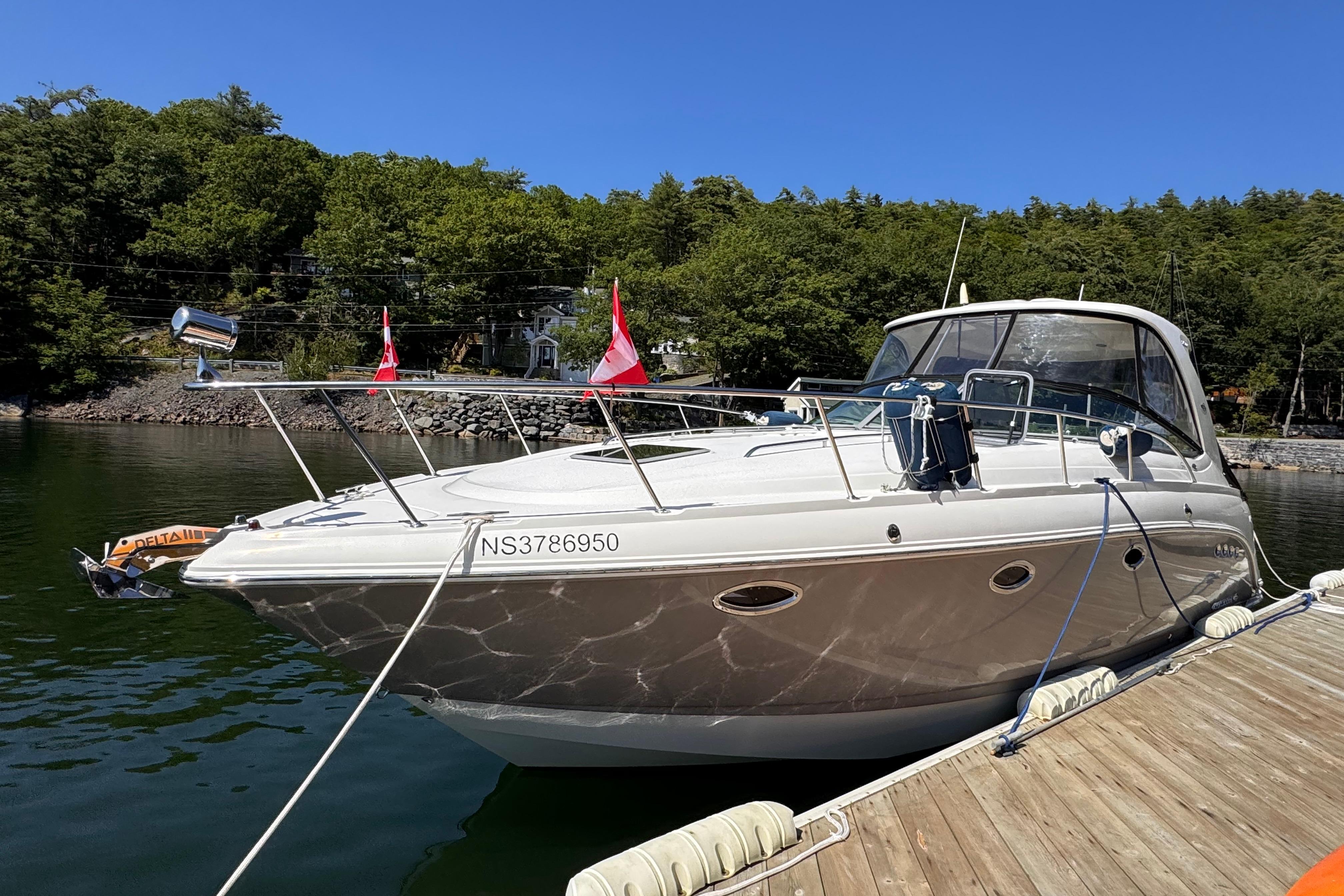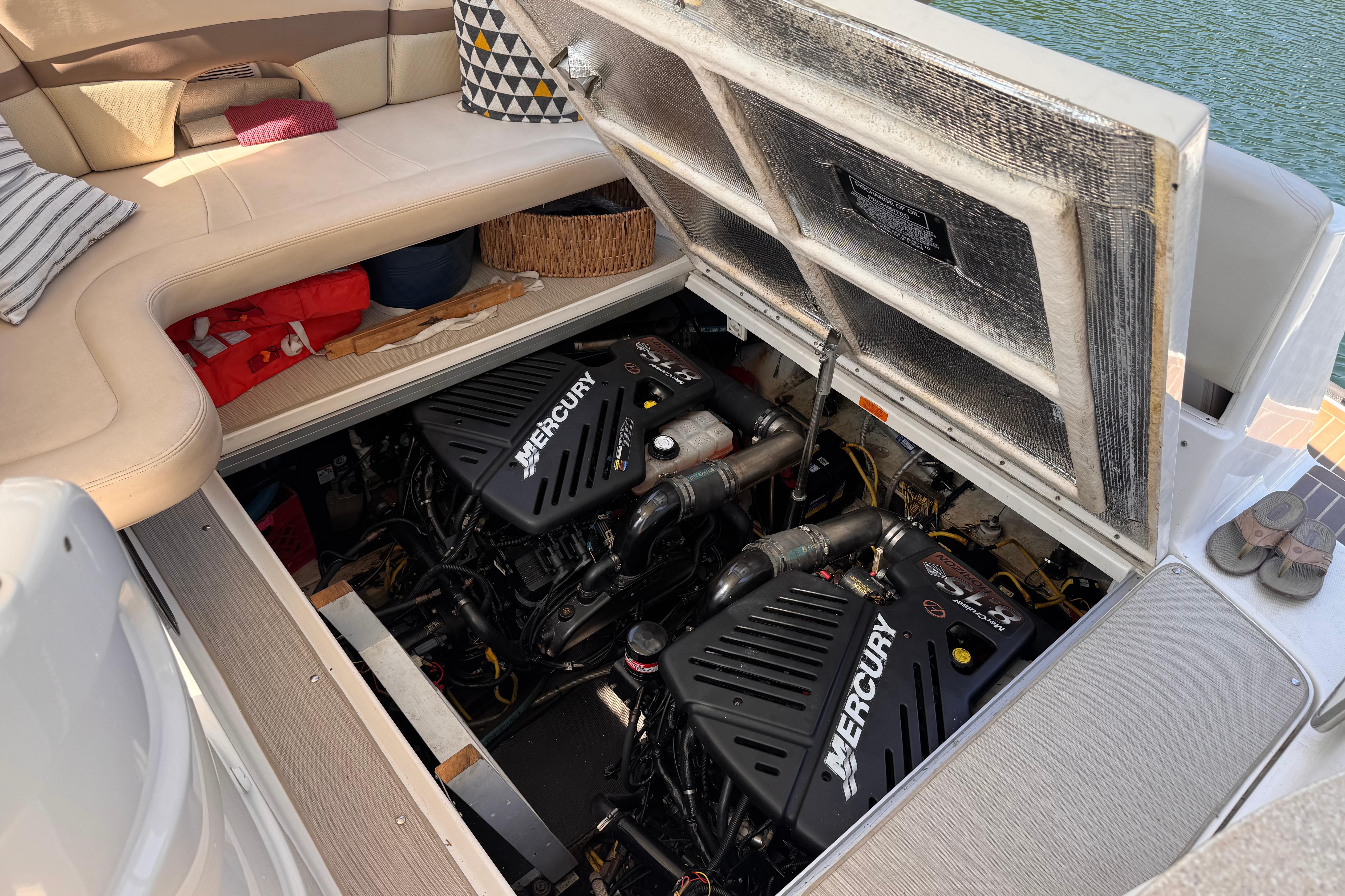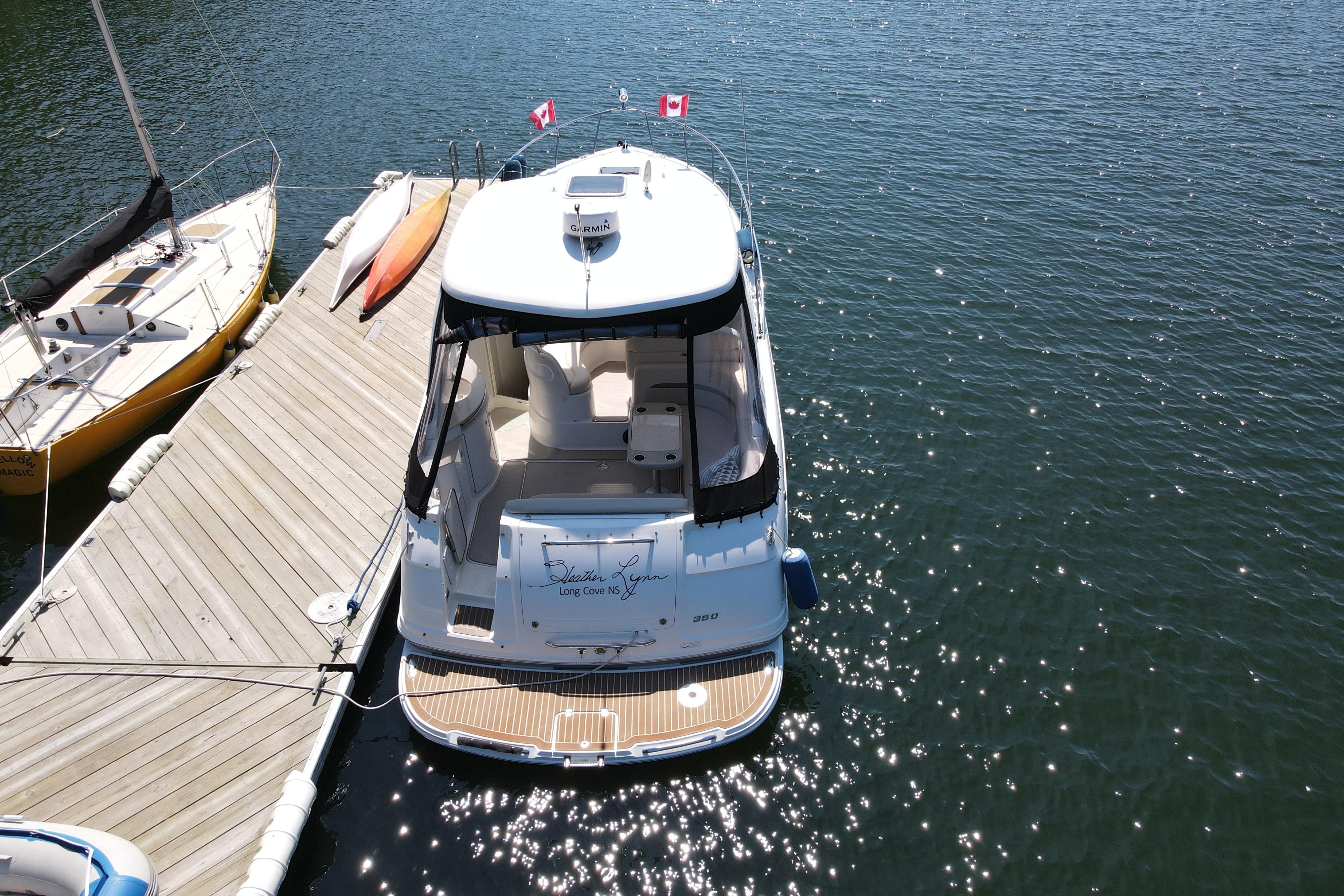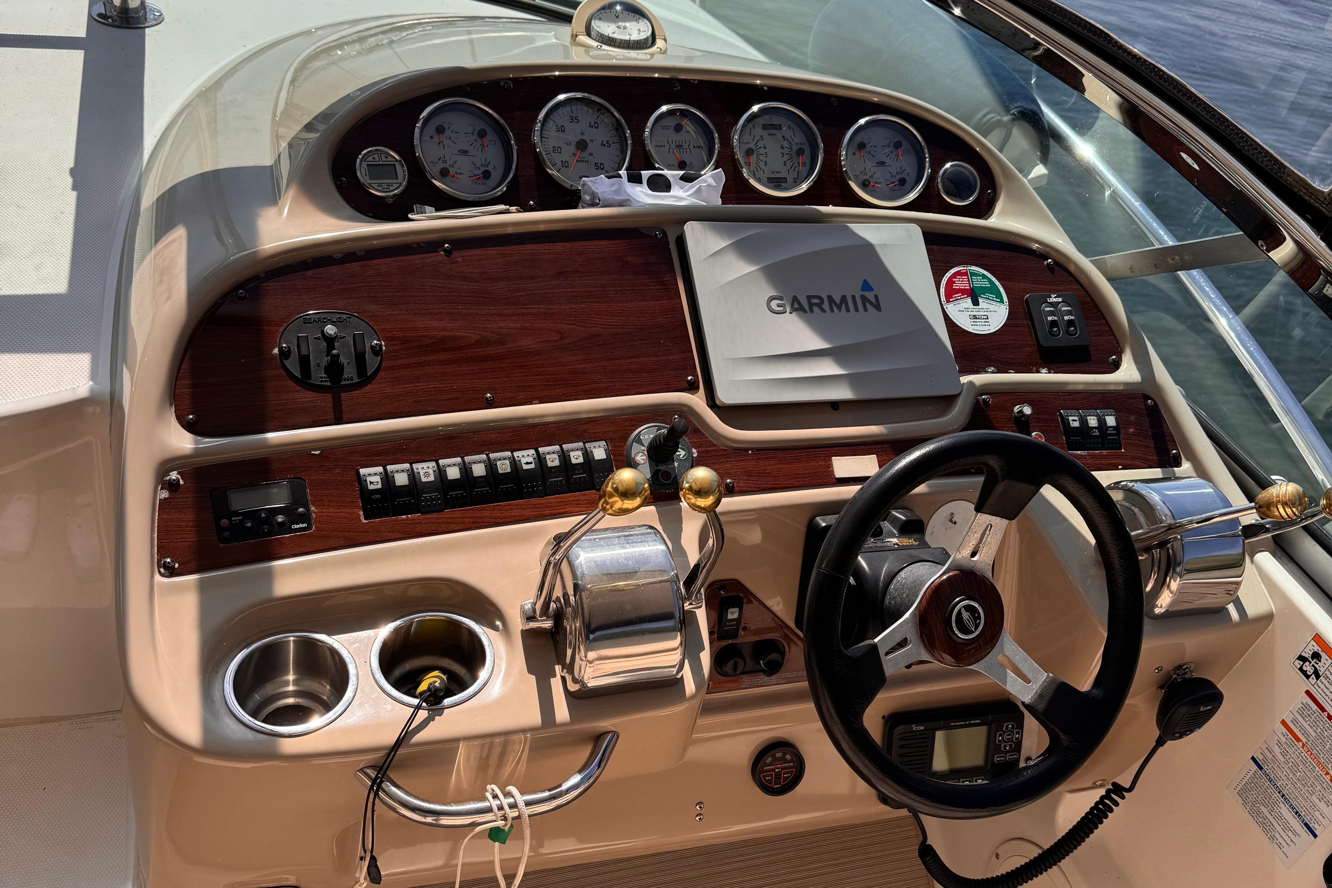 - New rear canvas c/w with new style Elastic Tie-downs 2023 - Additional Bilge pump installed 2023 and all pumps replaced at the same time - Front Bilge pump replaced 2024 - Bow Thruster motor rebuilt 2022 - Bow thruster Blade replaced 2023 - Bow thruster battery replaced 2024 - Shut Off Switch and Fusible Link for Bow Thruster replaced 2022 - House Battery and Gen Set batteries replaced 2023 - Main Engine Batteries replaced 2021 - All Battery cables replaced 2019 - All Electrical Shut Off Switches replaced 2023 - All engine exhaust manifolds and Risers replaced 2022 - Most Sensors replaced on both engines 2022/2023 - On Board Fire Extinguishing System replaced 2022 - Rudders pulled, shafts and bushings inspected and new packing 2022 - Navionics upgrade in 2022 with Garmin 7410 Marine GPS Plotter/radar - New Dome Radar and Depth Sounder 2022 - New Icom VHF IC-M506 Marine radio and Fiberglass antenna 2023 - Bottom Paint last spring - Props, shafts and Trim Tabs had “ Prop Speed “ coatings applied Spring 2023 - Boat is compounded and waxed annually - Full Service carried out by Conrad's Marine November 2024 including winterization and Shrink wrapped. - Some seat cushions and backrests reupholstered in Spring 2023 - Carpets were new in 2021 - Shower Controls at Swim Platform replaced 2023