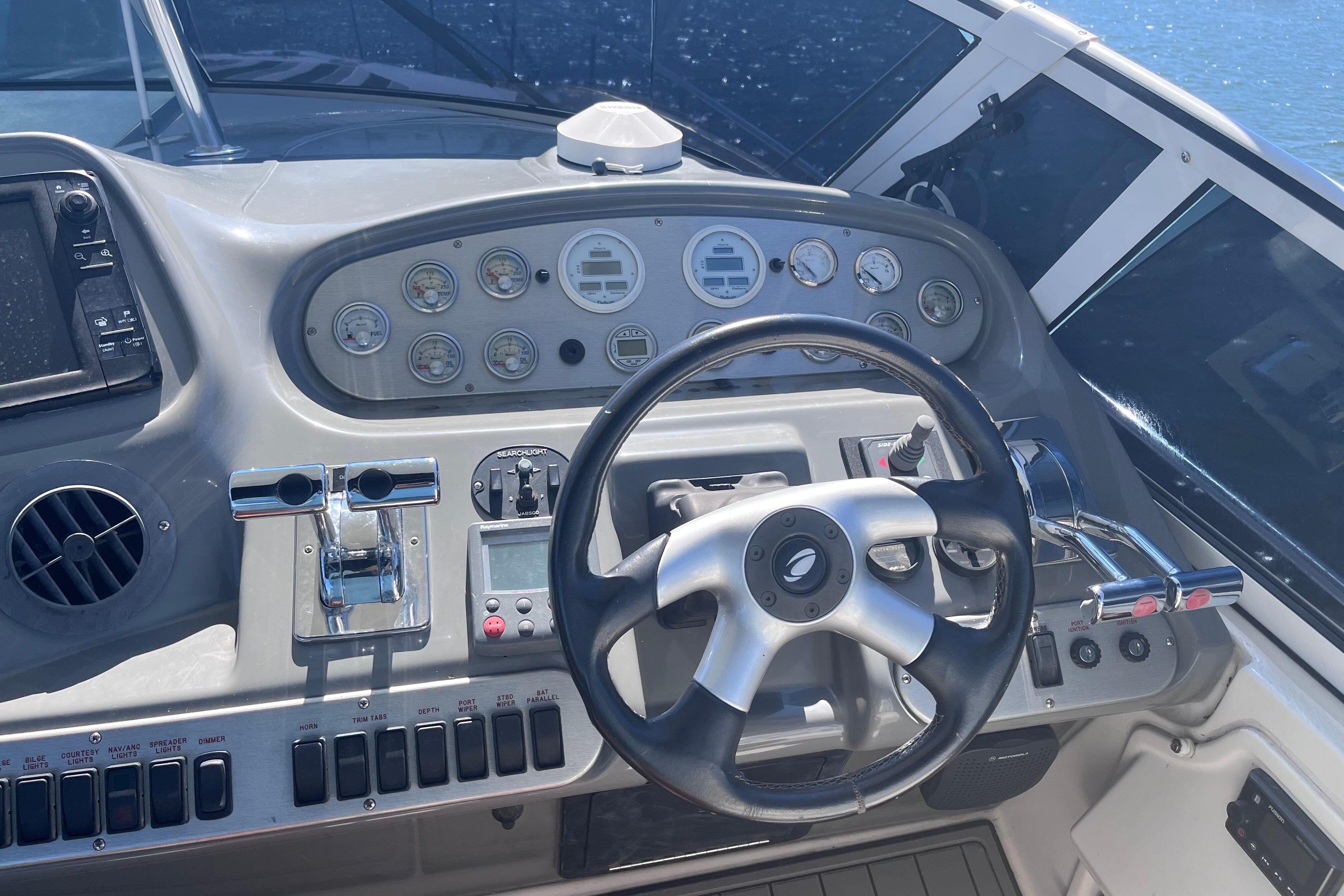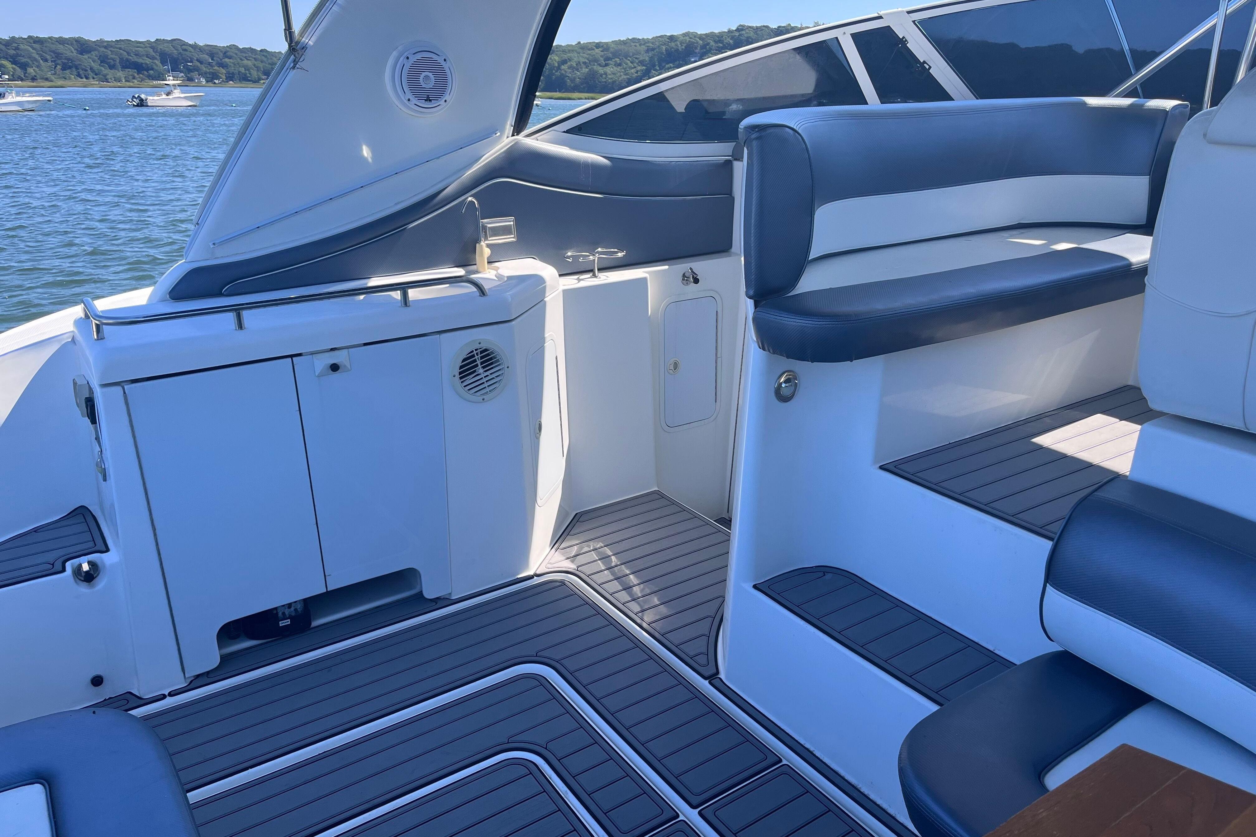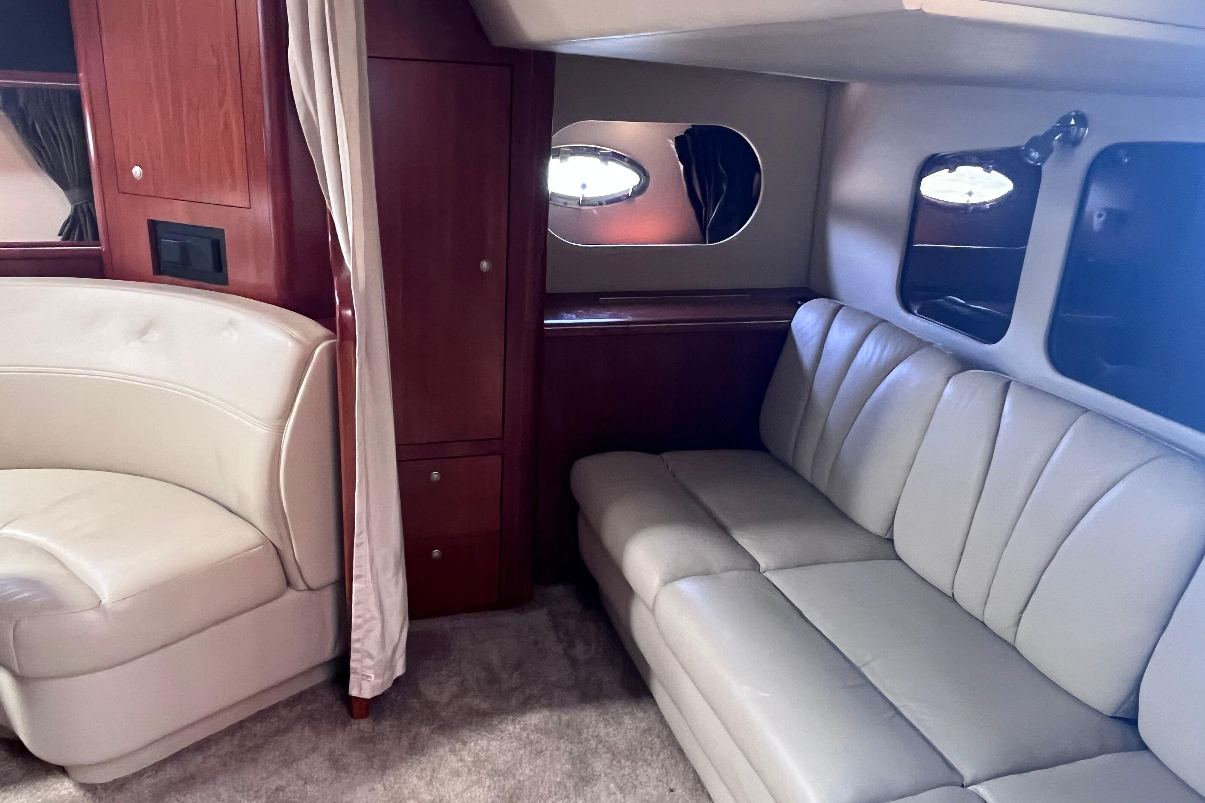 Powered by Twin Yanmar 315 HP diesel engines, this yacht is efficient and well-maintained. The spacious cockpit with wet bar makes entertaining easy, while the interior offers a private stateroom, galley, and a single-level salon finished in rich cherry woodwork.