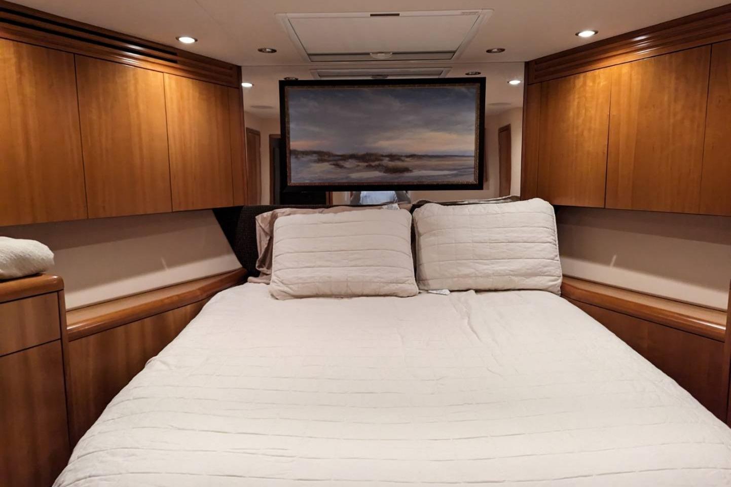 Walkaround queen berth with storage Lockers & drawers port & starboard Hanging locker with light, Cruisair SMX IR air conditioning control Overhead hatch with screen & blackout cover Sharp LCD TV aft Remote stereo controller VIP En Suite Amtico sole Mirrored overhead with recessed lights Overhead hatch with screen & blackout cover Marble vanity Mirrored vanity Headhunter electric head Circular shower stall with Plexi door, hot/cold water faucet to showerhead on hose with adjustable wall mount Towel bar