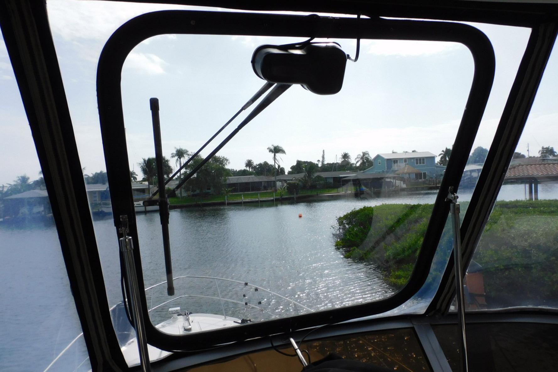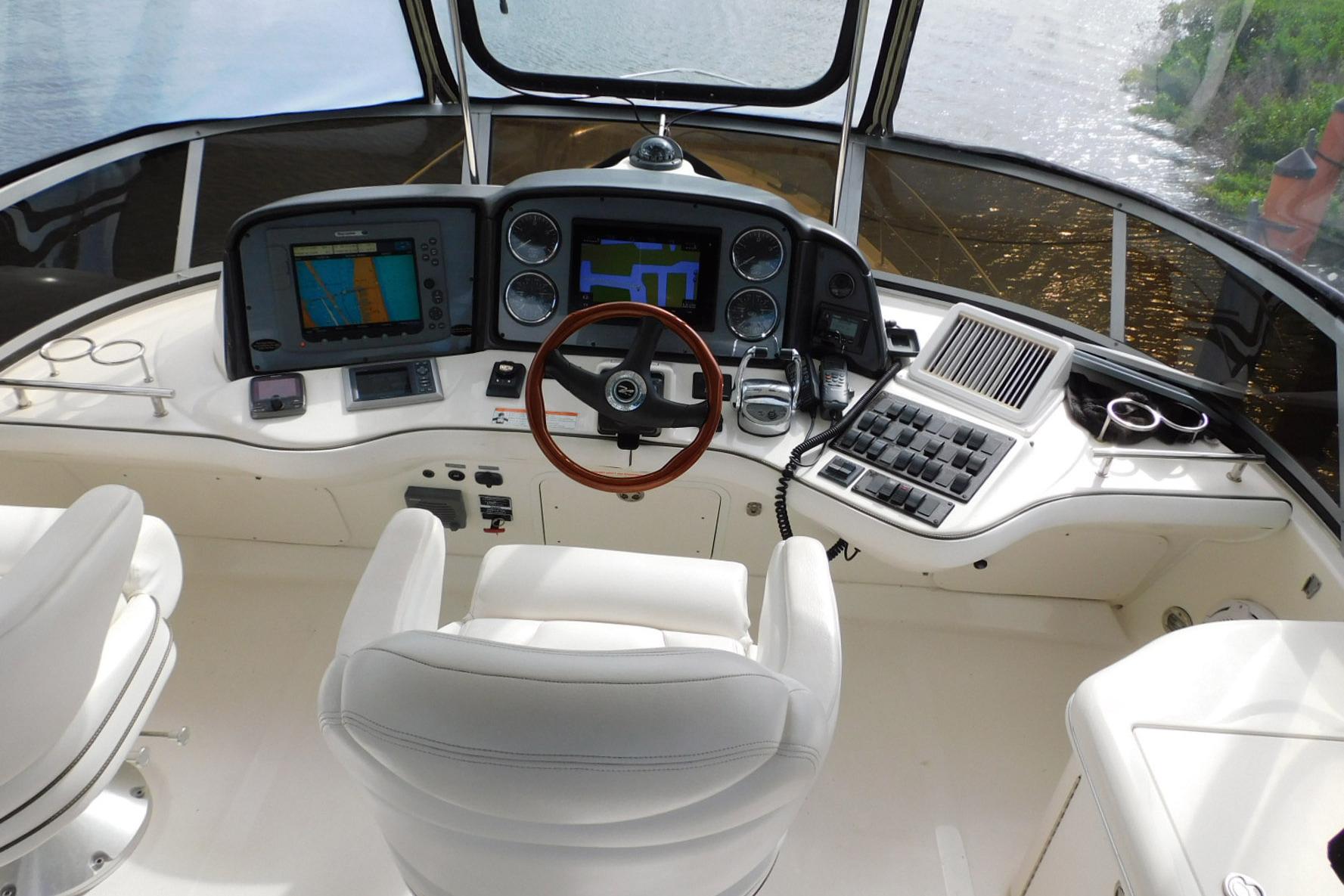 A sliding glass door opens to the cockpit, which features a walk-through transom, bench seating, and molded flybridge stairs. Offering good visibility fore and aft, the extended flybridge includes a large U-Shaped aft seat with a removable table.