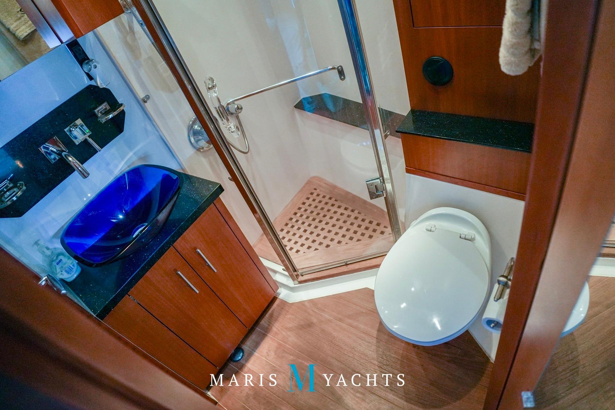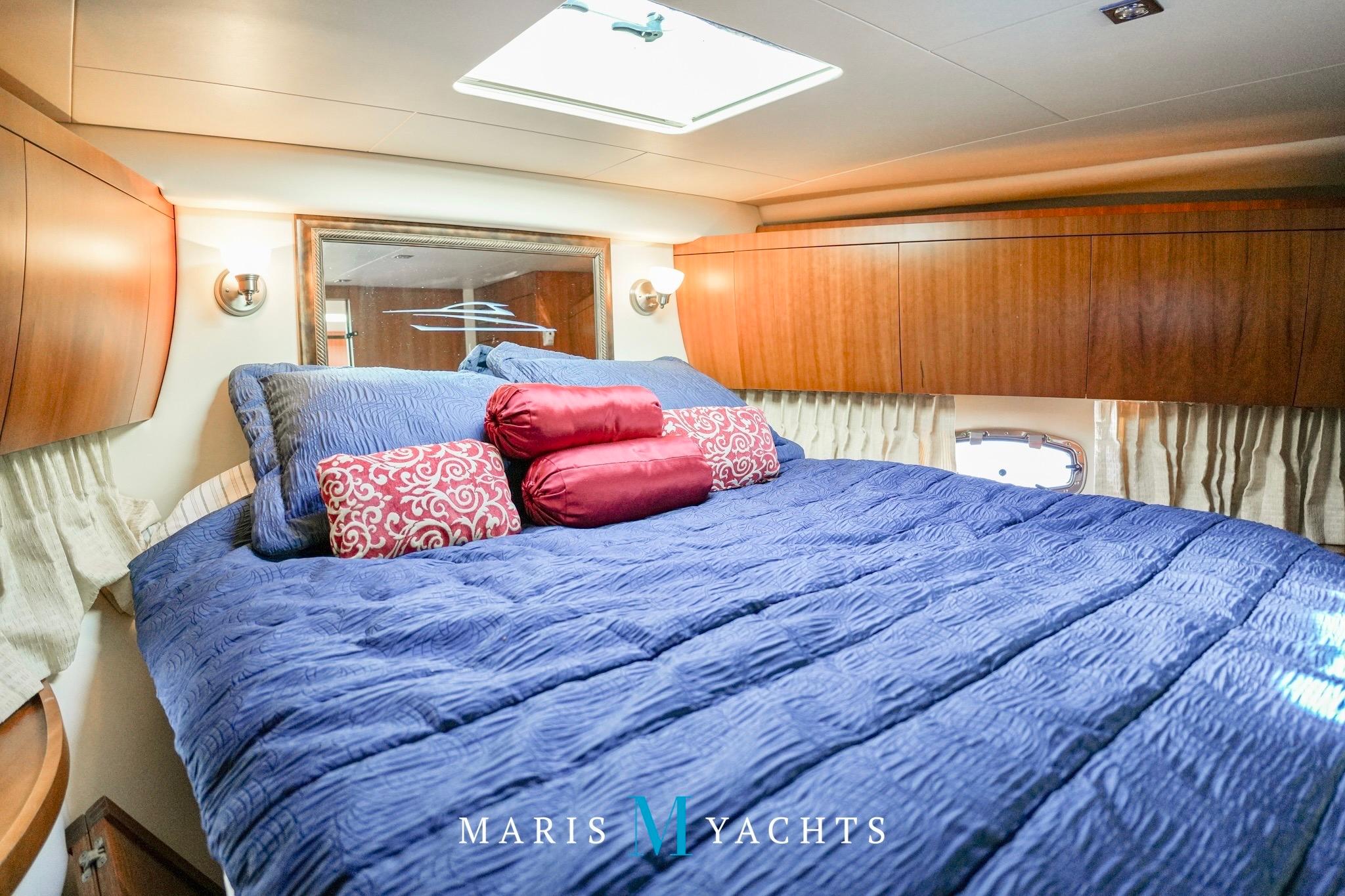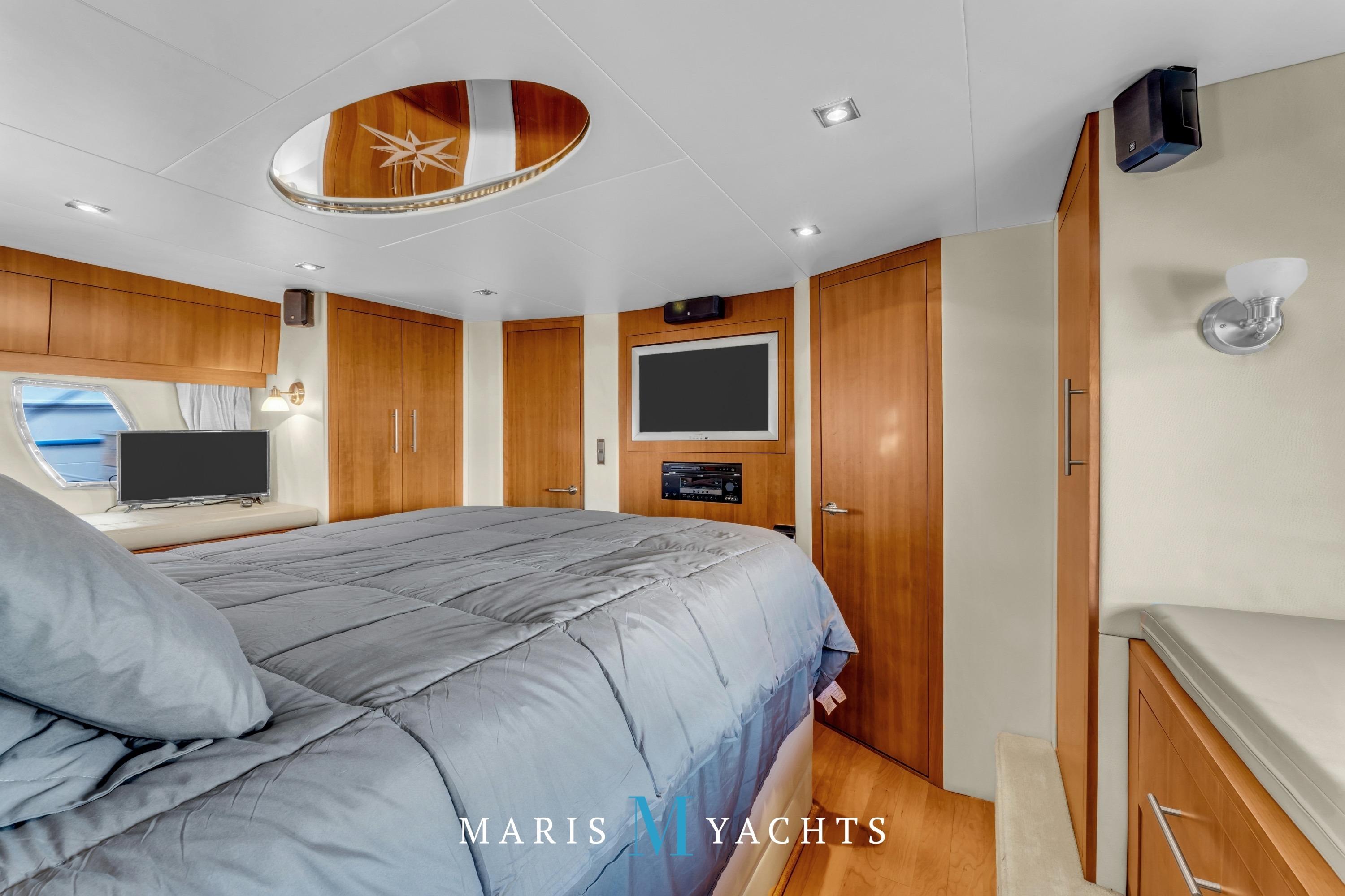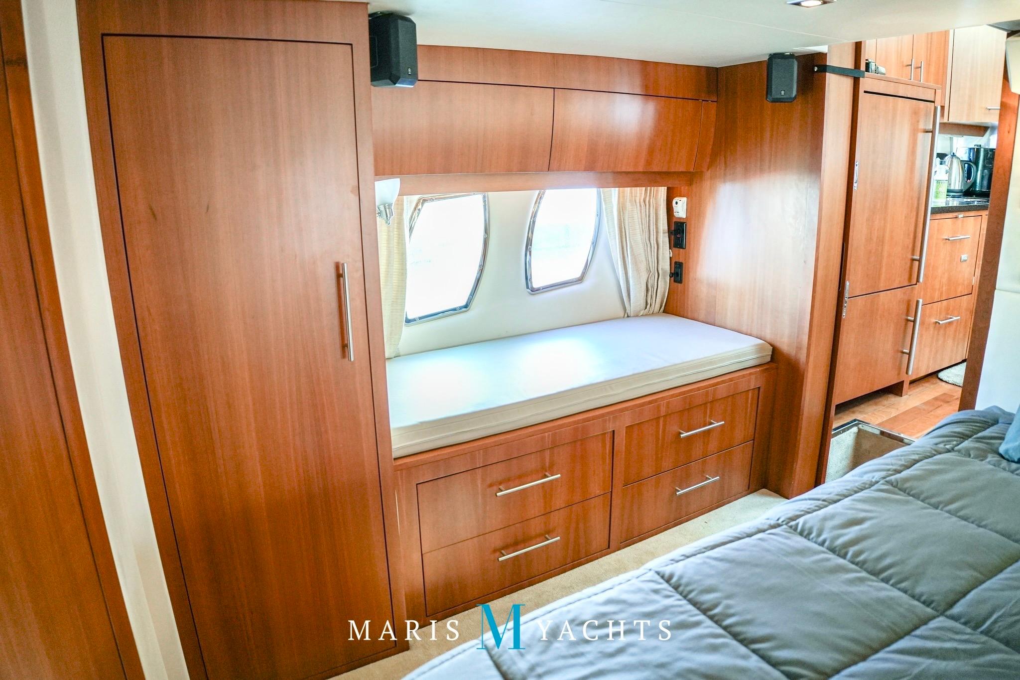 A few steps aft lead to the private full-beam master stateroom, which spans the yacht’s width, a true highlight of the Regal 52’s design. This serene space features a queen island berth, generous storage cabinetry, and large hull windows that flood the room with light, port and starboard side benches and a mounted flat screen TV with surround sound. To starboard, a concealed washer/dryer is built into the cabinetry for long-range convenience. The ensuite . head includes a separate shower stall, Vacuflush toilet, and elegant vanity with sink, all finished with contemporary fixtures and warm wood tones. Quiet, private, and luxurious, this suite offers the comfort of a much larger yacht.