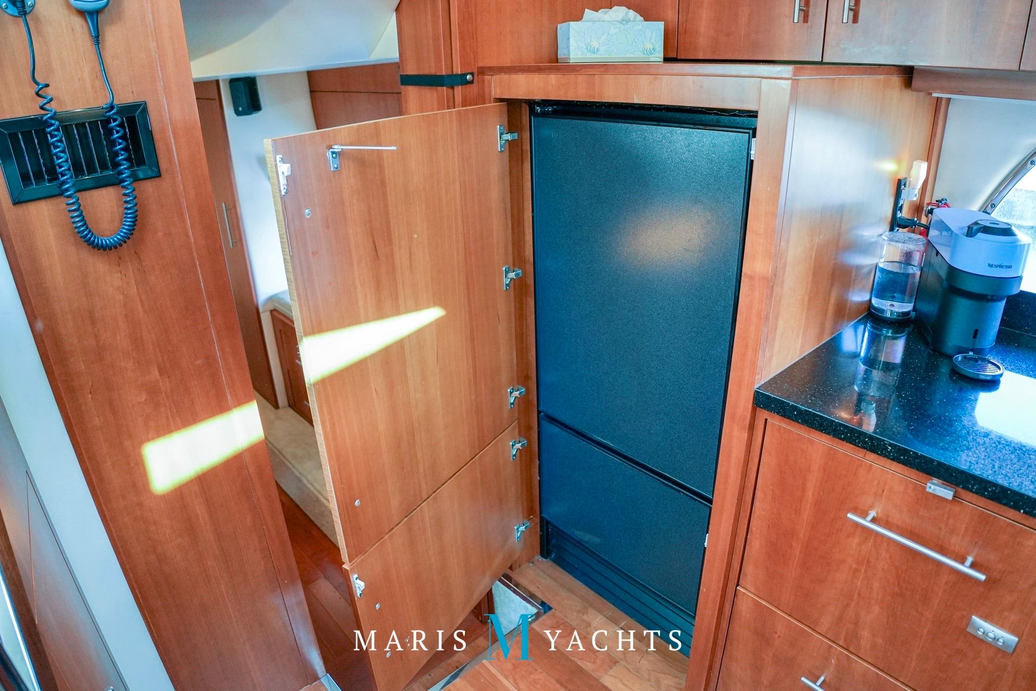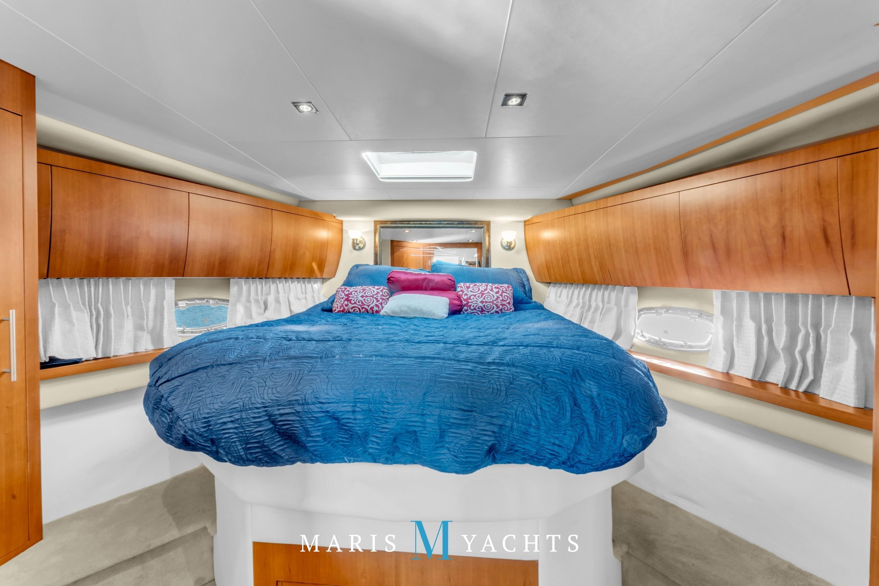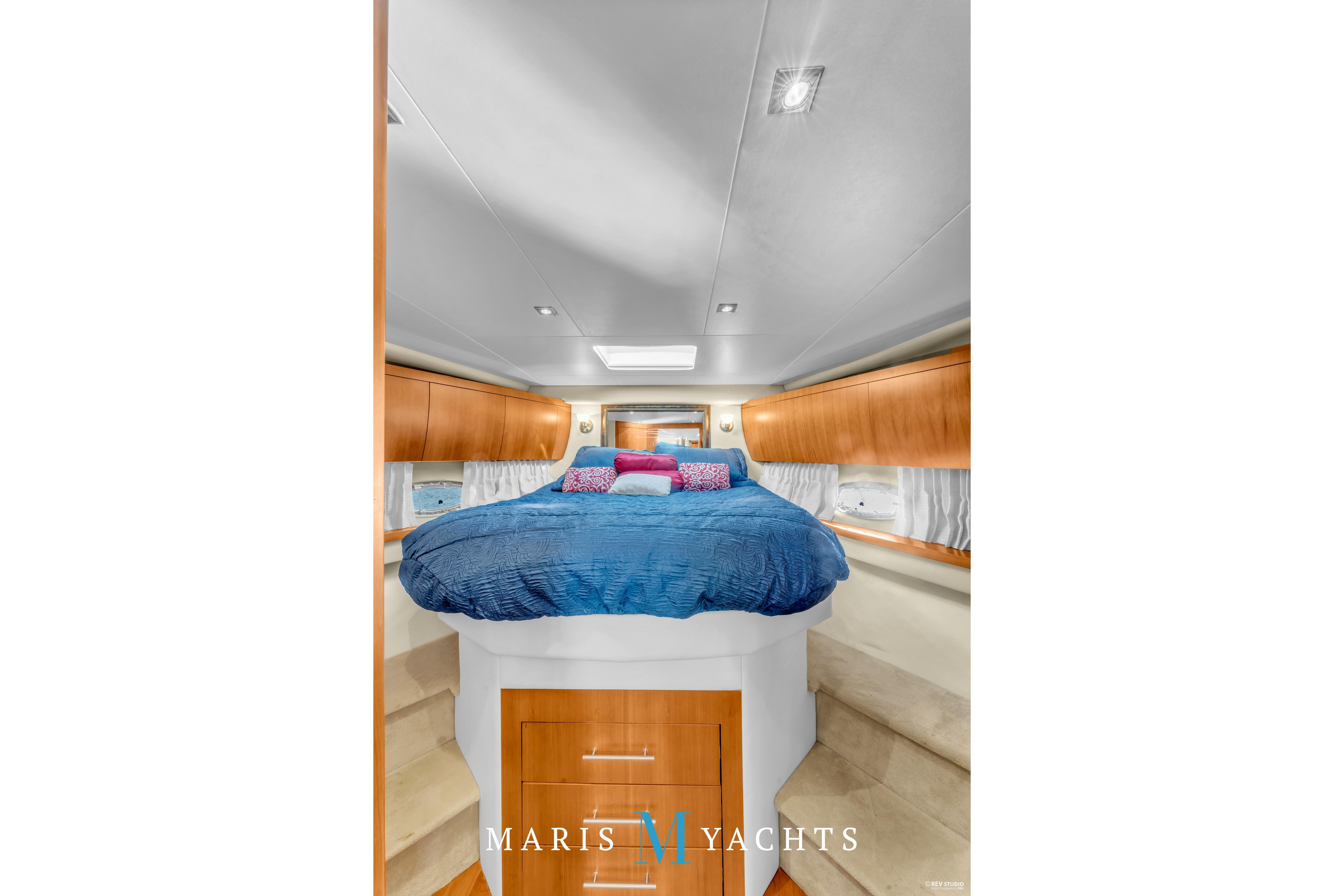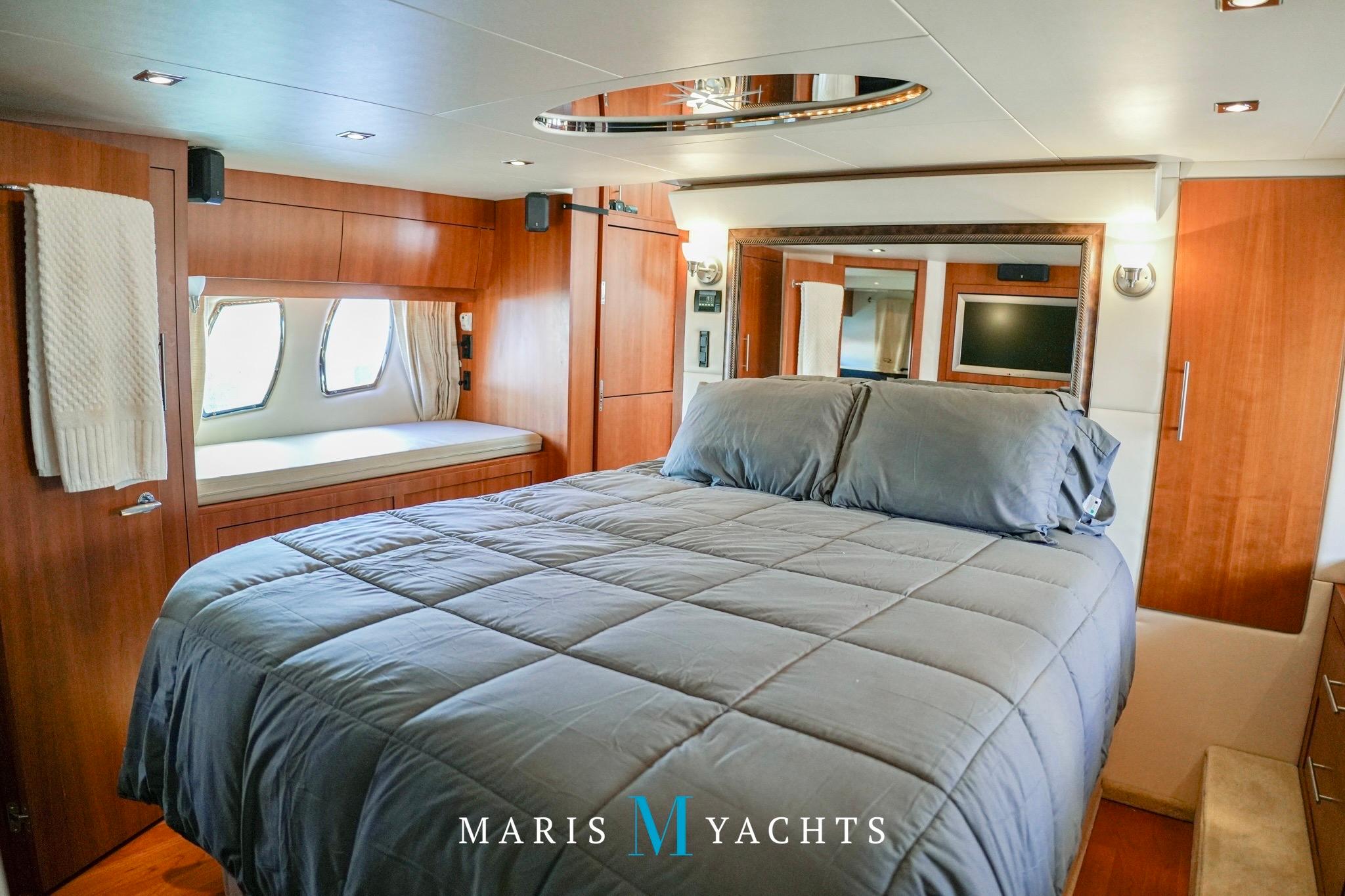 A few steps aft lead to the private full-beam master stateroom, which spans the yacht’s width, a true highlight of the Regal 52’s design. This serene space features a queen island berth, generous storage cabinetry, and large hull windows that flood the room with light, port and starboard side benches and a mounted flat screen TV with surround sound. To starboard, a concealed washer/dryer is built into the cabinetry for long-range convenience. The ensuite . head includes a separate shower stall, Vacuflush toilet, and elegant vanity with sink, all finished with contemporary fixtures and warm wood tones. Quiet, private, and luxurious, this suite offers the comfort of a much larger yacht.