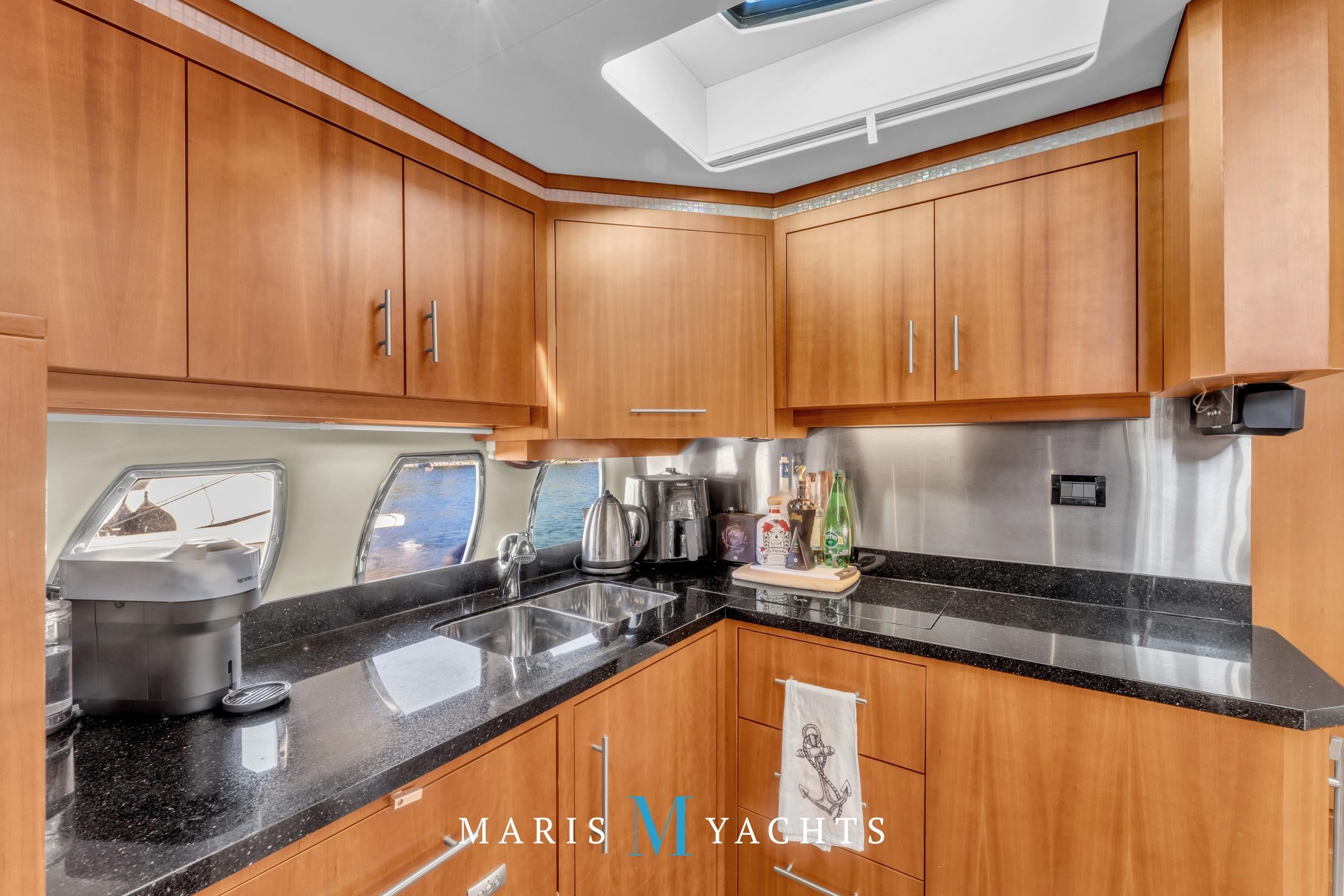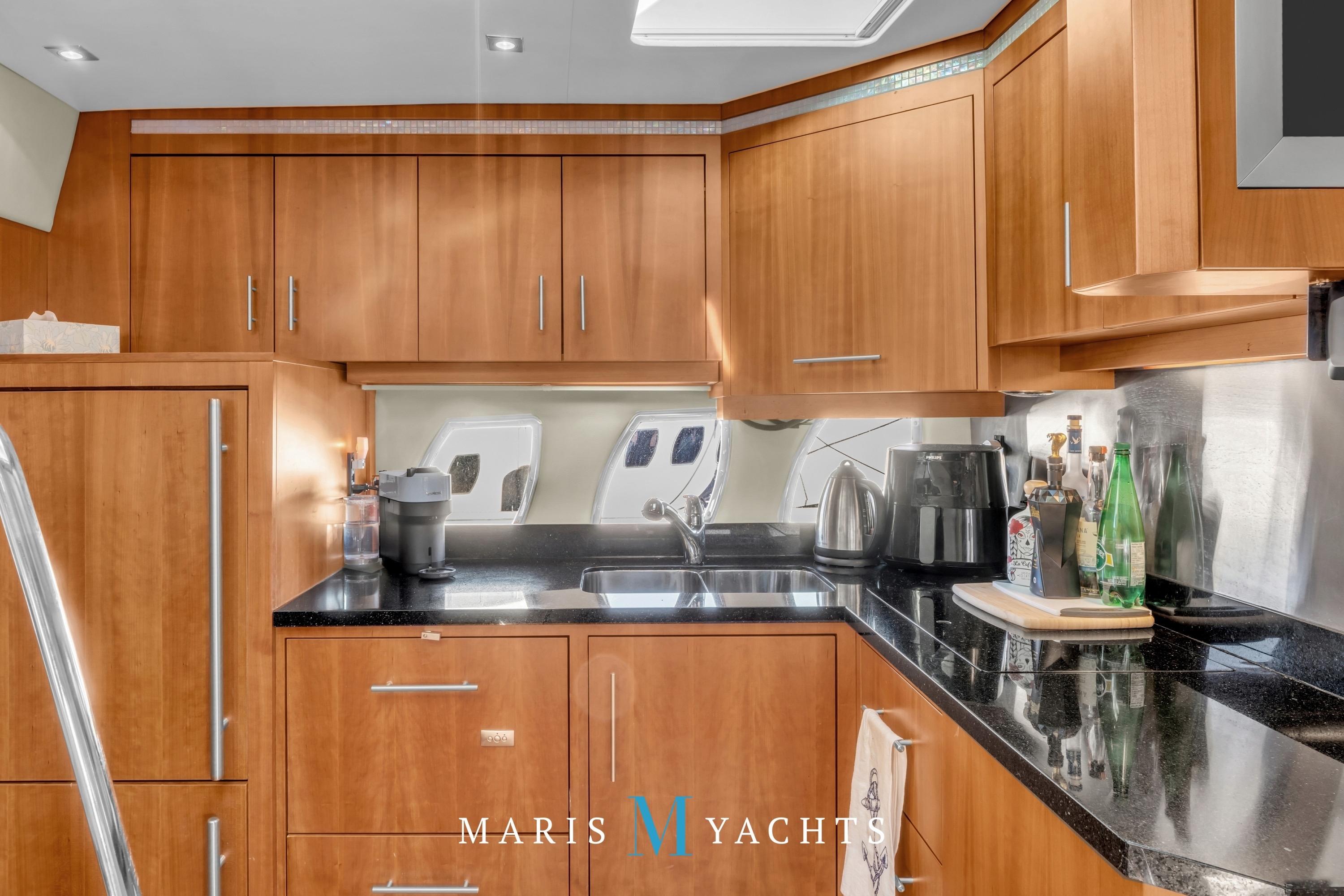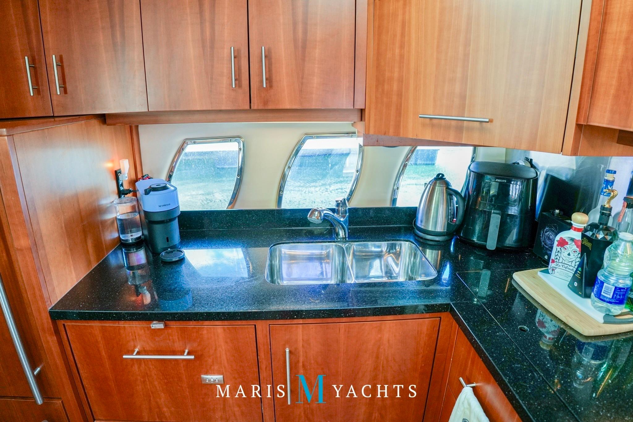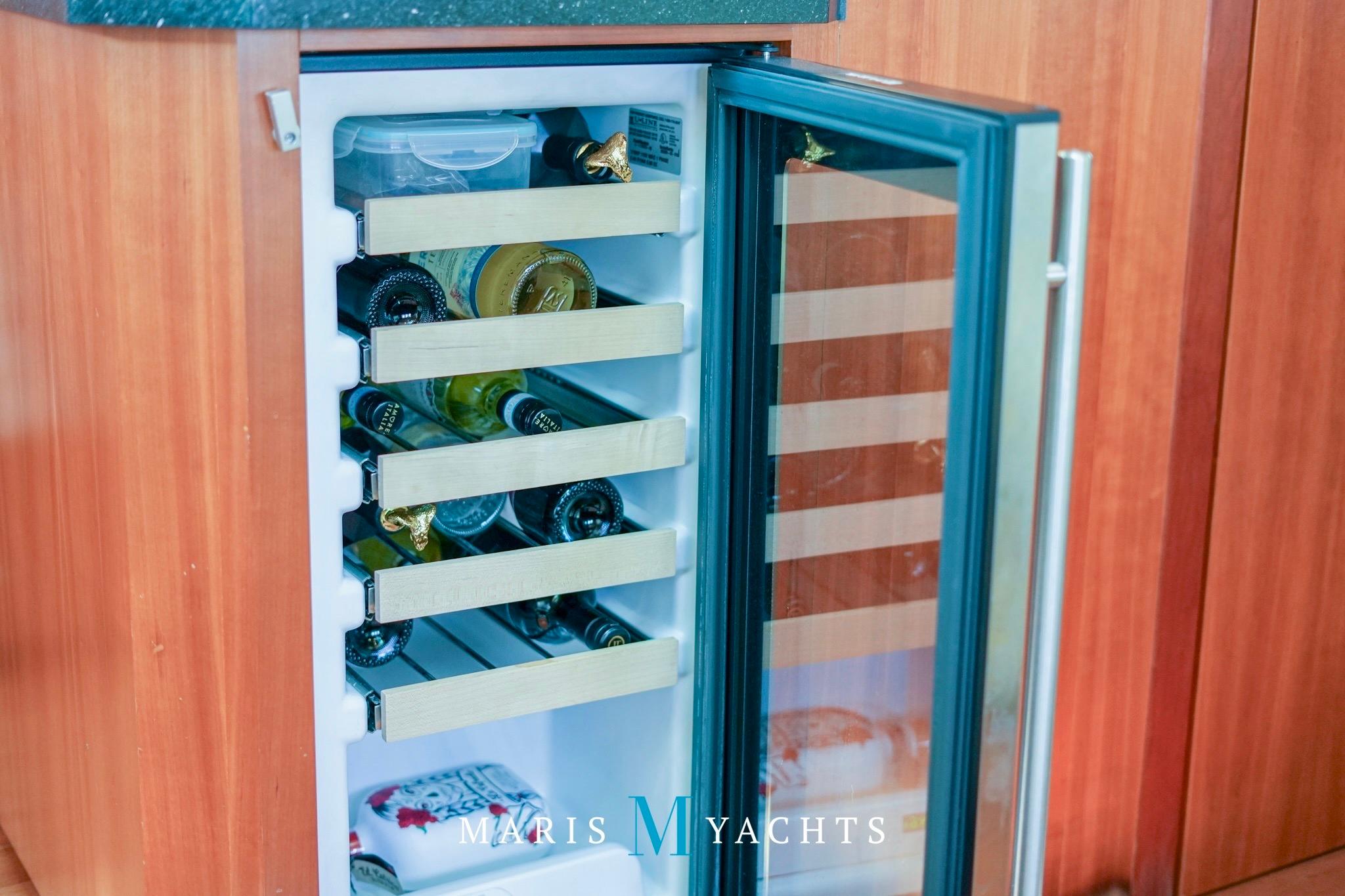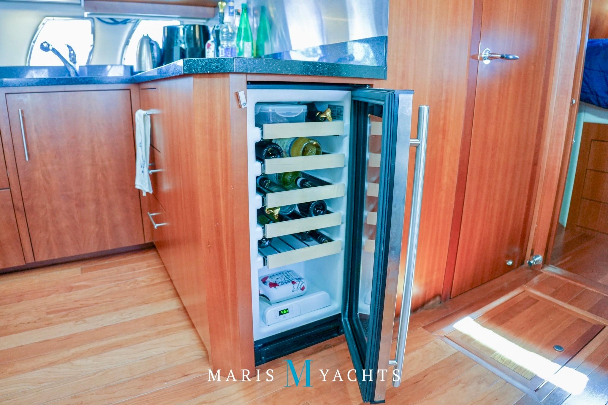 To port, the galley is fully equipped for extended cruising. It features quartz countertops, a double stainless-steel sink, Fisher & Paykel dishwasher, Kenyon two-burner electric cooktop, Tappan convection microwave, Nova-Kool full-height fridge/freezer, and a dedicated wine fridge.