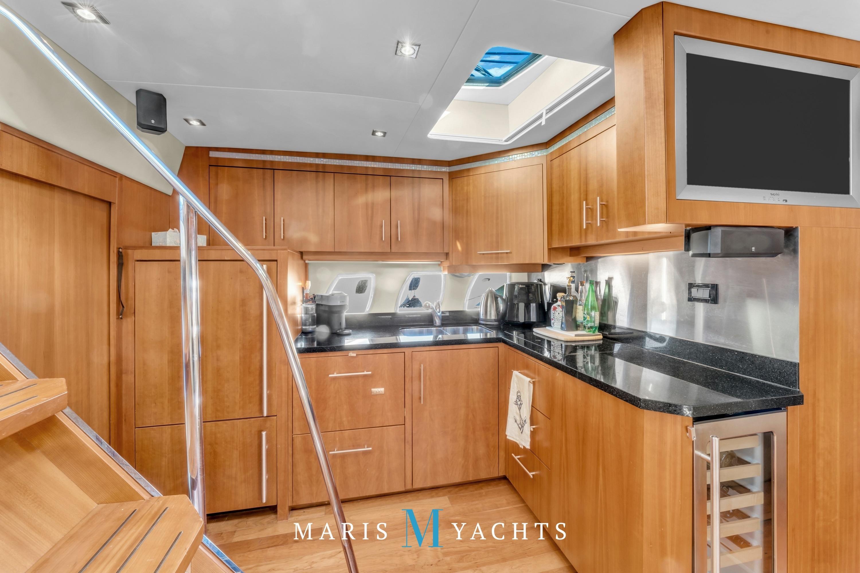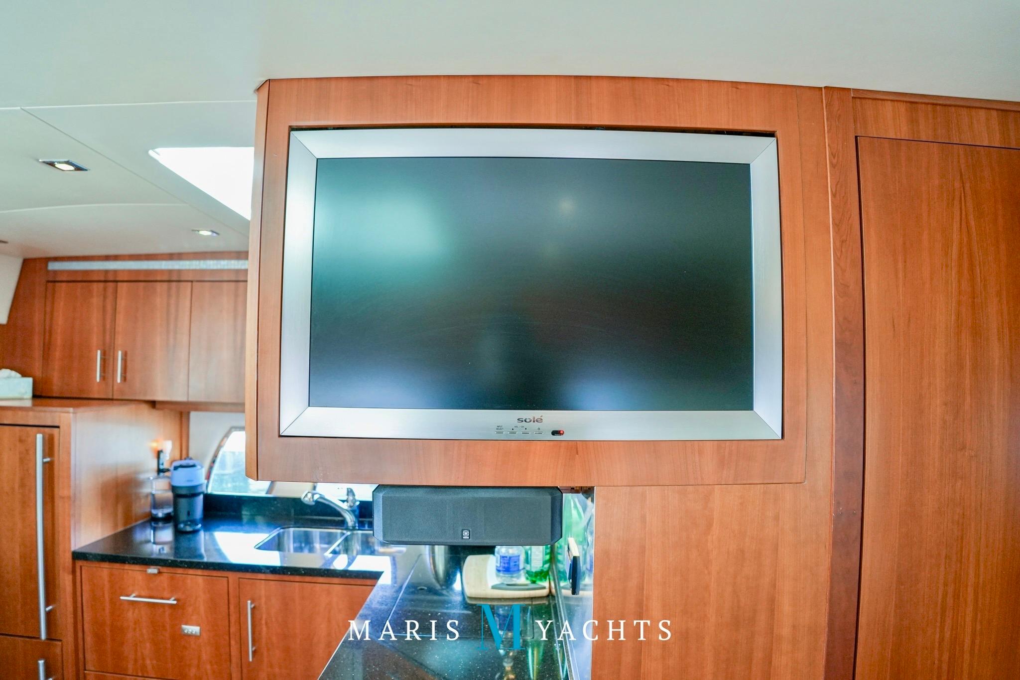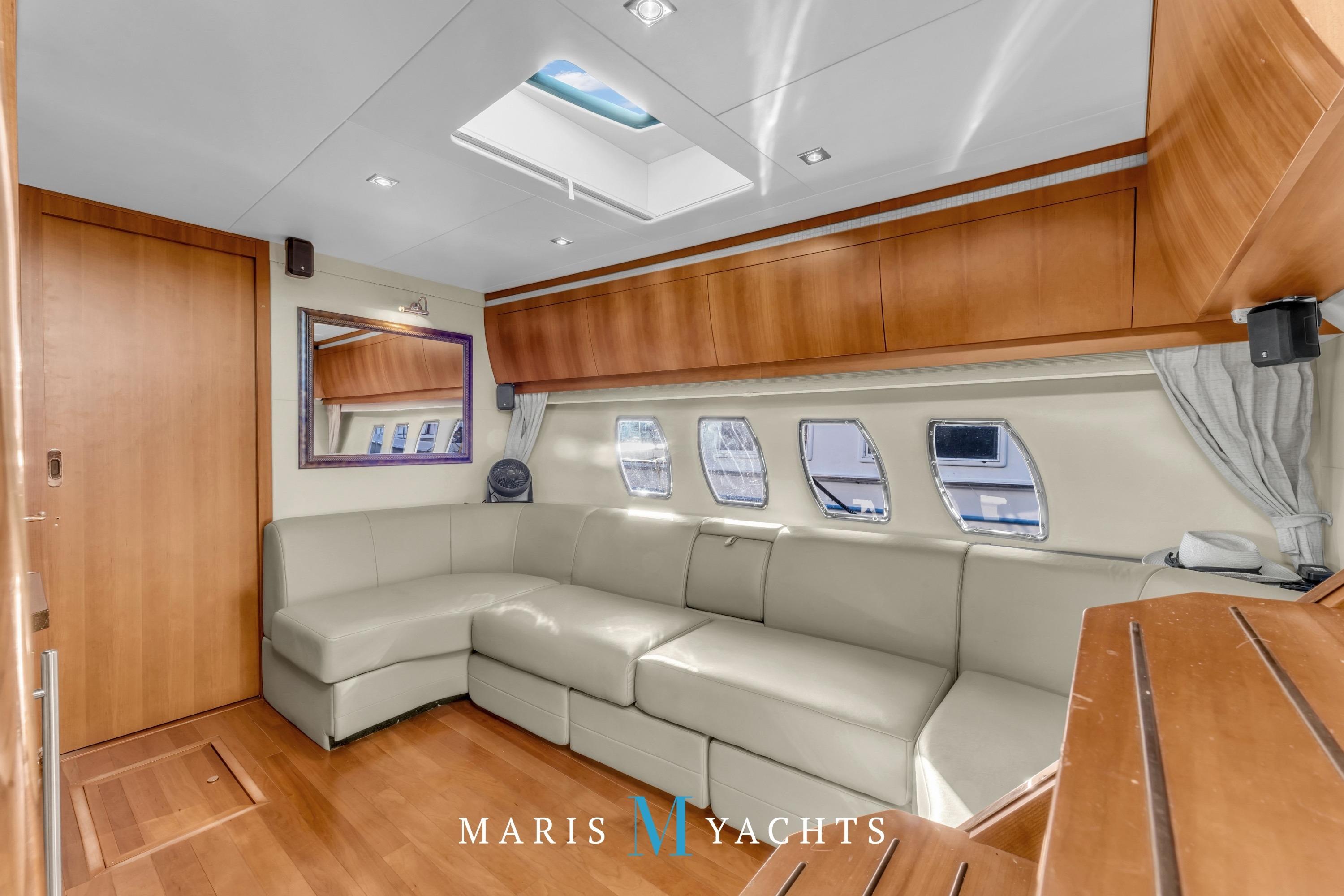 Opposite, along the starboard side, the salon settee offers plush seating and a perfect view of the flat-screen TV. The open layout allows for easy conversation between guests and the galley, making this space both functional and sociable. Recessed LED lighting, climate control, and a built-in central vacuum system complete the comfort and convenience.