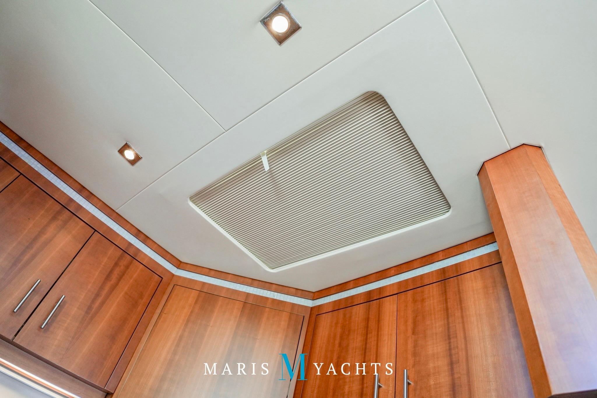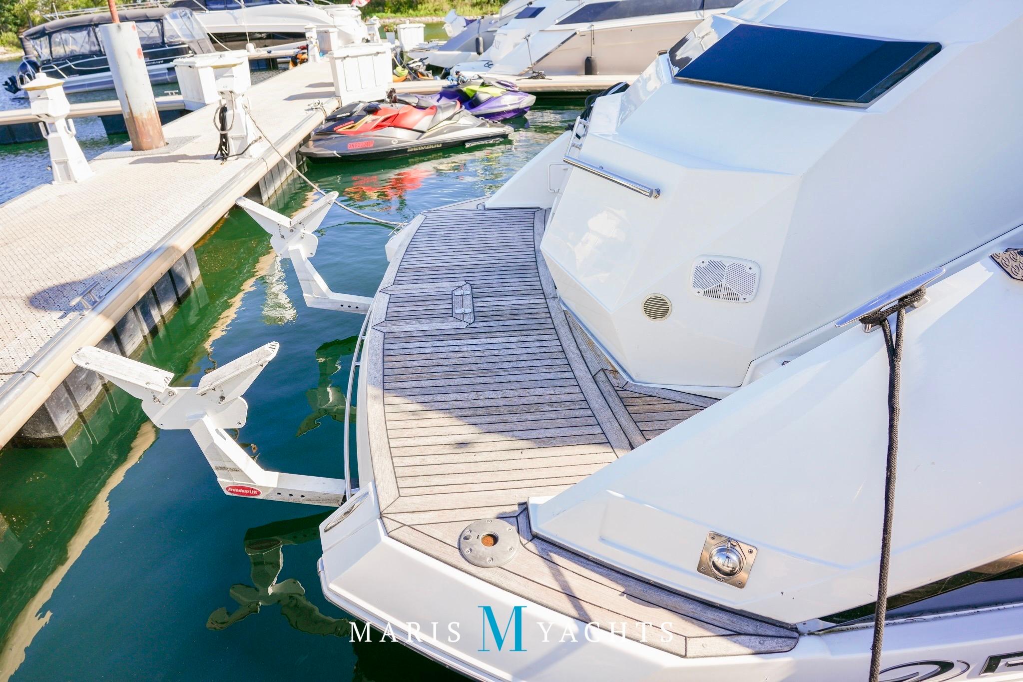 Boarding is effortless from the extended teak swim platform, which is wide, stable, and perfect for lounging or launching water toys. Beneath the platform lies a hydraulic Freedom Lift system, capable of carrying a personal watercraft or tender — operated by the touch of a button.