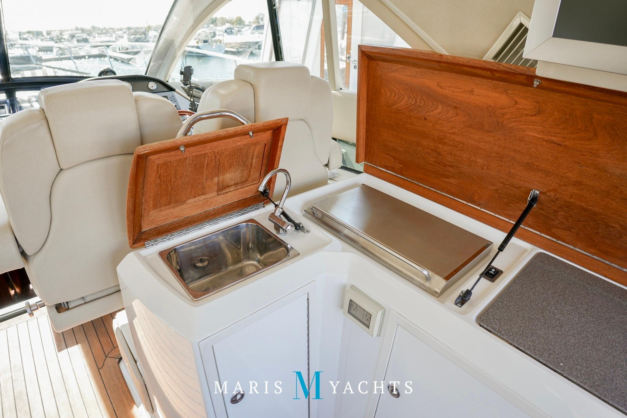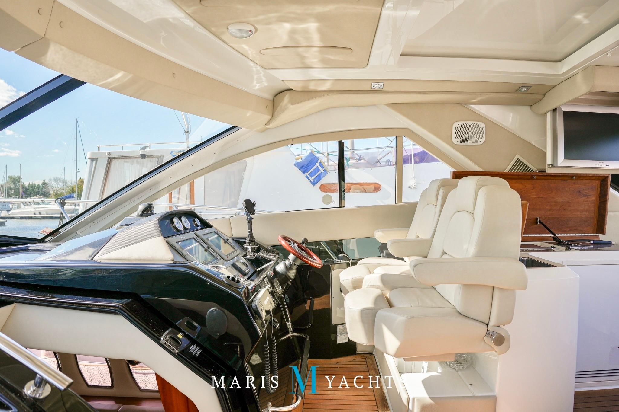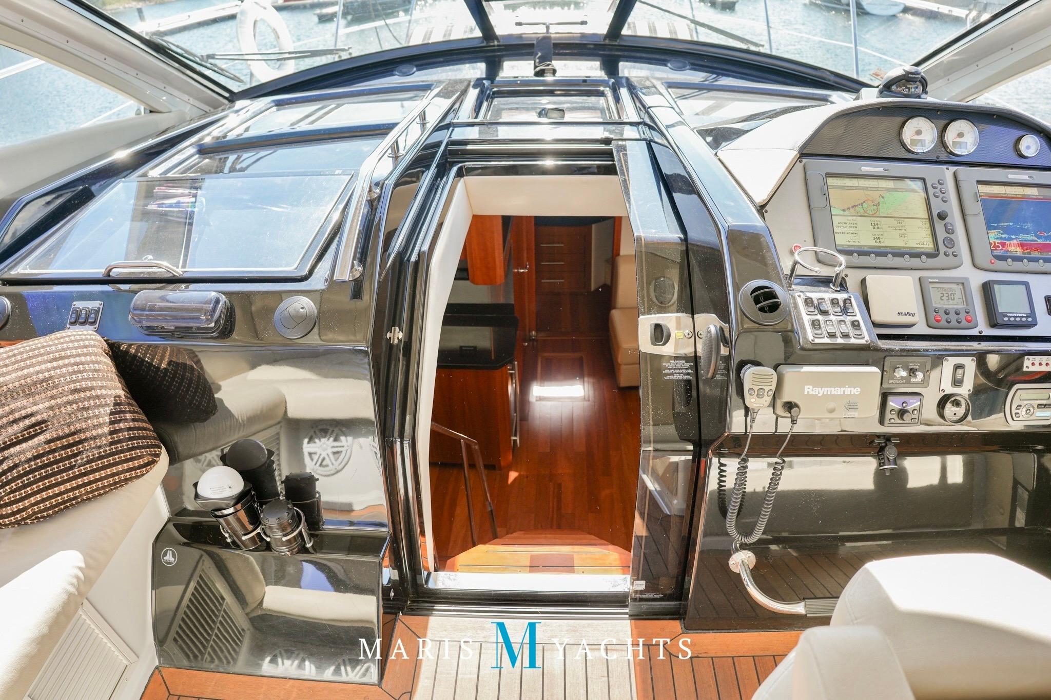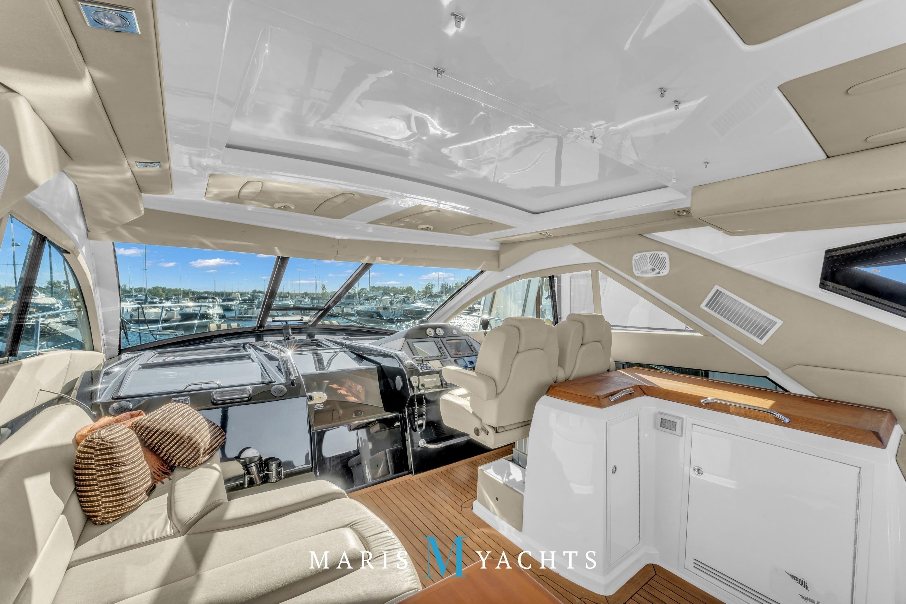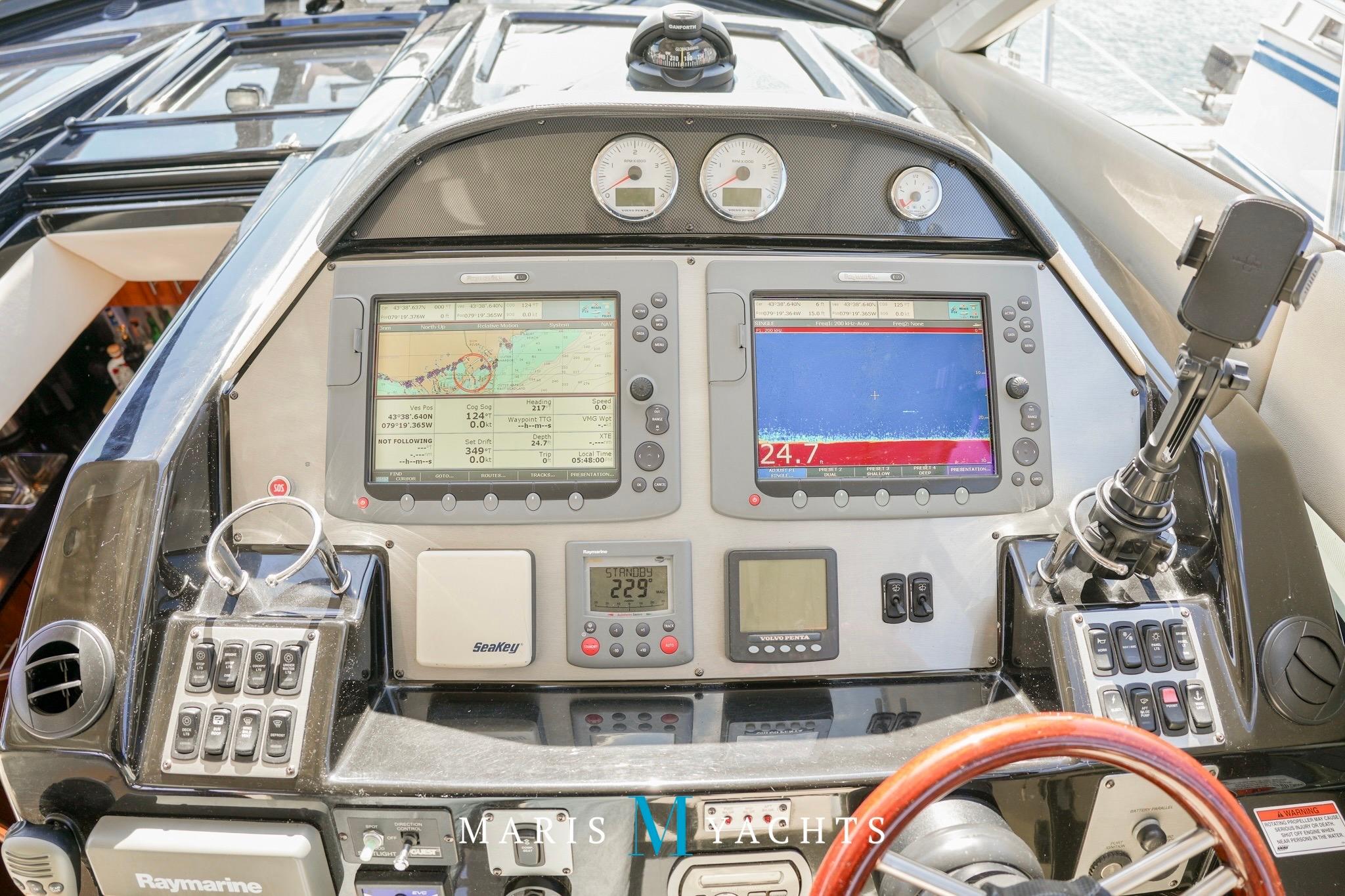 The helm station forward and to starboard offers commanding views through large, wraparound frameless glass windows with power adjustable captain and companion seats. It’s equipped with dual Raymarine E120 displays with rear view camera system, Volvo IPS joystick control, autopilot, radar and a digital Volvo engine management system, VHF with interior remote and Raymarine satellite dome.
