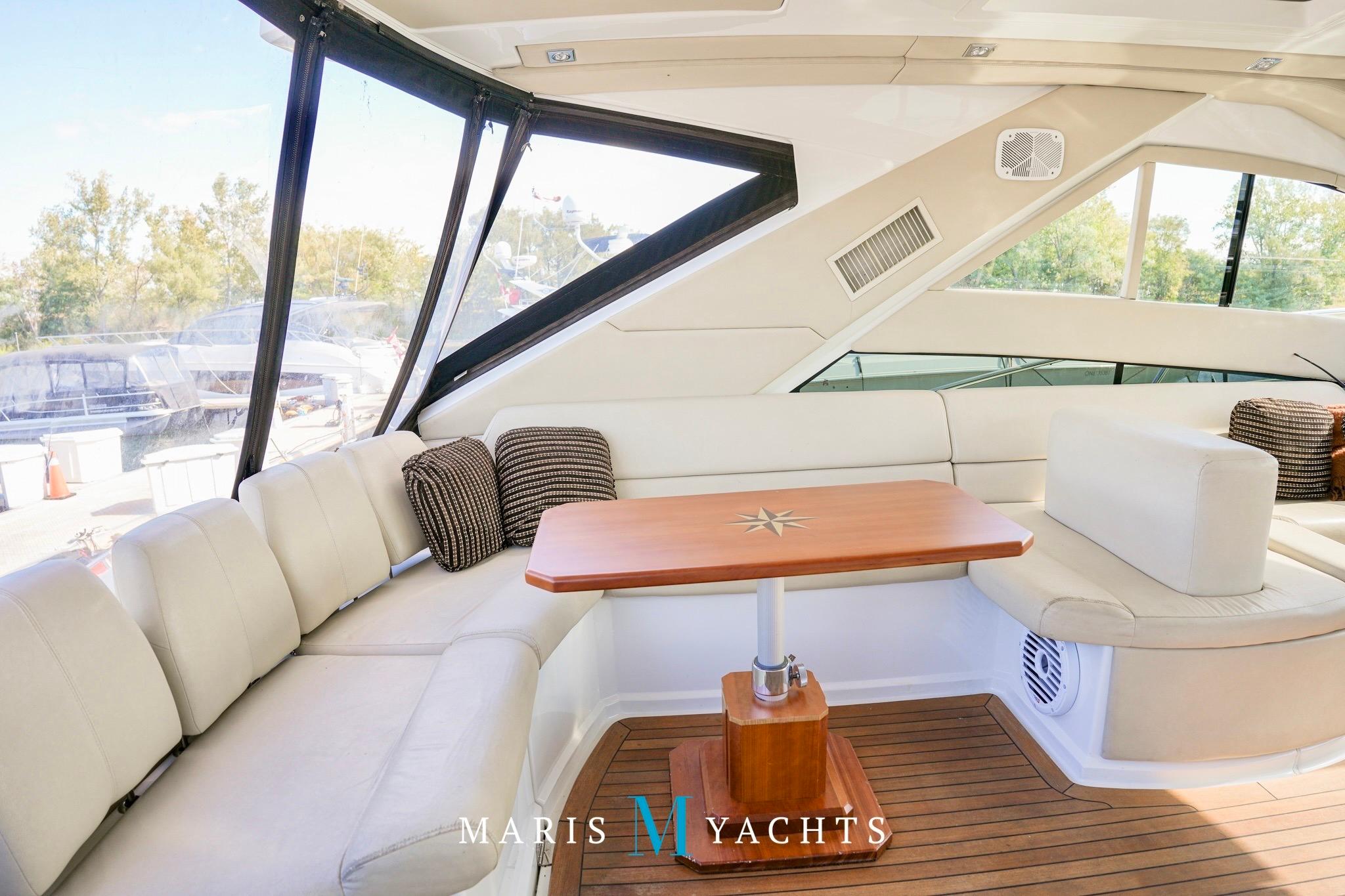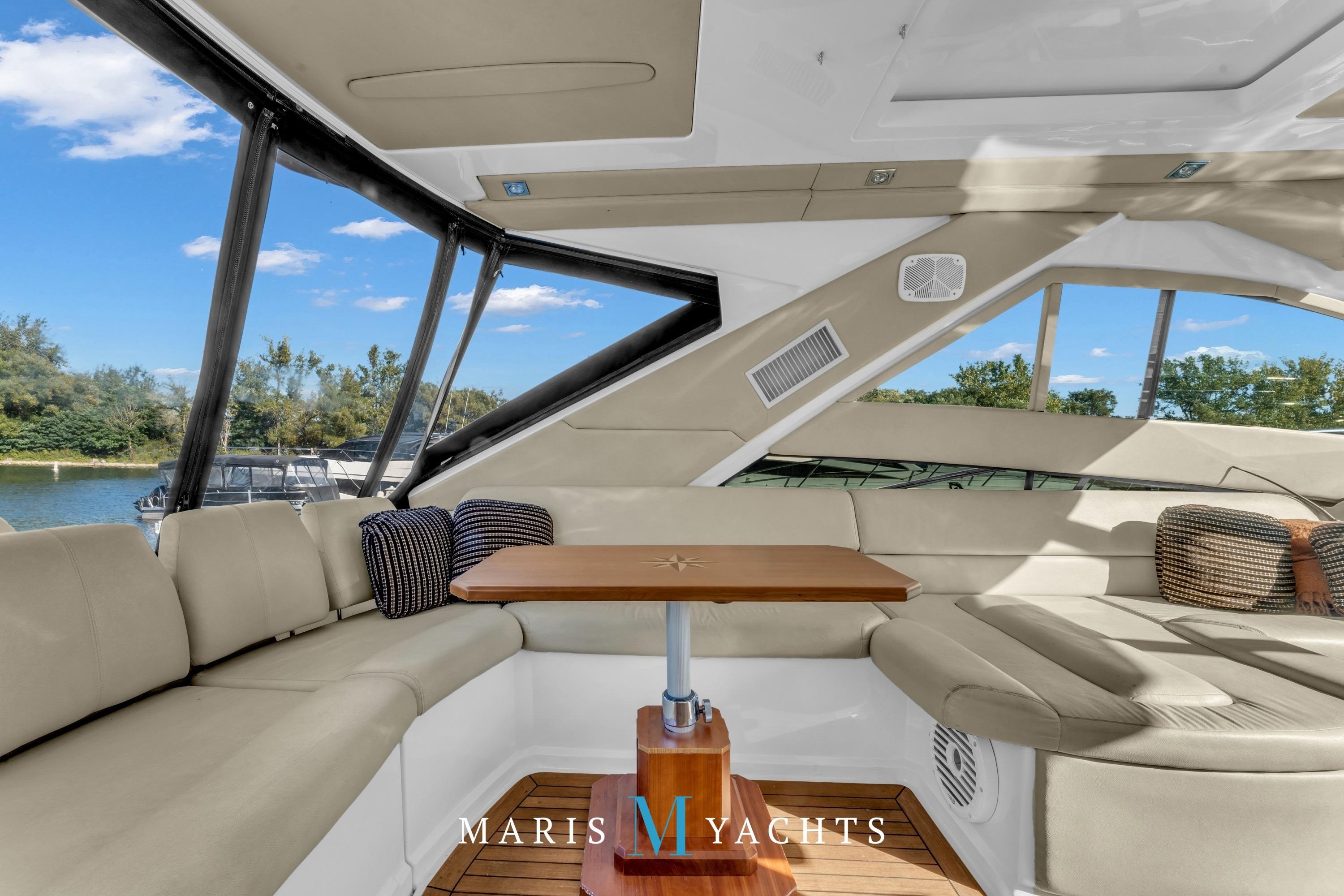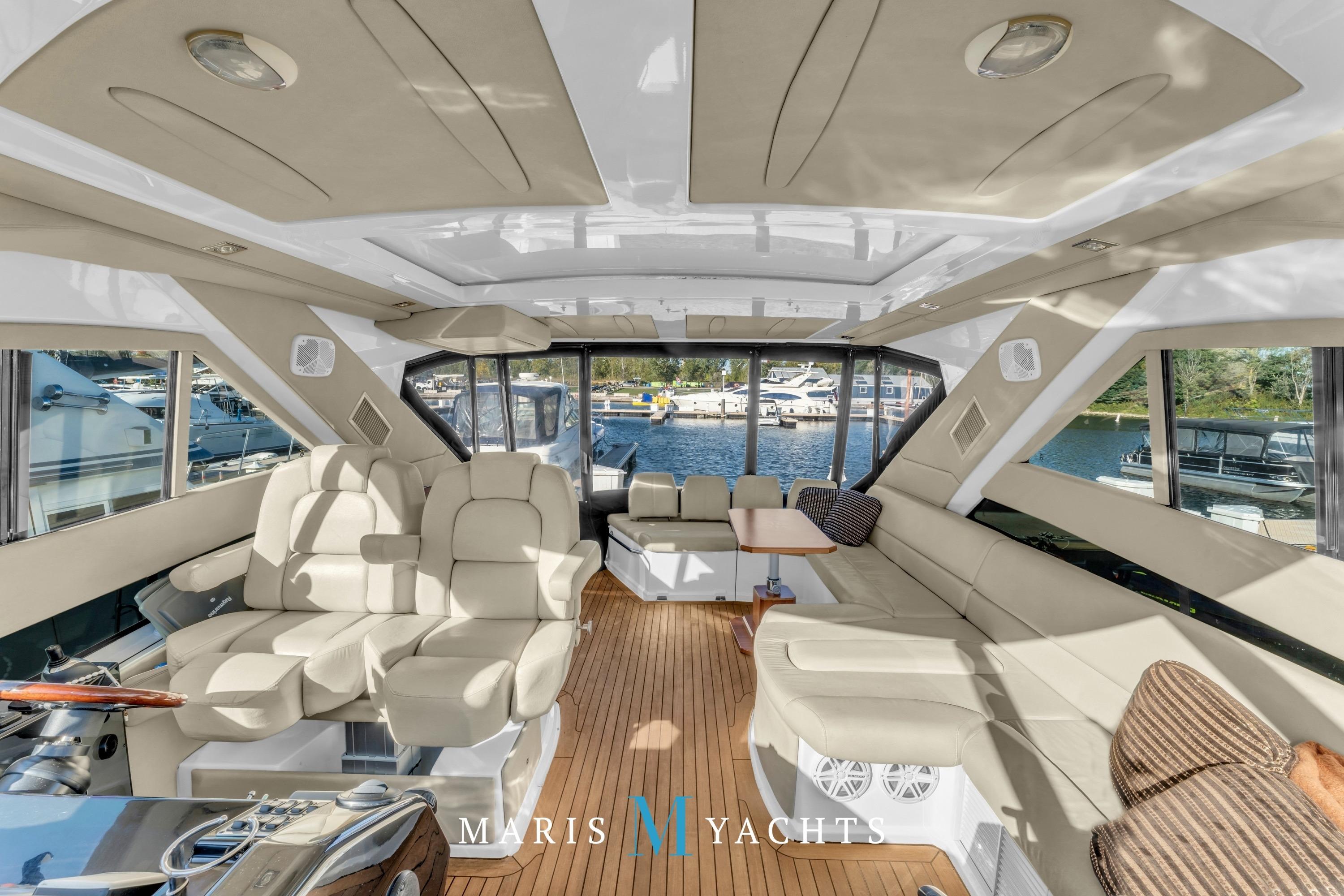 Moving up from the platform, you enter a beautifully designed climate-controlled cockpit/entertainment area, fully enclosed by a hardtop and canvas system for year-round comfort. Overhead, a large electric sunroof opens to bring in sunshine and fresh air, while the air-conditioning and heat system keeps the space comfortable in all conditions. To starboard, a fully equipped wet bar features a grill, refrigerator, and drop down TV, while a U-shaped lounge aft provides ample seating around a mobile table — perfect for dining or cocktails.