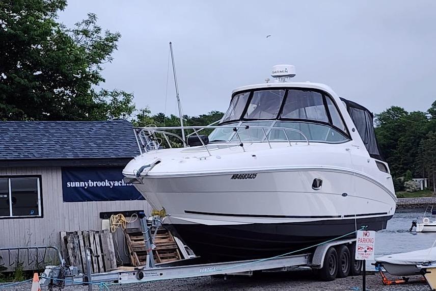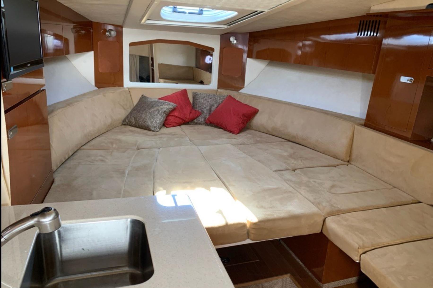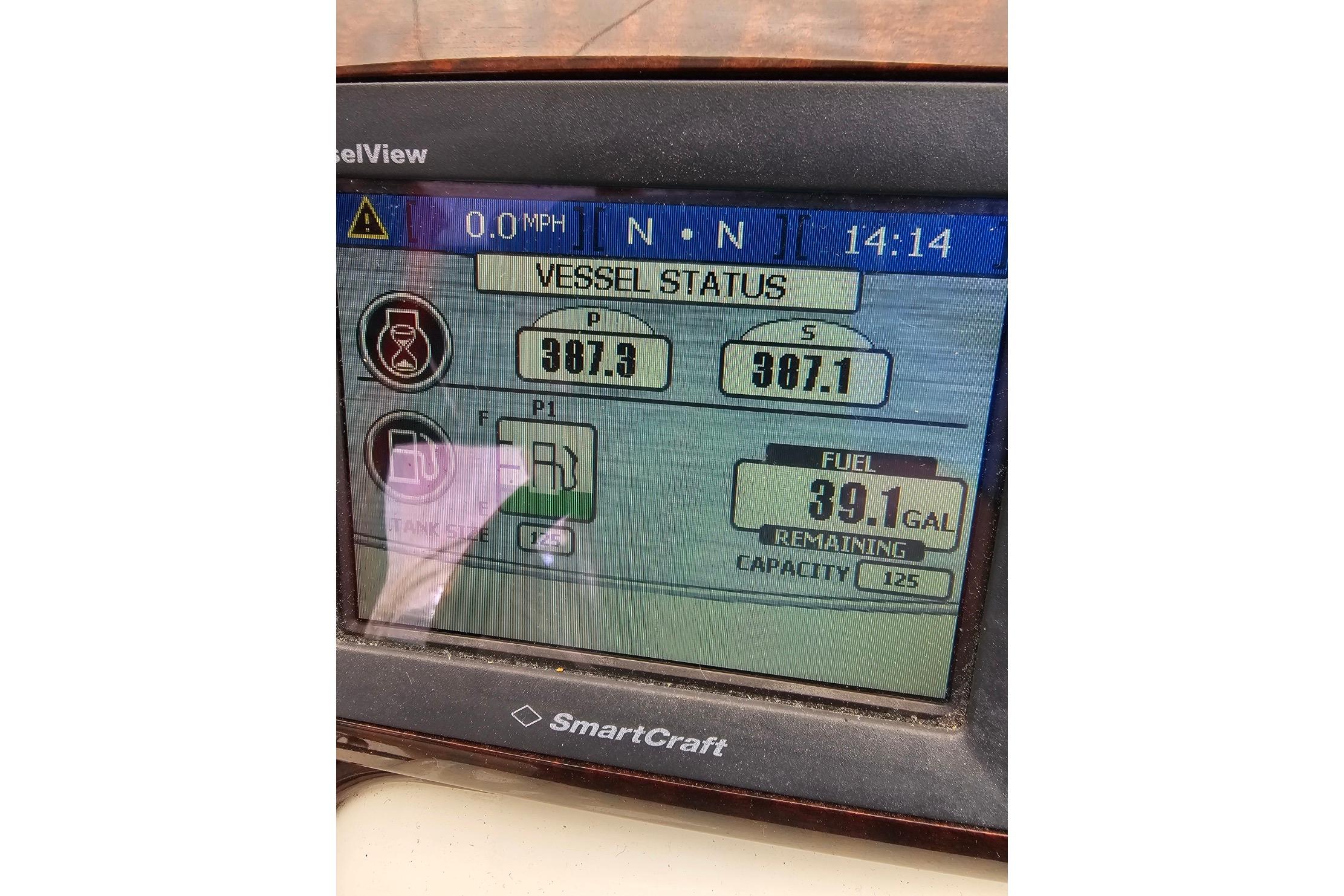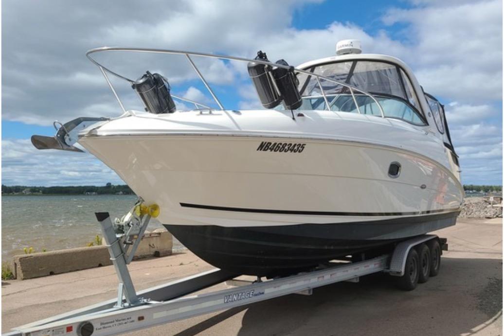 Twin 2011 Mercruiser 300hp inboard fresh water cooled gas engines (387 hours at time of listing); cruising speed 22 knots; maximum speed 30 knots; 125 gallon fuel capacity in a stainless steel tank; fixed propellers; oil/water/temp alarm; bilge blower; fume detector; trim tabs; synchronizer; Axius Intuitive joystick controls (Bravo III outdrives).
