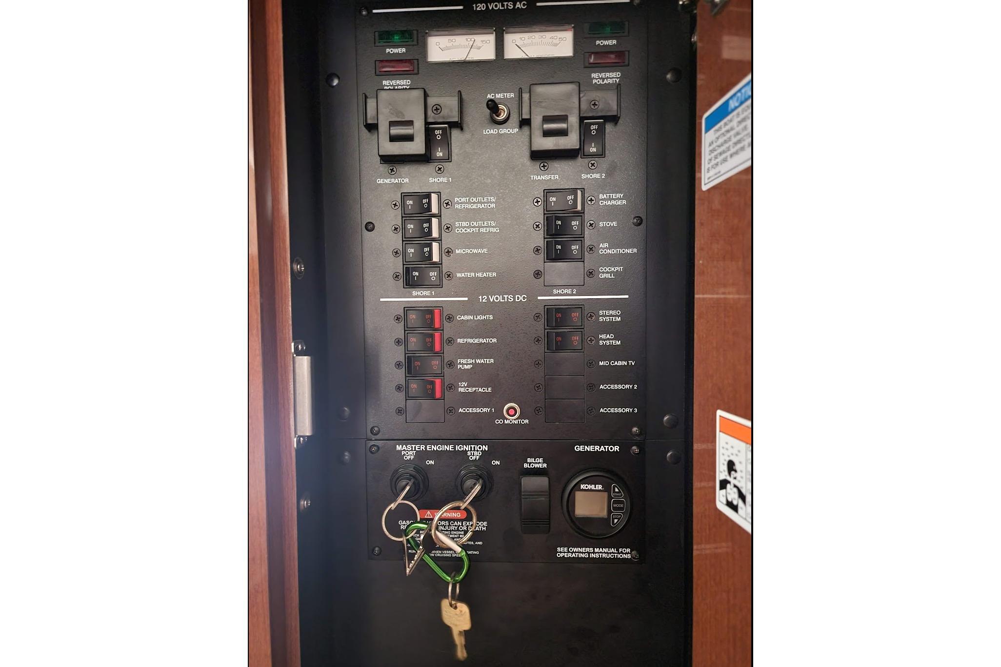 The electrical system is maintained by three batteries; 5kw Kohler generator; battery charger; 12/110 volt electrical panel; circuit breakers; 110 volt shore power w/cord.