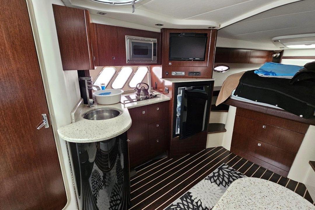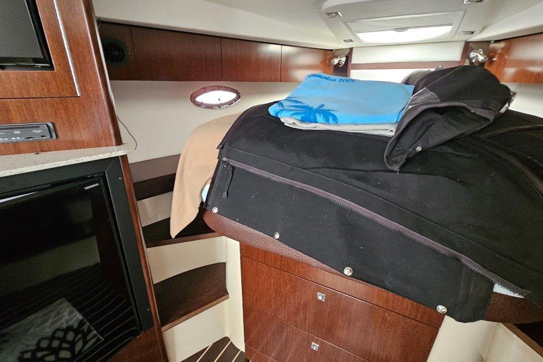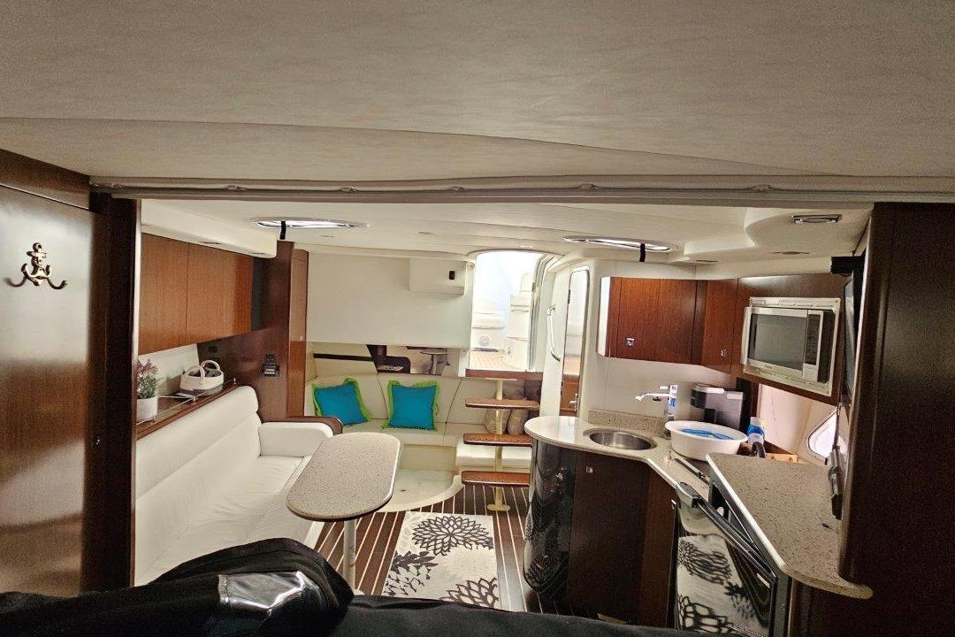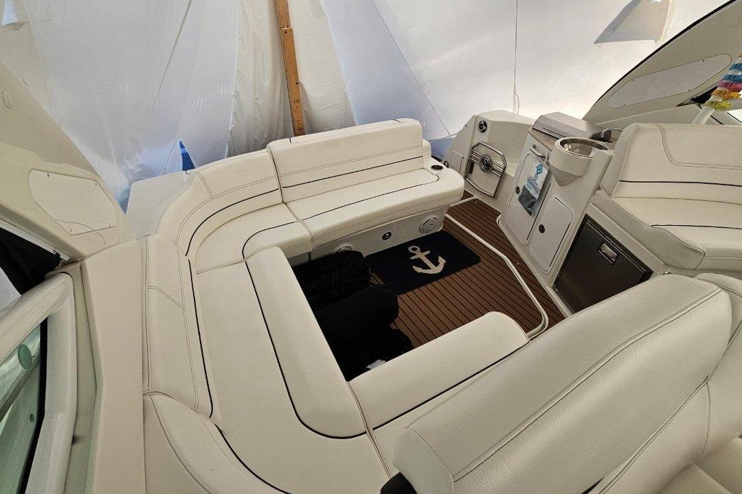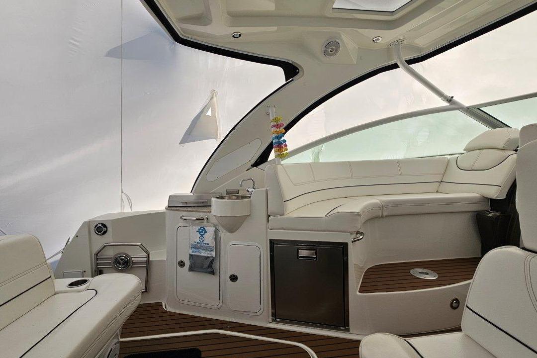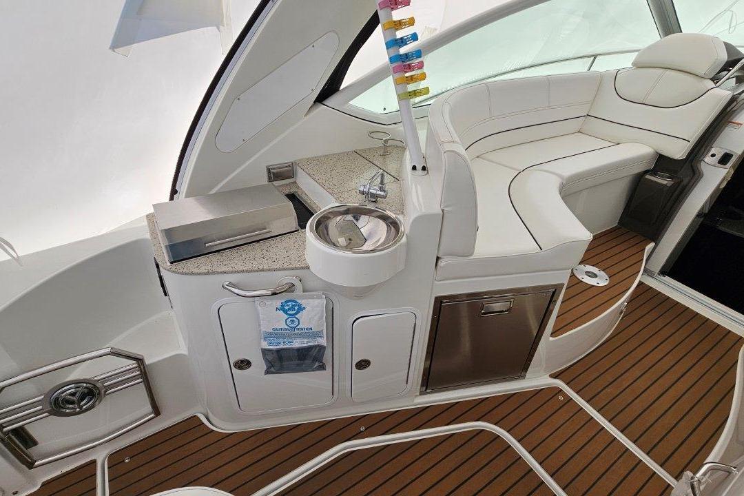Cruisers Yachts continues to offer innovative boats with cutting-edge styling and luxury-class features. This richly appointed family cruiser is agile, roomy, and extremely well finished. As one expects in a boat this size, the feature list is long. Her impressively stylish, full-width salon includes a spacious galley with solid surface countertop, step up (walkaround) forward berth , and a U-shaped rear lounge that easily converts into a double berth for guests. The head has a separate shower stall and features a countertop with Venetian-style tile backsplash. Note the built-in entertainment center and space-saving rectangular dinette. The Cruiser’s roomy, guest-friendly cockpit includes a double-wide helm seat, portside chaise lounge, and rear settee. The integrated fiberglass hardtop is amazing and has built in skylights!