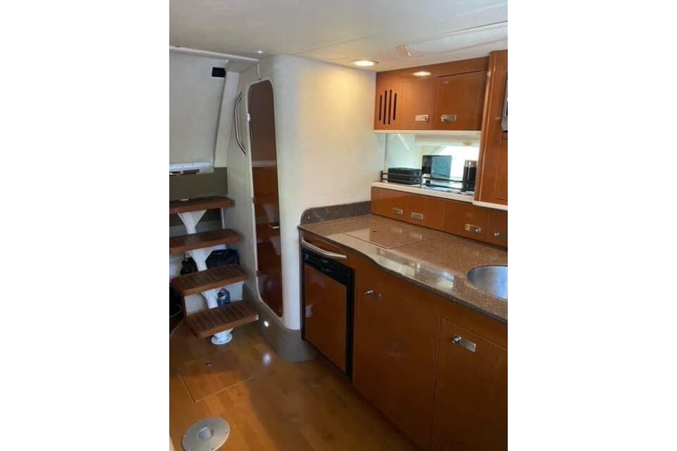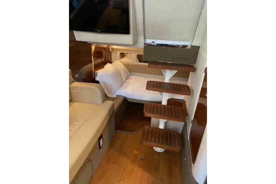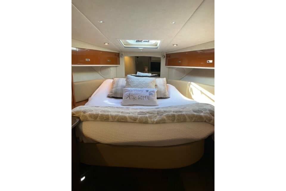 With the 350 Sundancer, four oversized hull windows contribute to enhanced interior visibility and ambient light. There is a clever aft-facing transom seat, optional cockpit barbecue and flatscreen TV, and an electrically adjustable forward berth. A plunging sheer line and contoured fiberglass sport spoiler are sure to grab attention wherever you go. Choose your preferred power from gas or diesel sterndrives, or gas inboards.