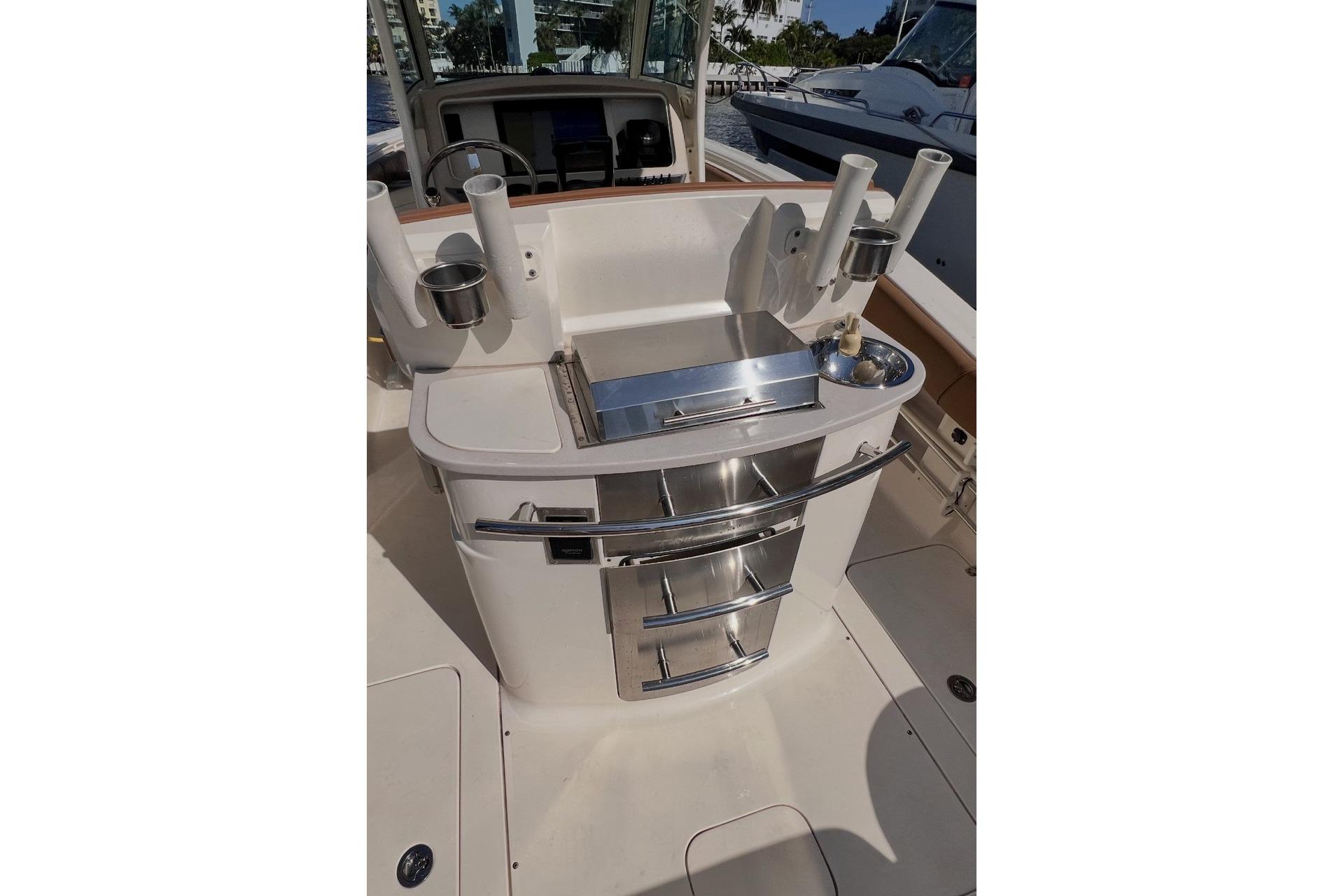 The Scout 275 LXF boat does not come with a BBQ grill as standard equipment; it is an optional feature. The specific optional grill offered by the manufacturer for this model is a Kenyon electric grill. This grill allows users to cook on the water without needing an open flame or separate fuel source.