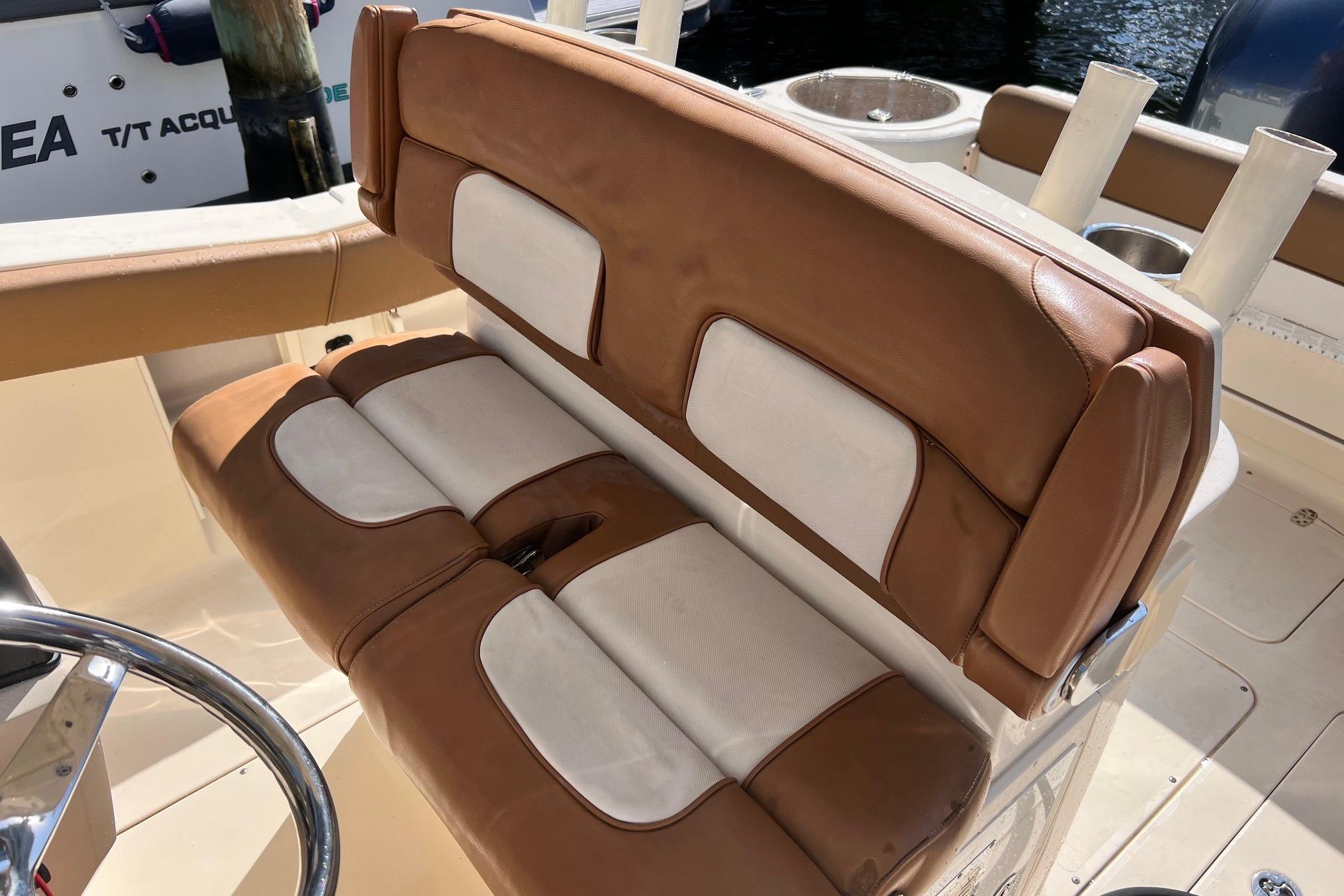 - At Helm, deluxe fiberglass leaning post with cushions companion seats that fold into bolsters