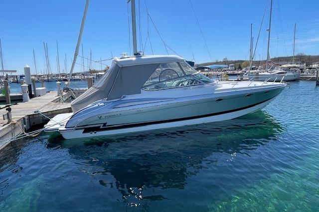 Well optioned 2014 Formula 370 Super Sport powered by a pair of Mercruiser 8.2L MAG High Output stern drive engines (296 Hours) and only run in Fresh Water. She provides an ample amount of power for cruising the Great Lakes, or puttering around the lake for a fun weekend. FAS3TECH hull with the handling and fit-and-finish Formula is known for. Well cared for. Winters spent in heated storage. Second owner, purchased in 2015 with 30 hours. Flagship C Graphic, Black Onyx with Silver Mercruiser Twin 8.2L MAG HO ECT B3X DTS (296 Hours) 7.5KW/120V Kohler Low-CO Gas Generator W/ Battery (27 Hours) STD Outdrive B3X 2:1 Axius/DTS/Smartcraft Vesselview Shorepower 110V Vacuum Head W/Tank/Pumpout Bow Docking Lights Underwater lighting Sport Hardtop Cockpit Cover Sureshade Automatic Retractable Shade Aft Built In WalVac Sweeper System Cockpit Tables with Filler Cushions