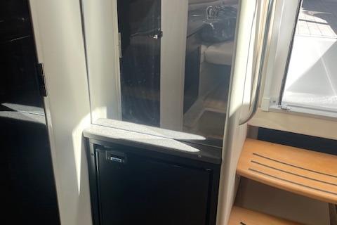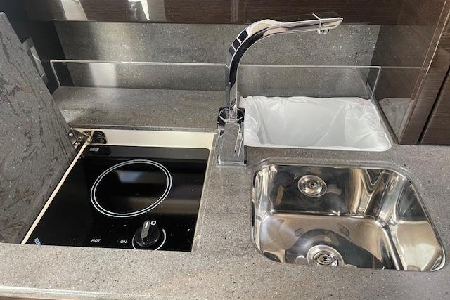 - Complete galley in high-gloss Deep Cherry finish w/storage & hardwood dovetailed drawers, full Corian countertop, 120V/12V polished stainless steel refrigerator, polished stainless steel sink, concealed electric stove w/safety shut-off switch, microwave oven, Krups® 5-speed blender & concealed trash container