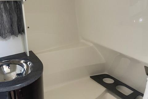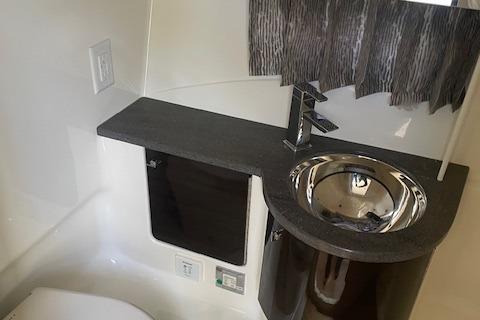 - Molded private head compartment w/vanity, high-gloss Deep Cherry-finish lower doors, Corian countertop, polished stainless steel sink w/swivel faucet, porcelain Flush and Forget® VacuFlush® head unit, 50-gallon holding tank & dockside pumpout, separate shower area w/molded-in seat & exhaust fan