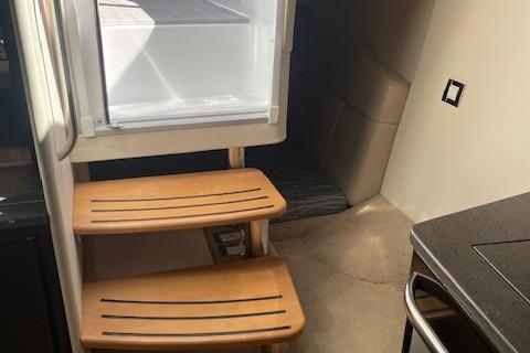 - Molded wetbar w/integrated sink, Corian® countertop, 120V/12V pullout refrigerator w/stainless steel front and beverage racks, 171/2-quart Igloo® cooler, in-counter trash container & 120V GFCI outlet