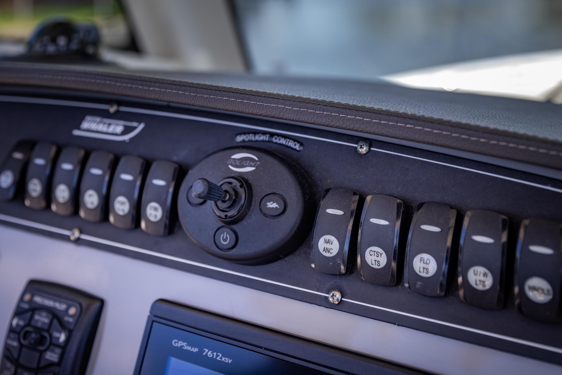 - Electrical distribution / breaker panel with key switches (inside console)