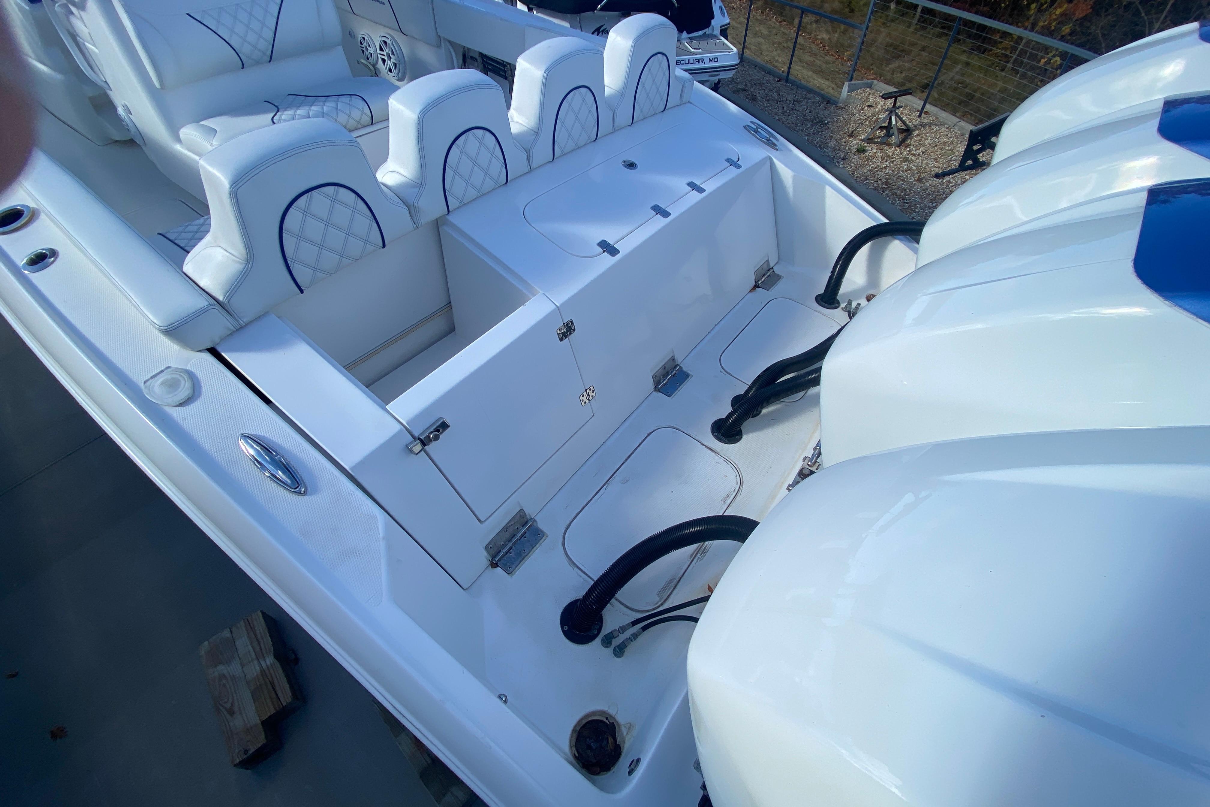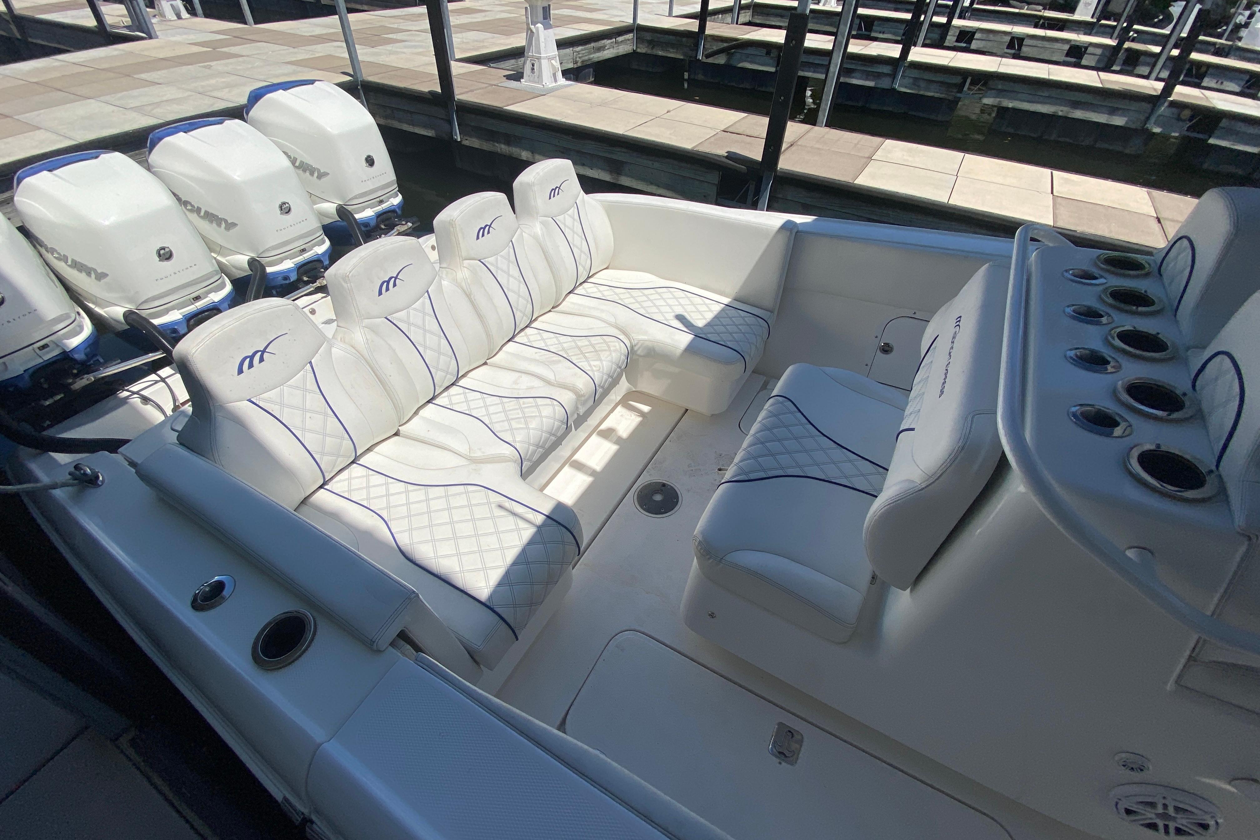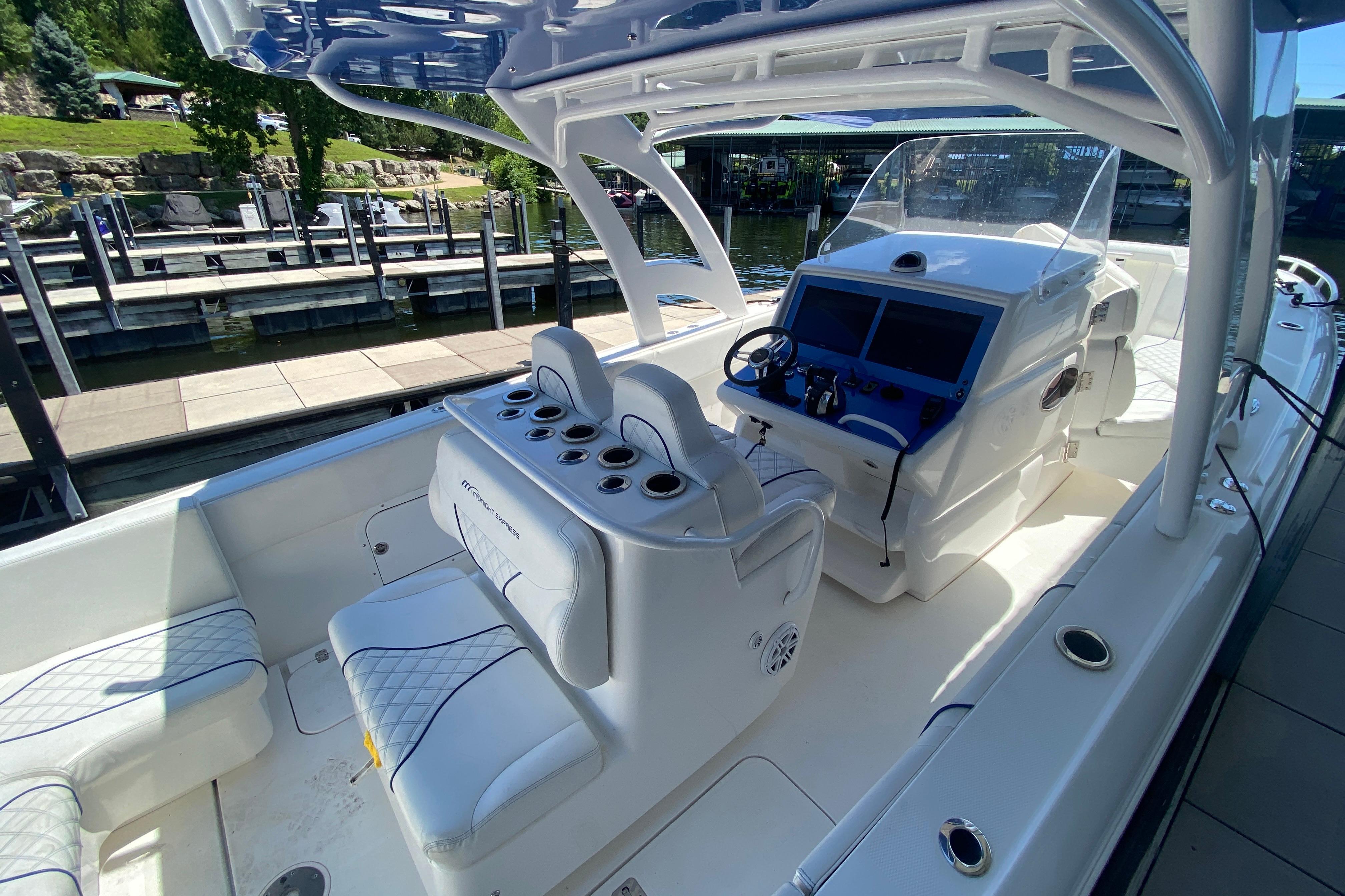 2017 Midnight Express 39 Cuddy, Quad Mercury 350 Verado DTS controls, (700 hull hours – 87 mph – recent compression test) dive door, bow thruster, Smart Craft gauges, Dual Garmin screens, bottom paint, upgraded JL Audio system, windlass anchor, U shaped rear seat with rear facing seat with build in cooler, double bolster helm seat with foot rest, marine head, Fusion head unit, VHF radio, shore power with battery charger, delivery, financing and registration available.