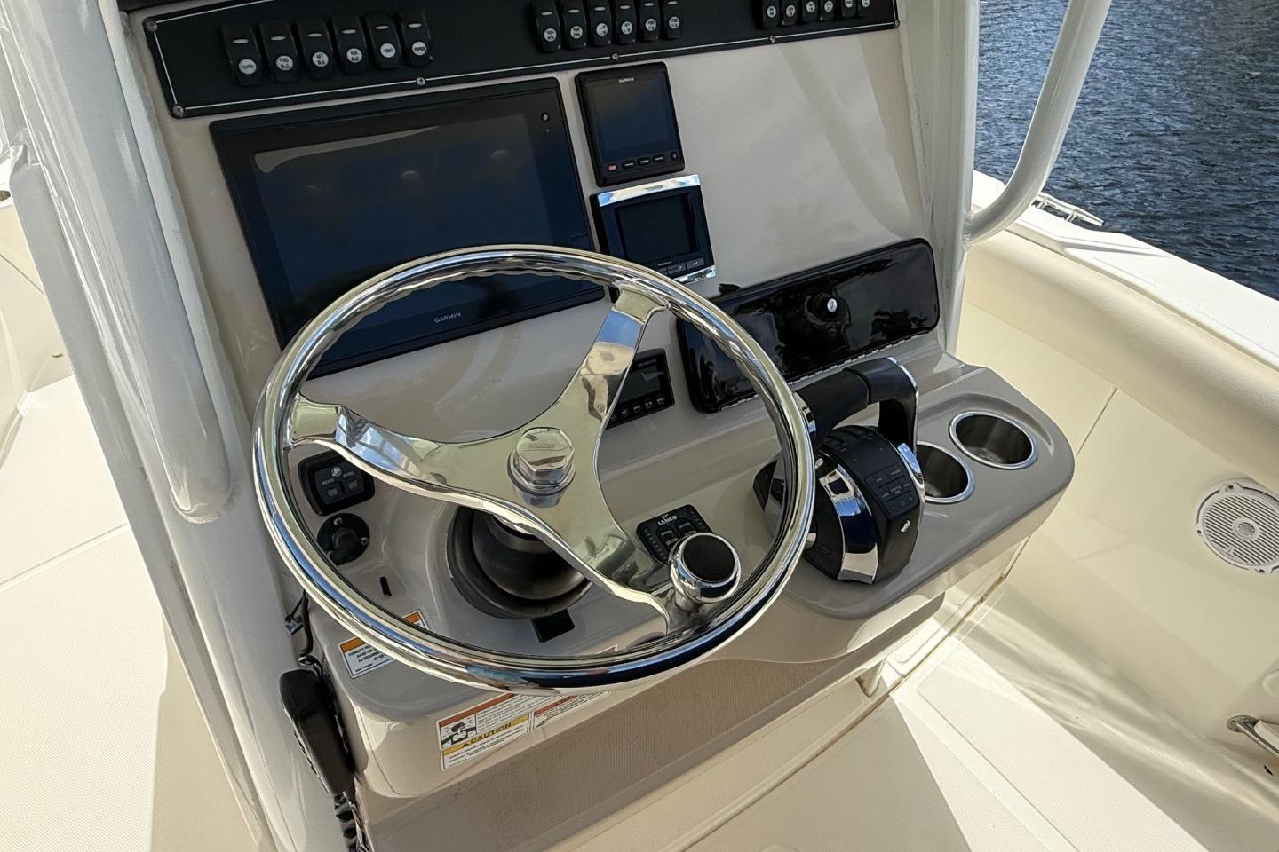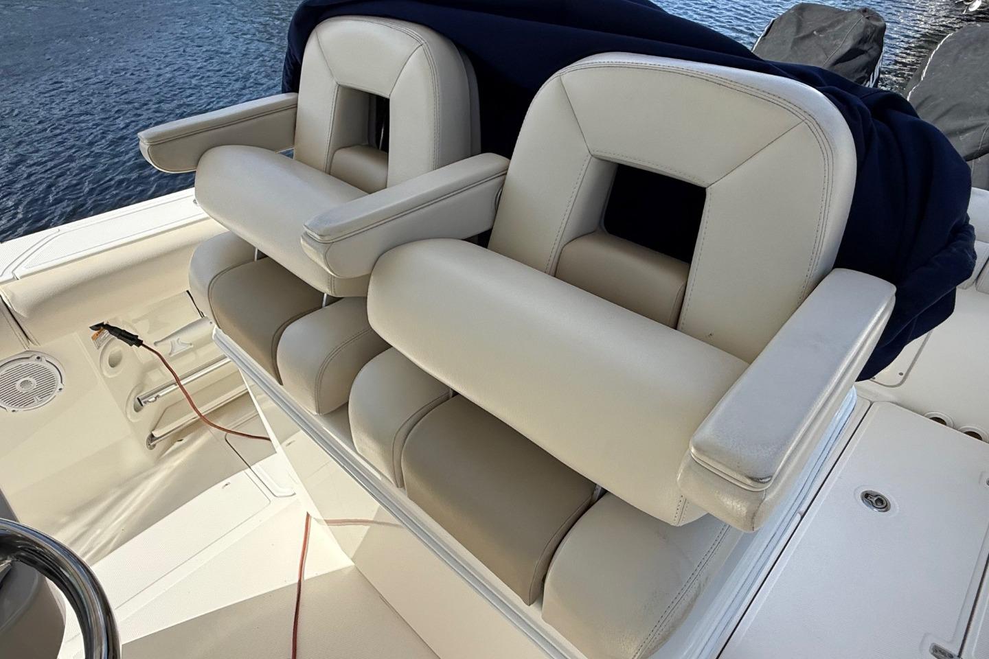 - Deluxe helm seat upgrade provides adjustable captain’s chair and stationary companion seat.
