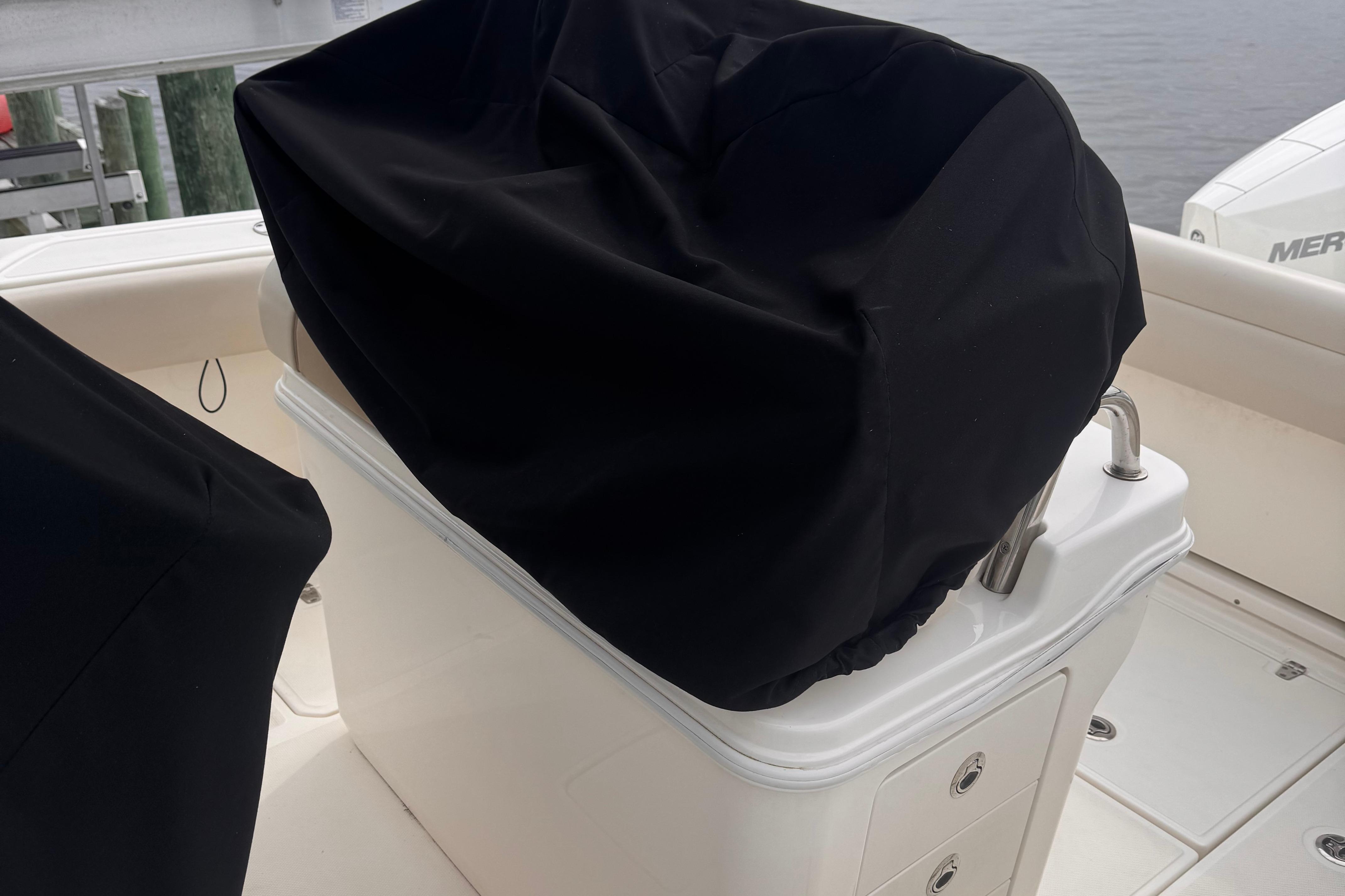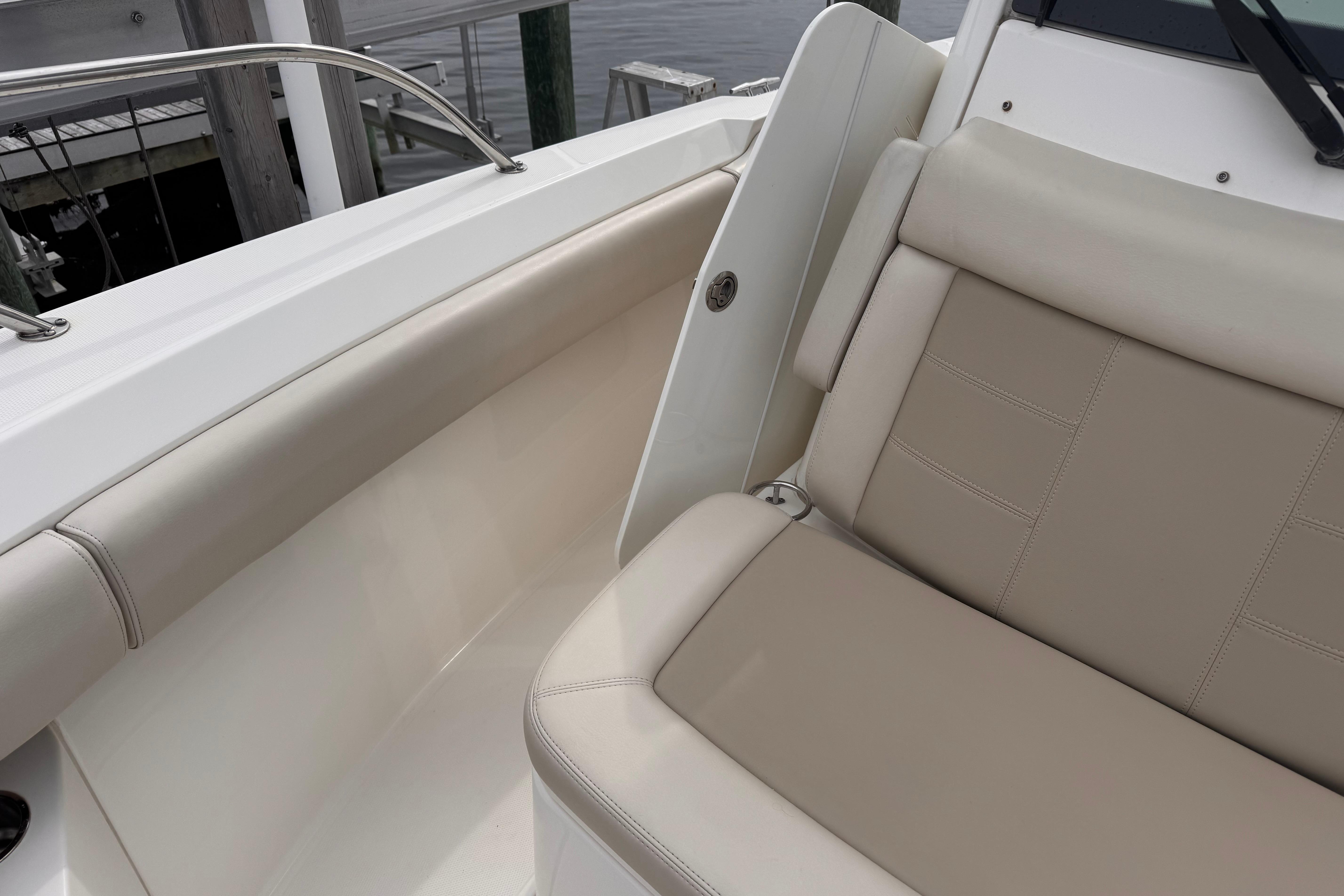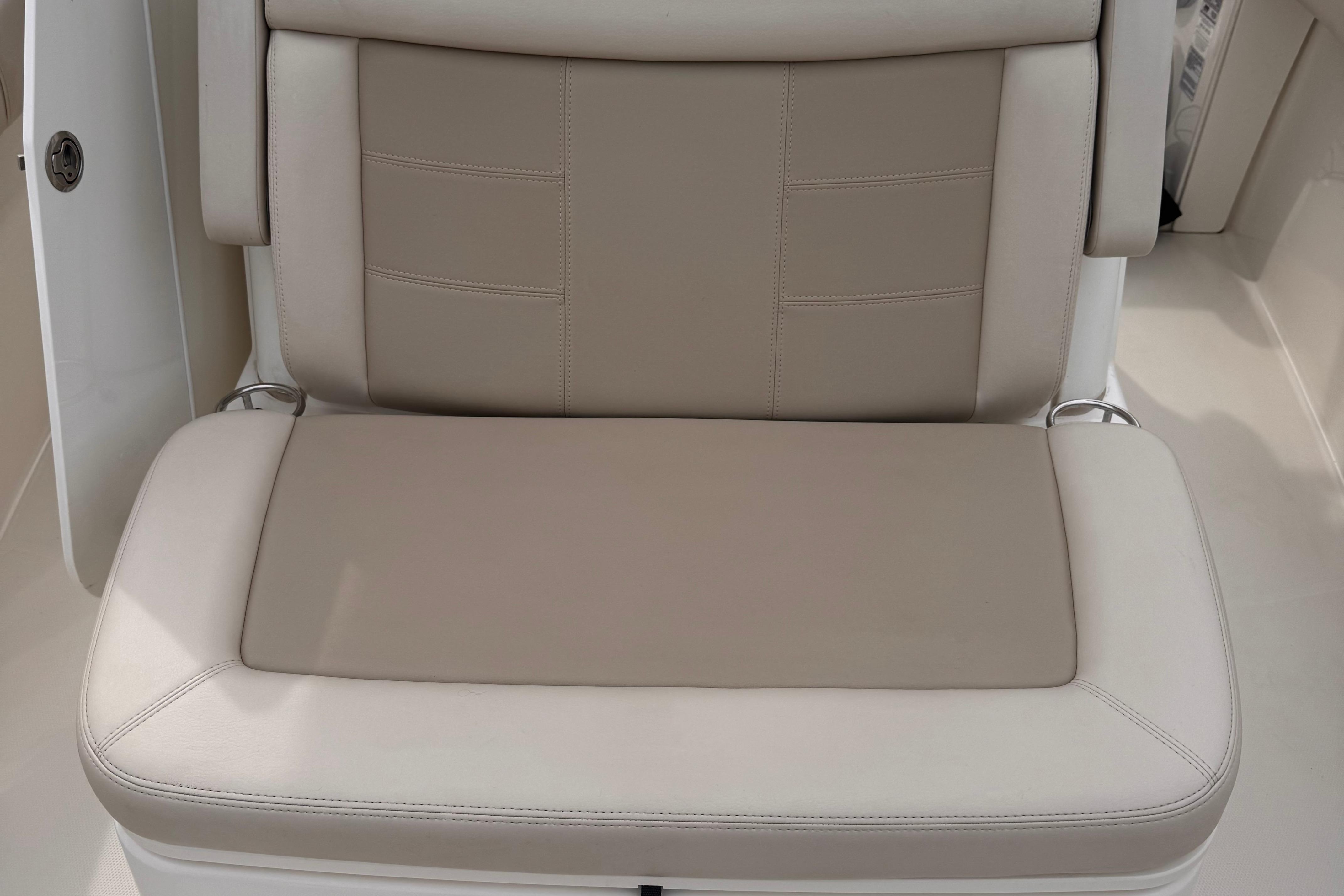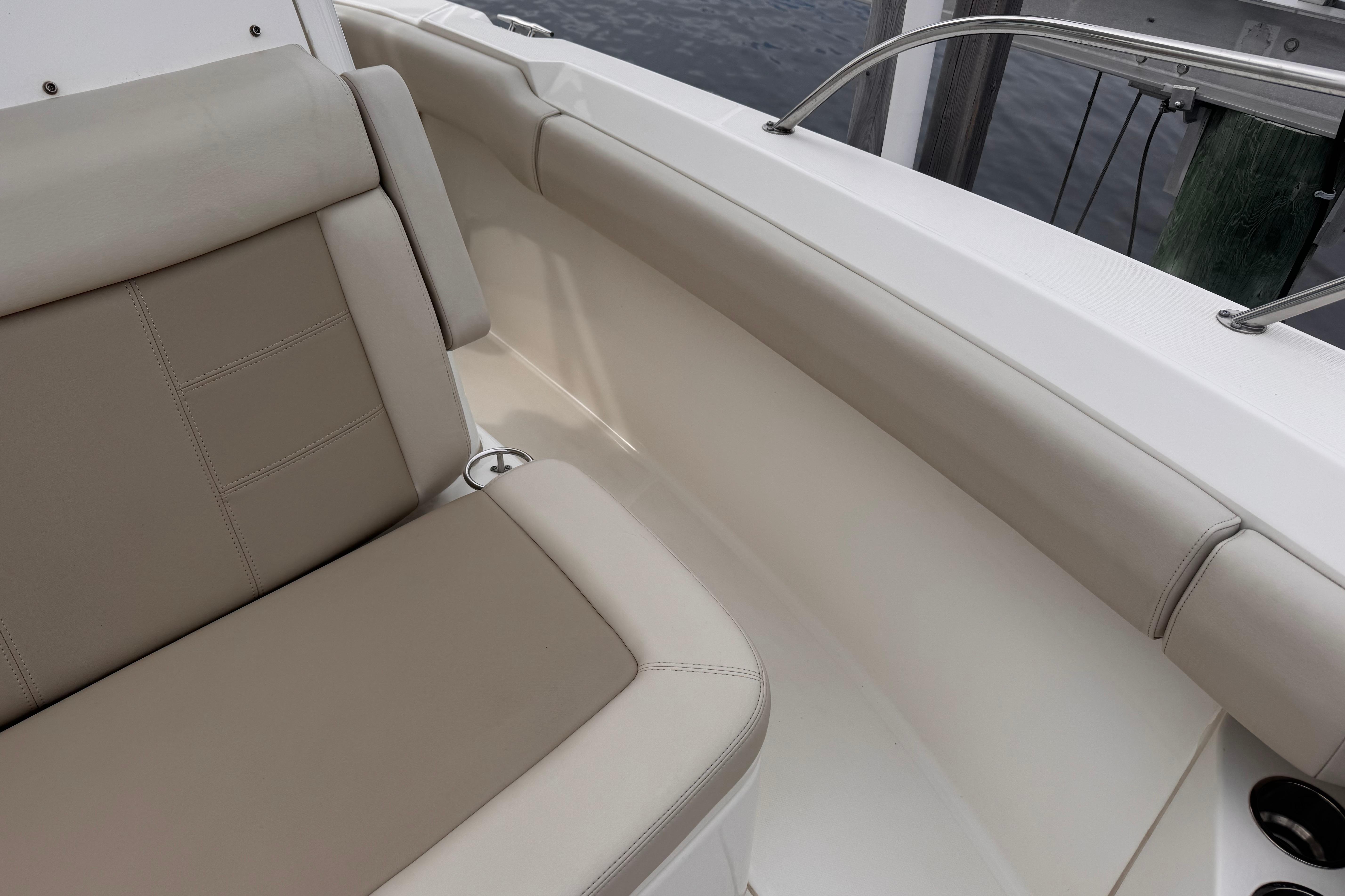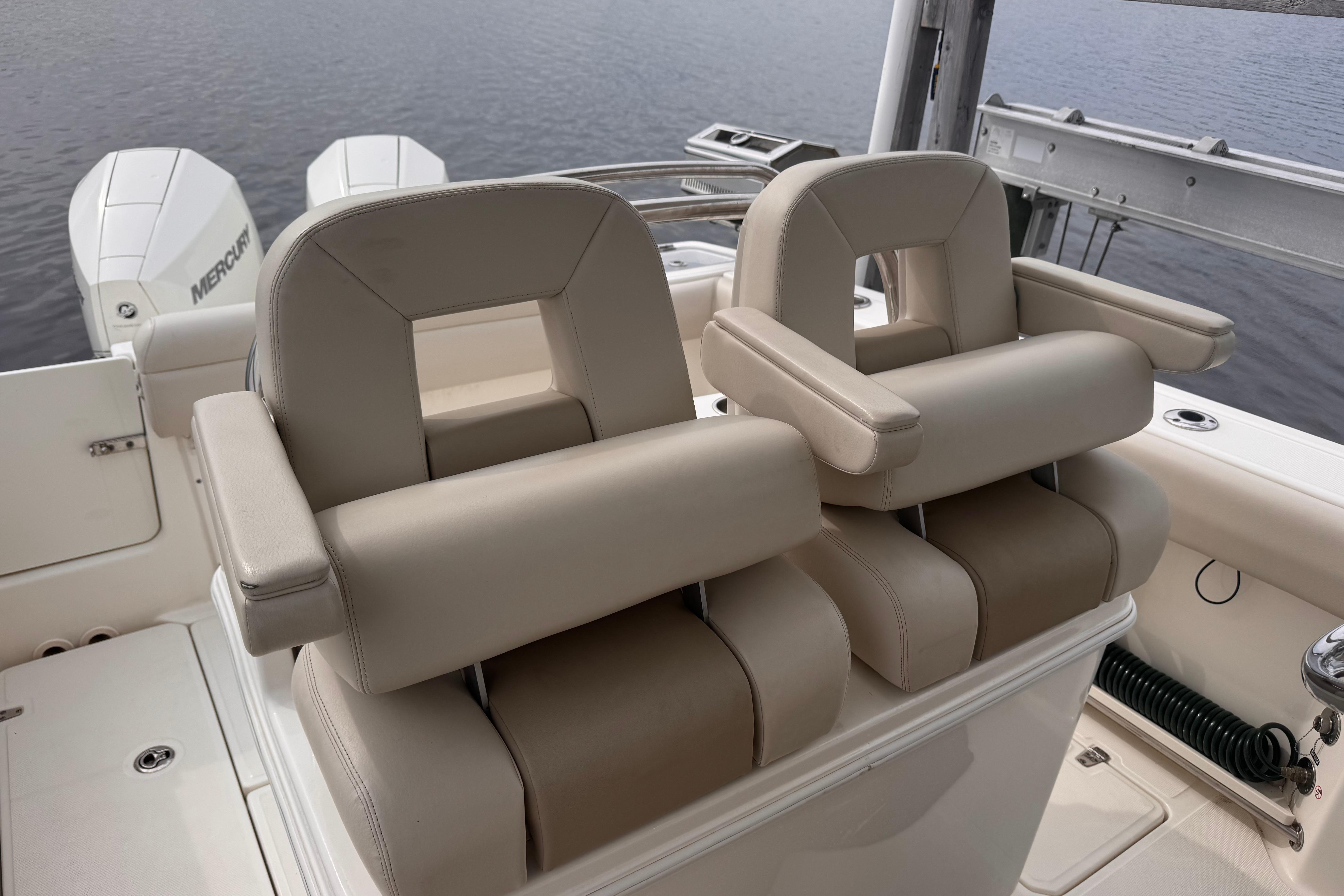 - Deluxe helm seat upgrade provides adjustable captain’s chair and stationary companion seat.