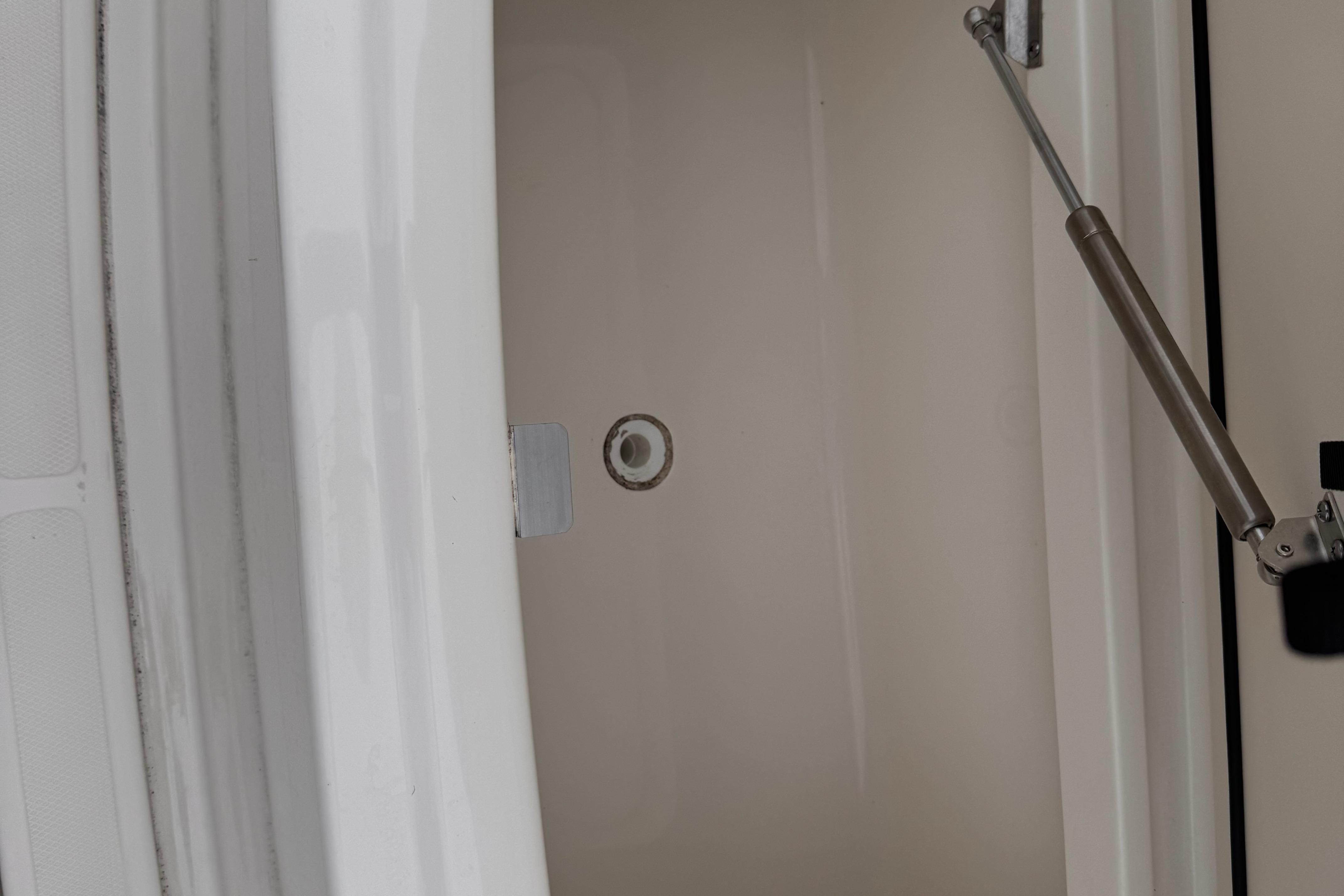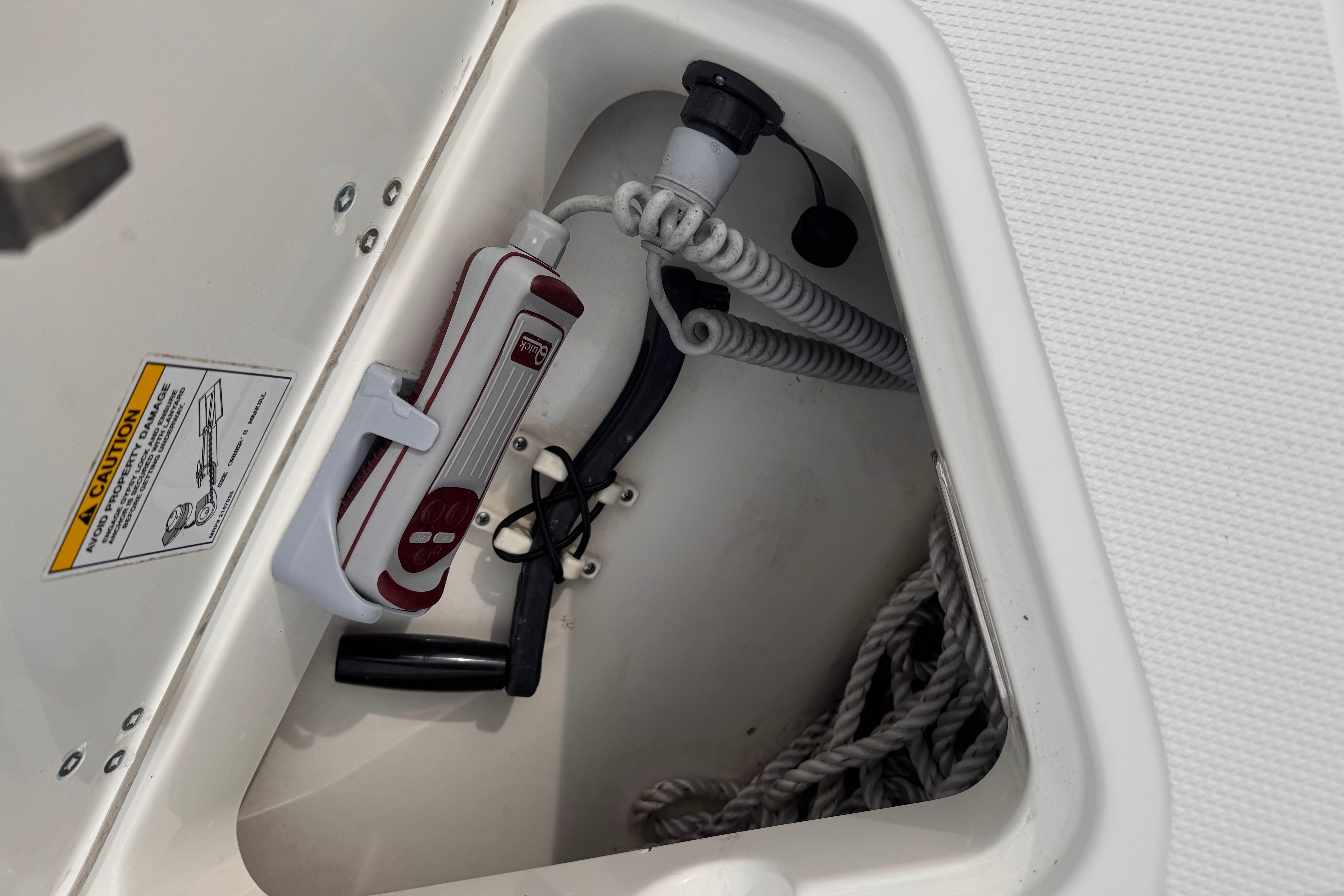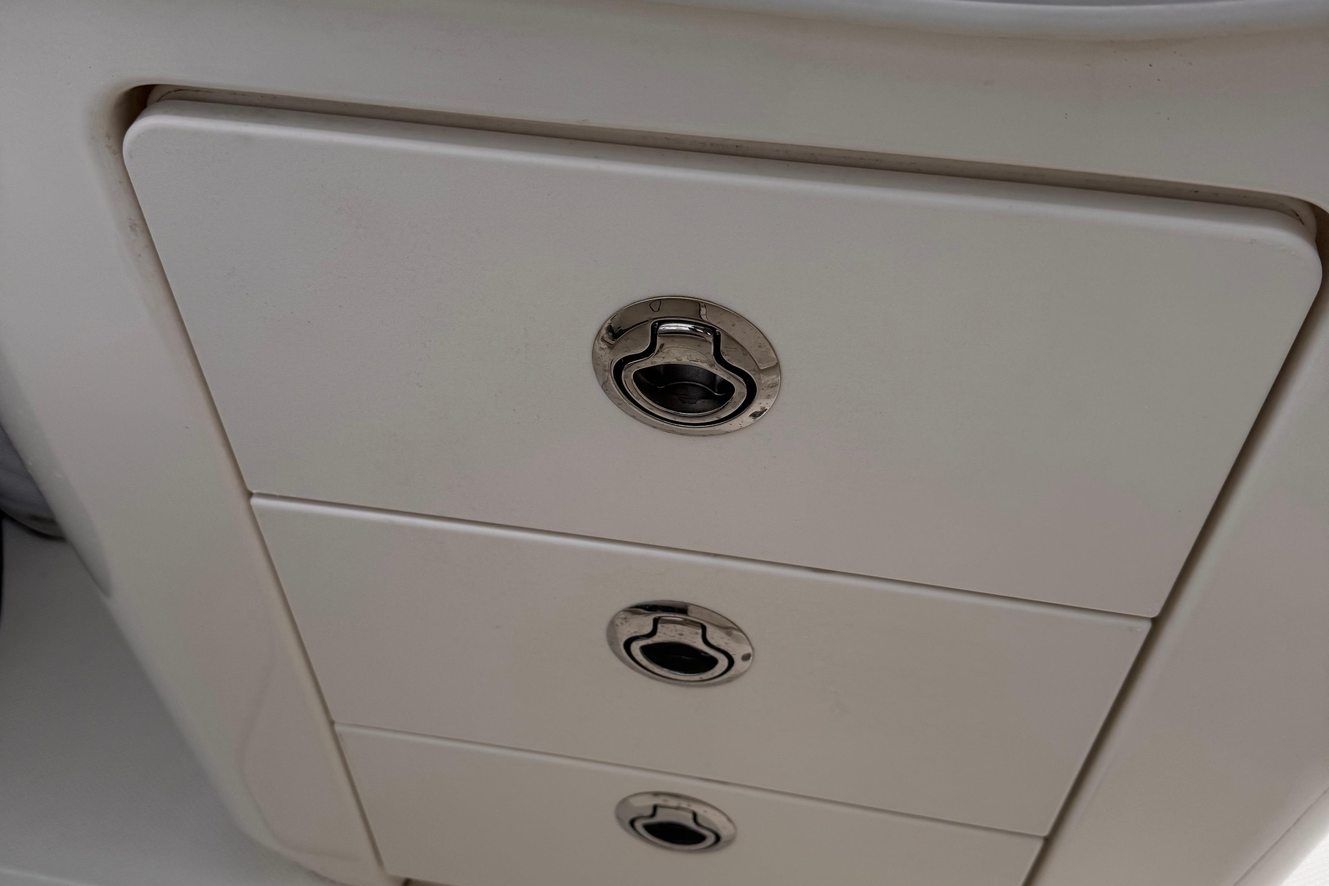 - Bow storage locker with hatch, gasket, and overboard drain