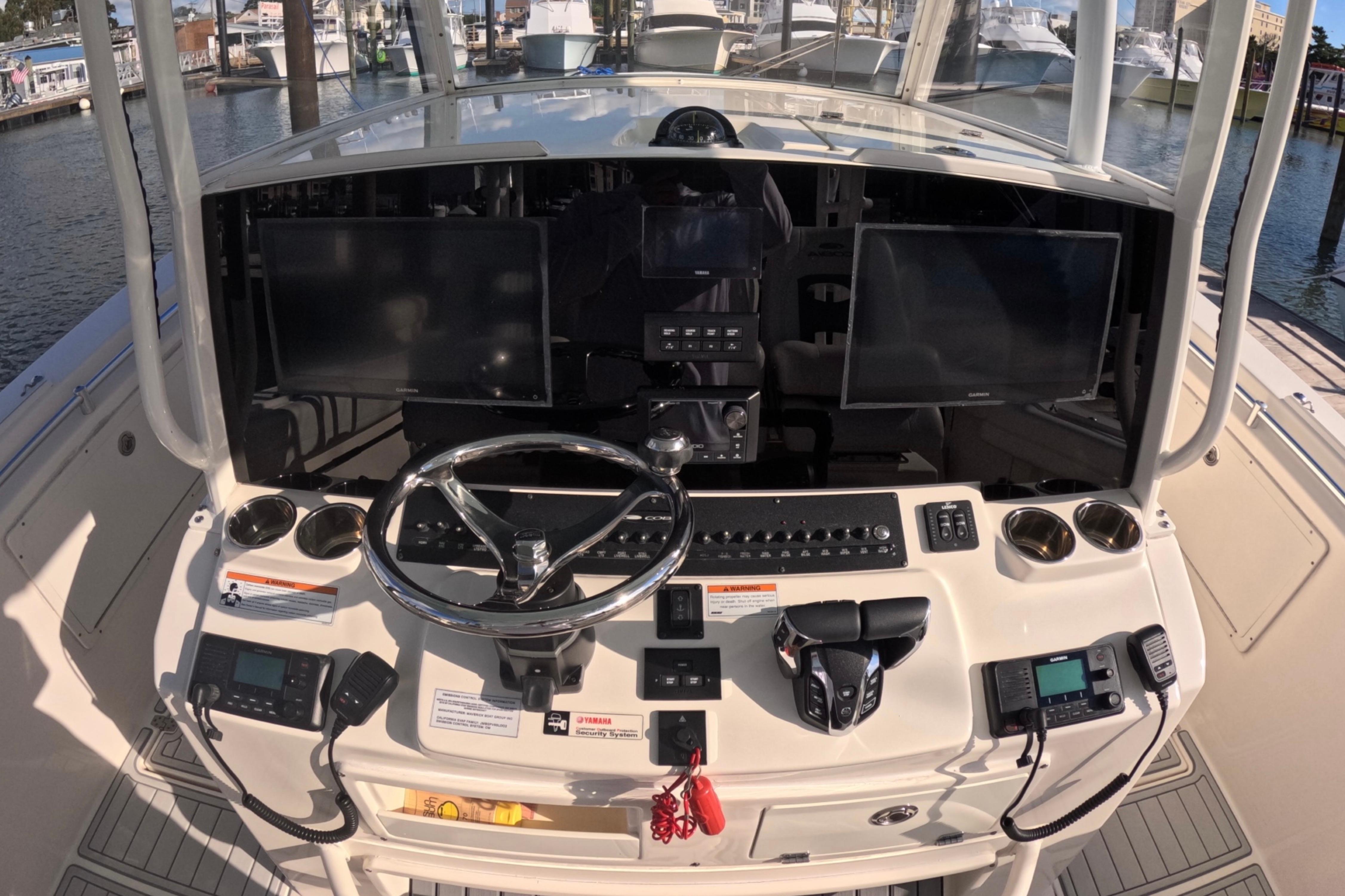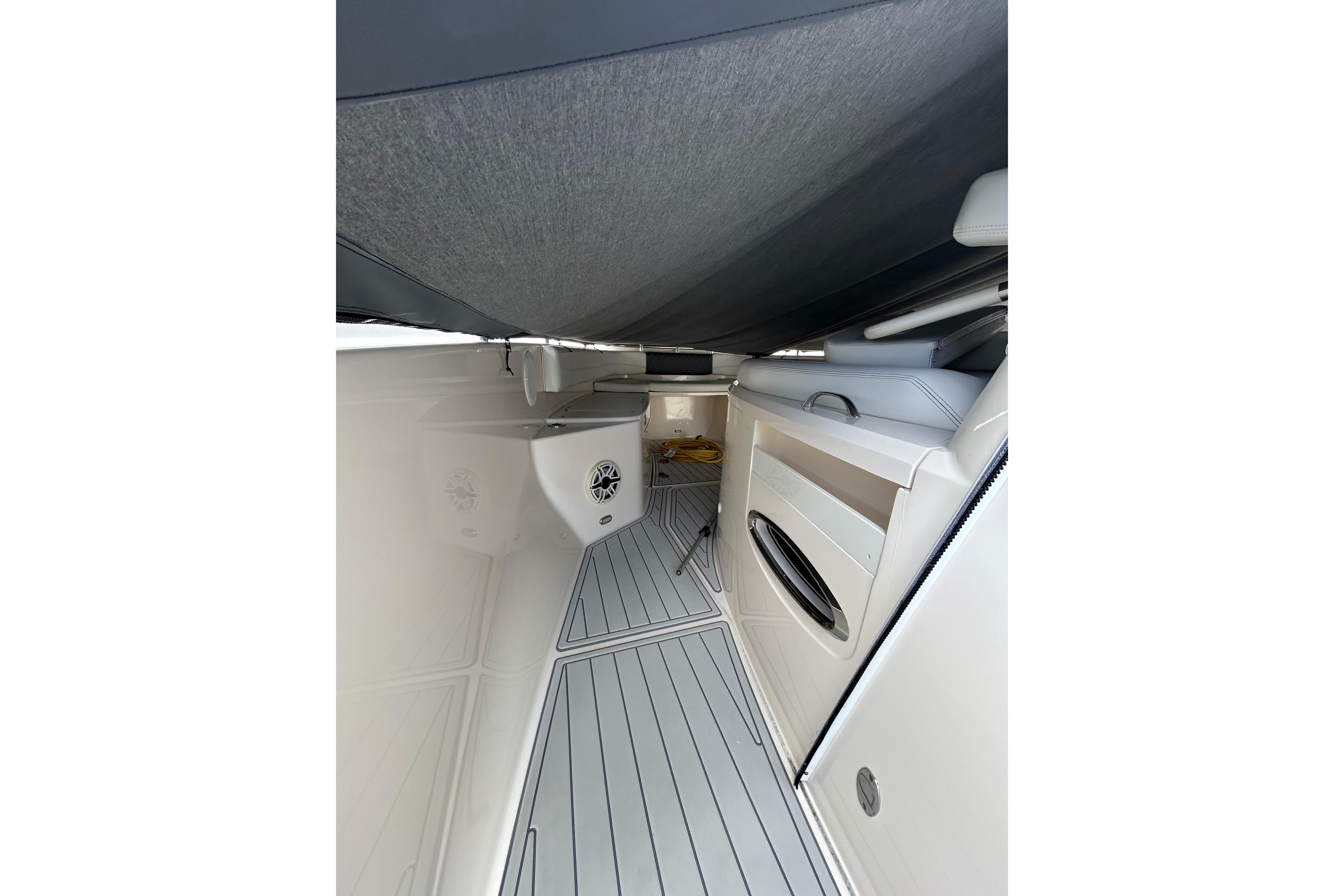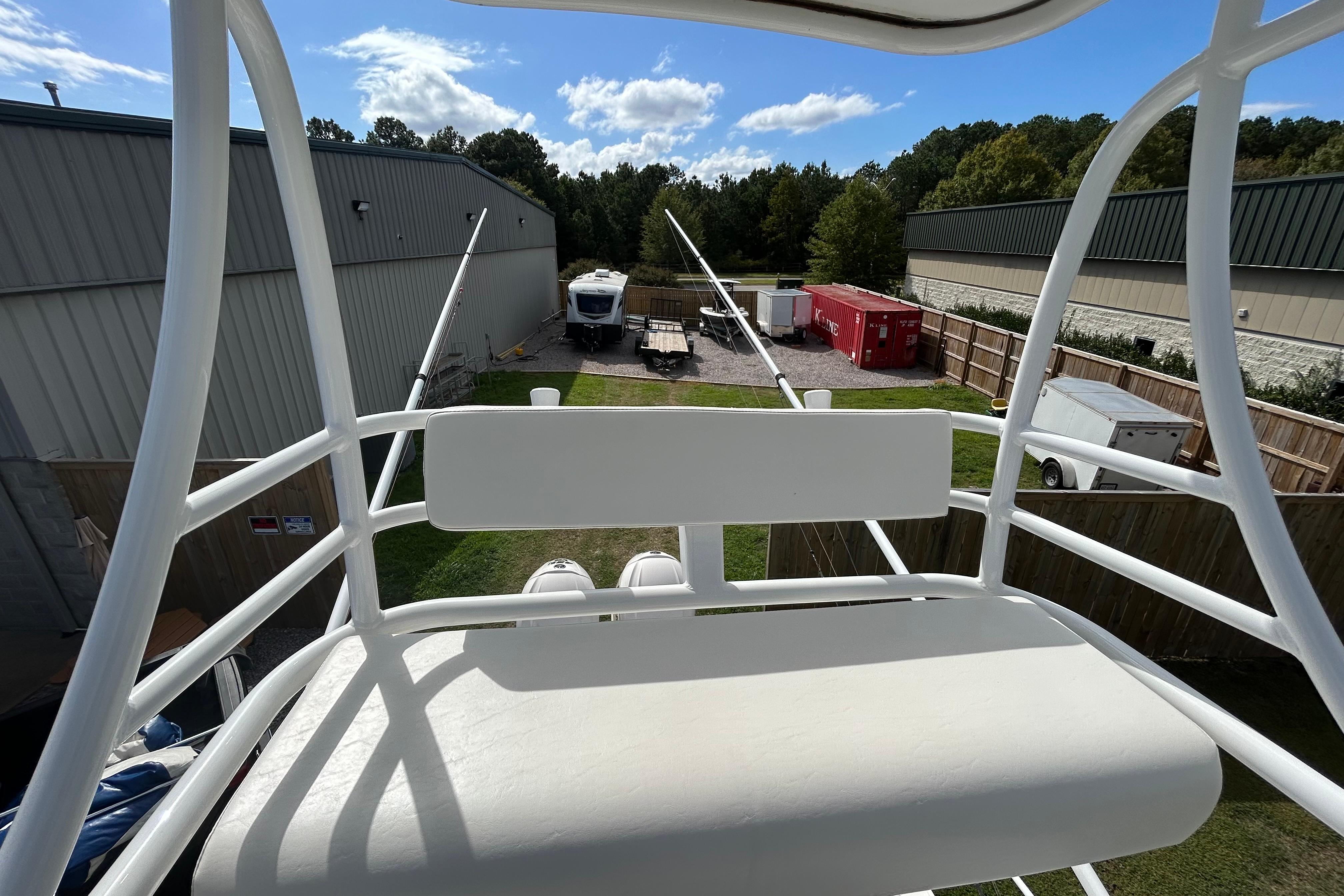 This is a tournament-ready rig with comfort to match. The only 350 on the market set up with a custom tower with full controls. Spacious console cabin with head, sink, and berth. Forward seating with removable backrests, electric bow table, and premium upholstery throughout. Also featuring custom covers for the bow and helm. An inward opening side door makes pulling aboard a big tuna or dropping in a diver safe and easy.