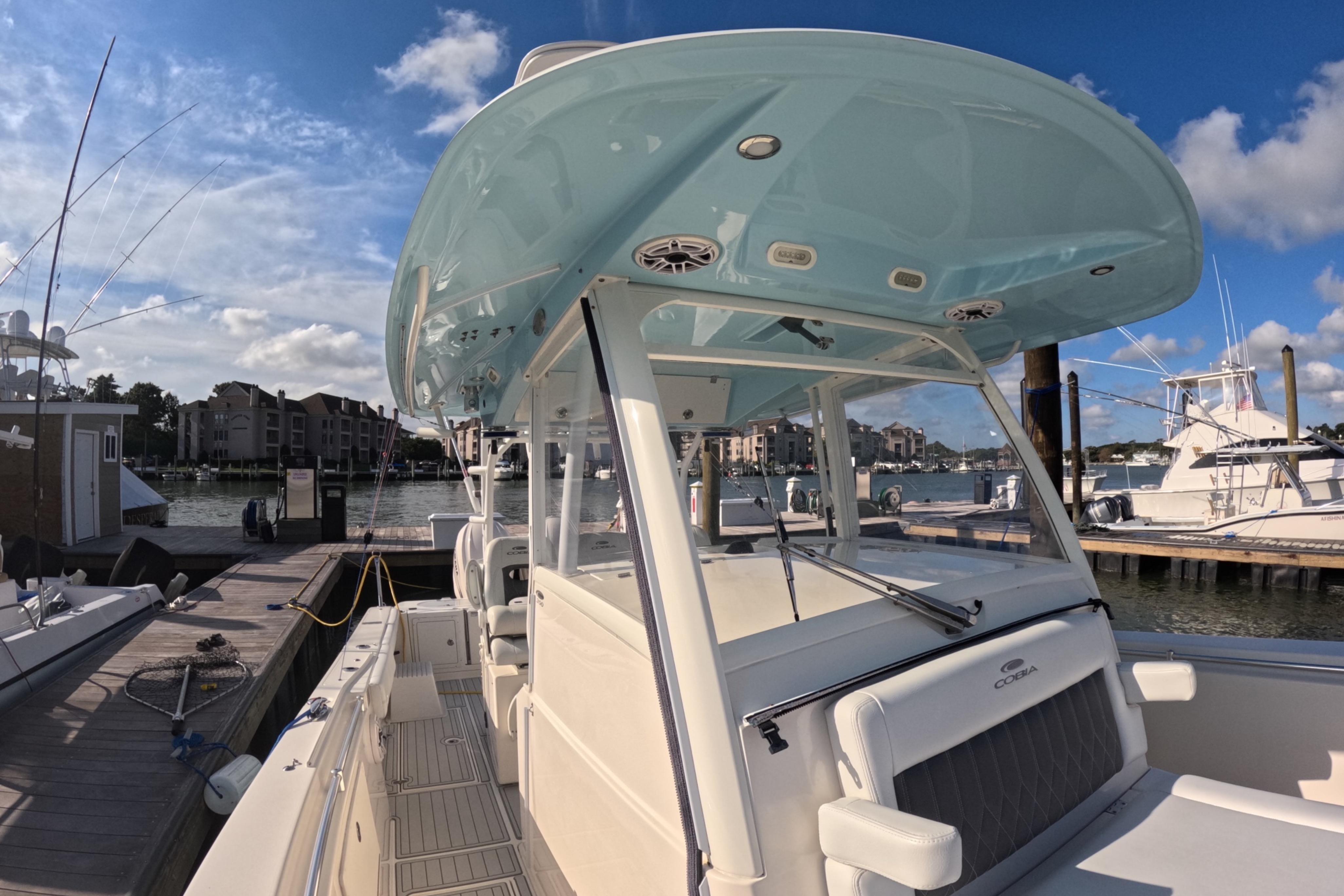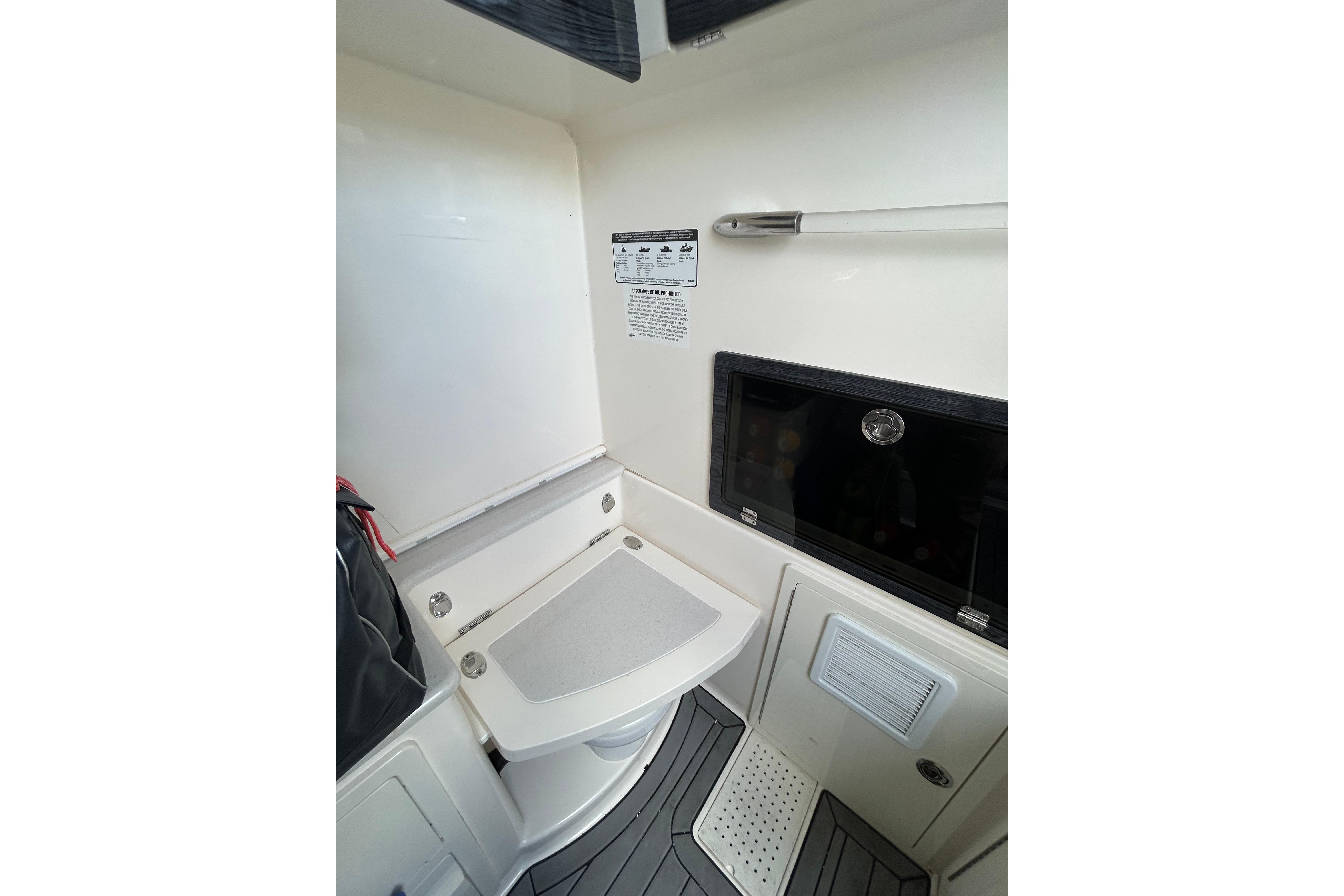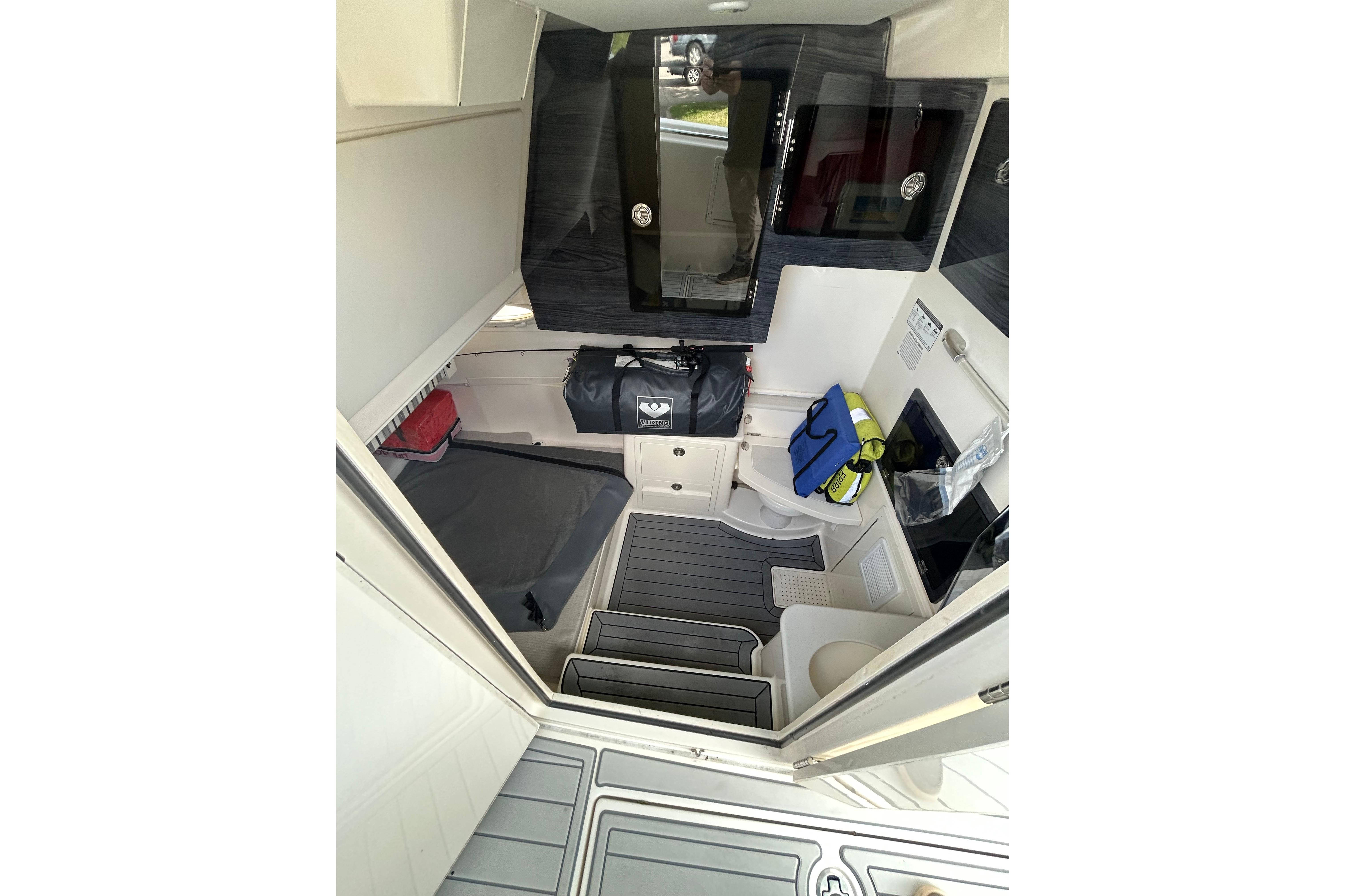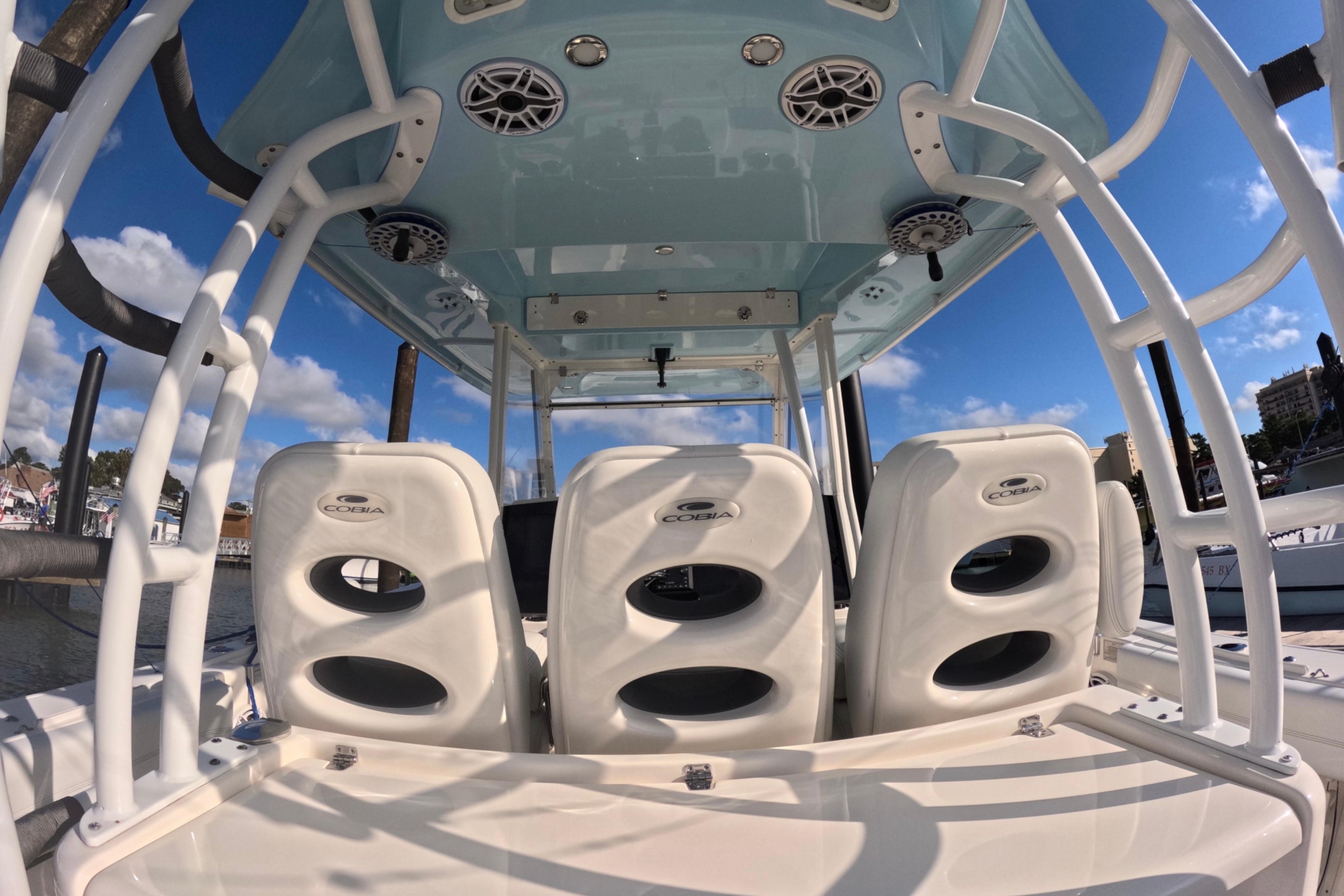 This is a tournament-ready rig with comfort to match. The only 350 on the market set up with a custom tower with full controls. Spacious console cabin with head, sink, and berth. Forward seating with removable backrests, electric bow table, and premium upholstery throughout. Also featuring custom covers for the bow and helm. An inward opening side door makes pulling aboard a big tuna or dropping in a diver safe and easy.