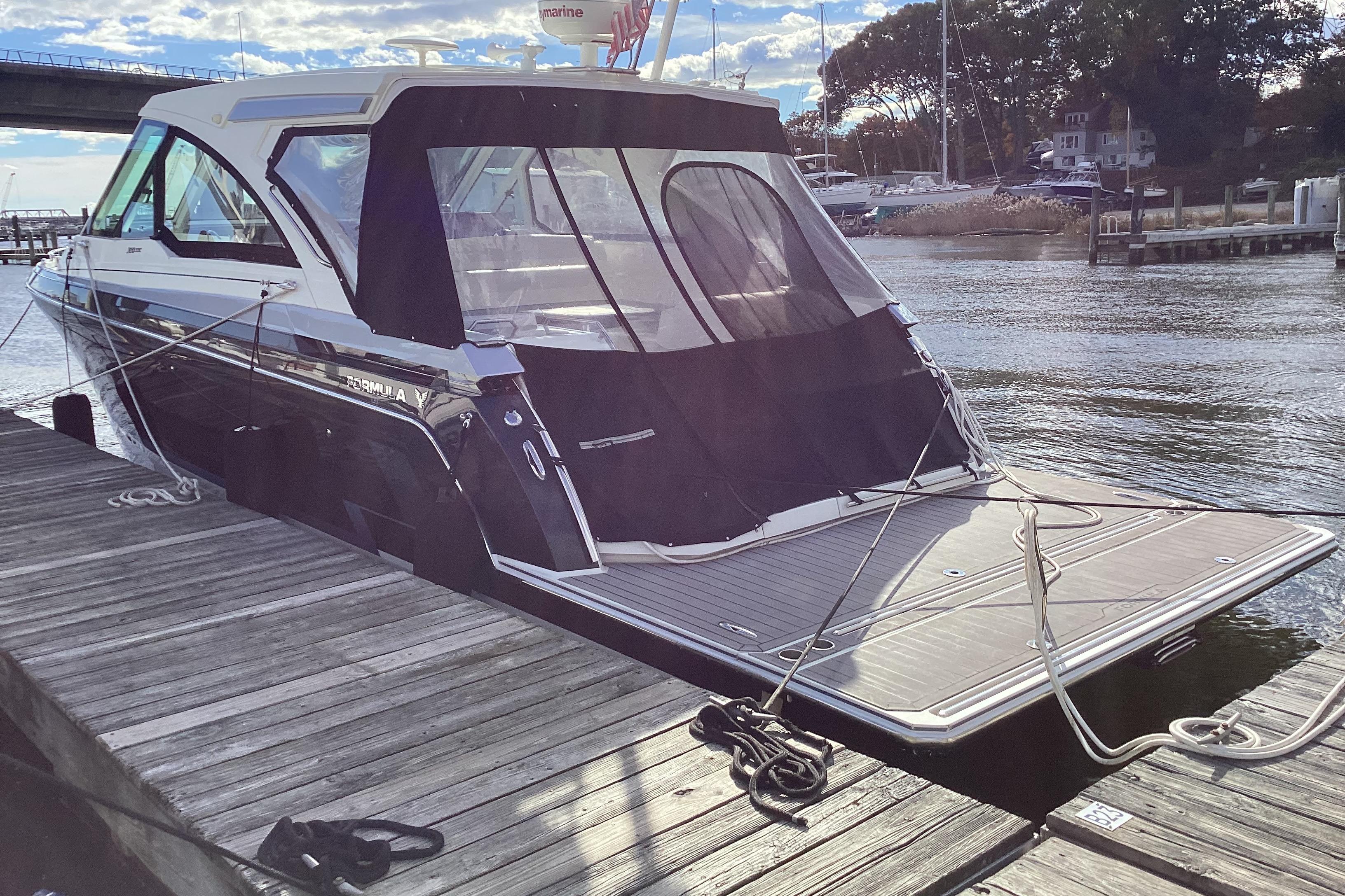 The Formula 380 SSC is an open-bow, full-cabin day boat whose most distinctive feature is a large hydraulic swim platform that lowers for swimming or launching water toys. Accessed from