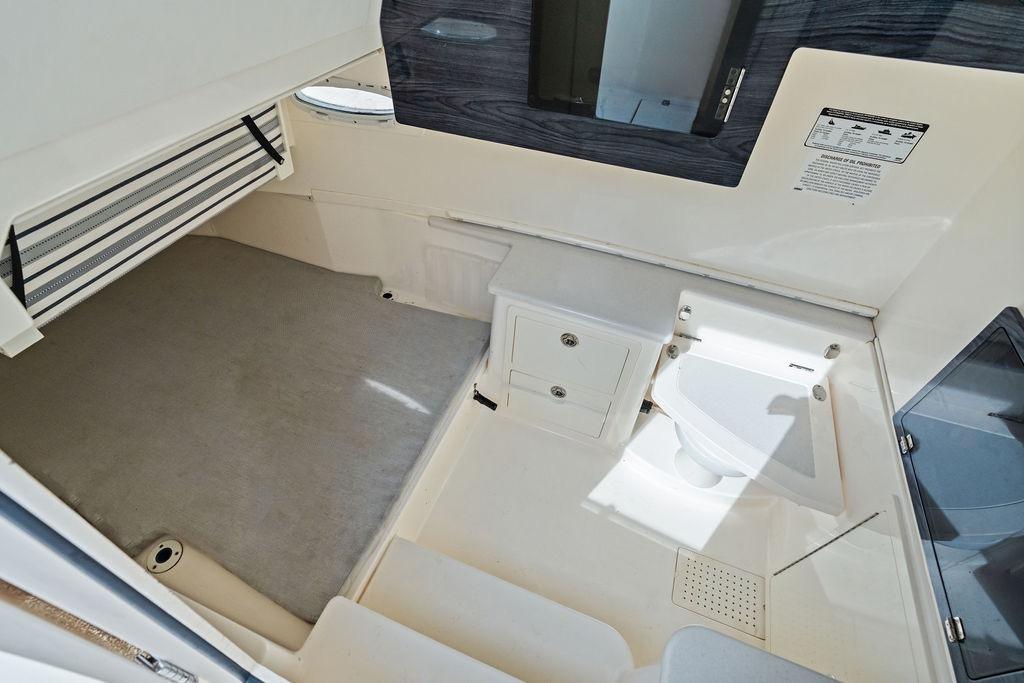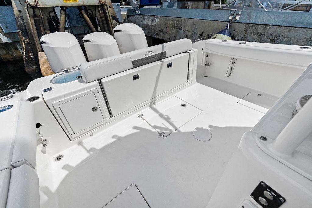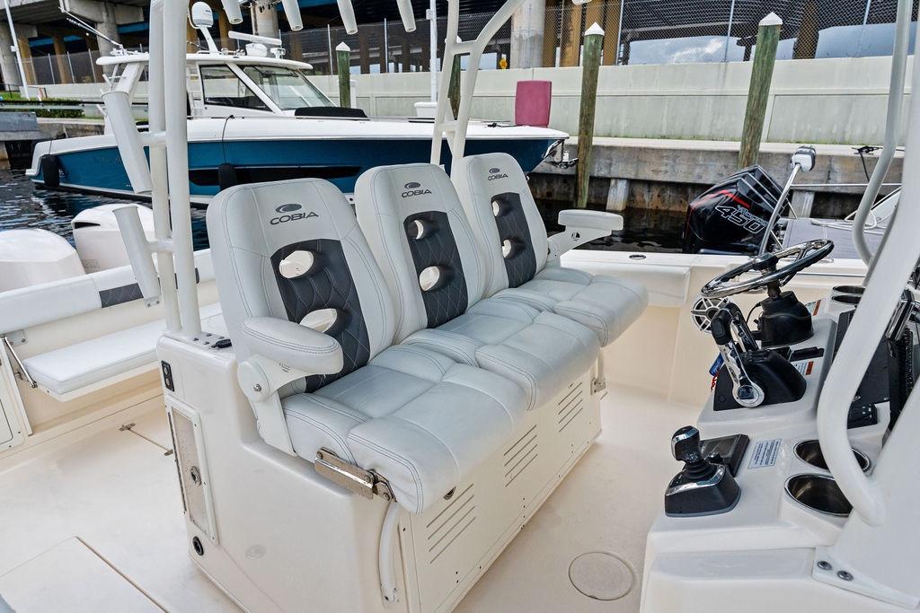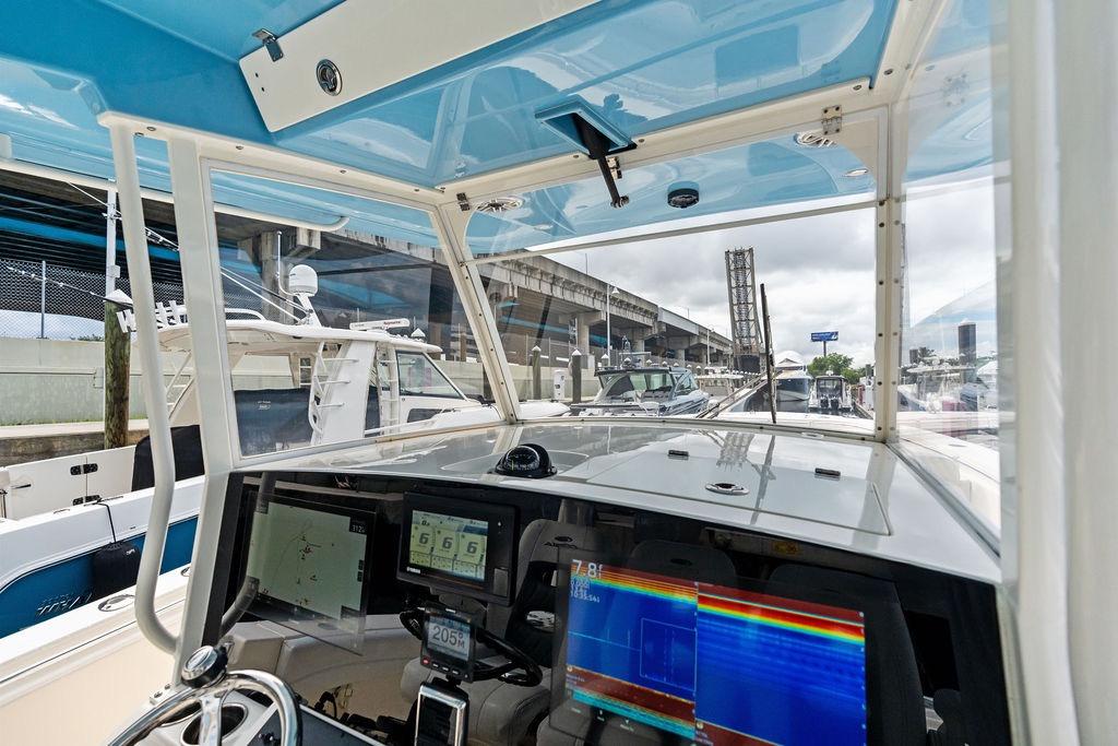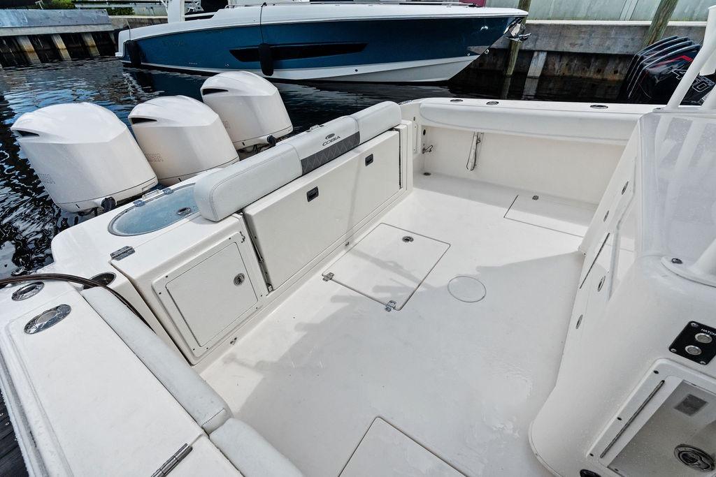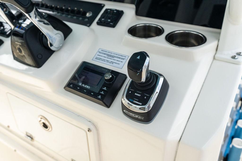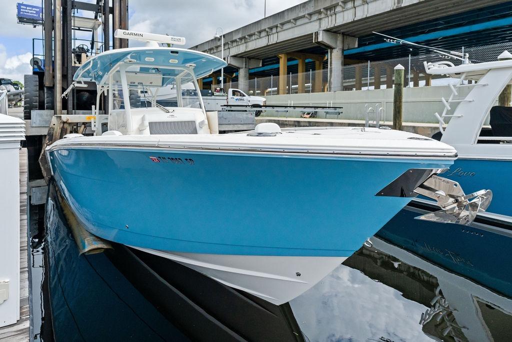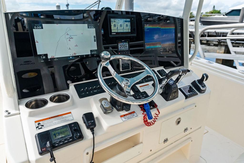 The 350 Center Console fishes hard and plays easy with a rare combination of high style and ultra-performance. A double-stepped hull makes getting to the fishing grounds fast and fuel efficient while elegant topside amenities bathe you in style and comfort. Tournament capable fishing features include dual 42-gallon bait tanks, (2) huge in-floor fish boxes that pump overboard, a full tackle station and bait prep area. With an 11'2" beam and a clean, wide-open Cockpit, there's plenty of room for a group of anglers to all fish at once with plenty of space to spare or to chase around a hot fish at boatside. An inward opening side door makes pulling aboard a big tuna or dropping in a diver safe and easy. When it's time to relax, the 350 converts to a cruising and sandbar hopping pleasure vessel. Comfortable and elegantly appointed seating for (11) people include triple, independent Helm seats, an integrated chaise lounge big enough for two, and full sun lounge capability with forward facing backrests. To top it all off, the inside of the Console houses a spacious, airy berth that's surrounded by a refined interior with wooden cabinetry, an electric head and a combination sink/shower.
