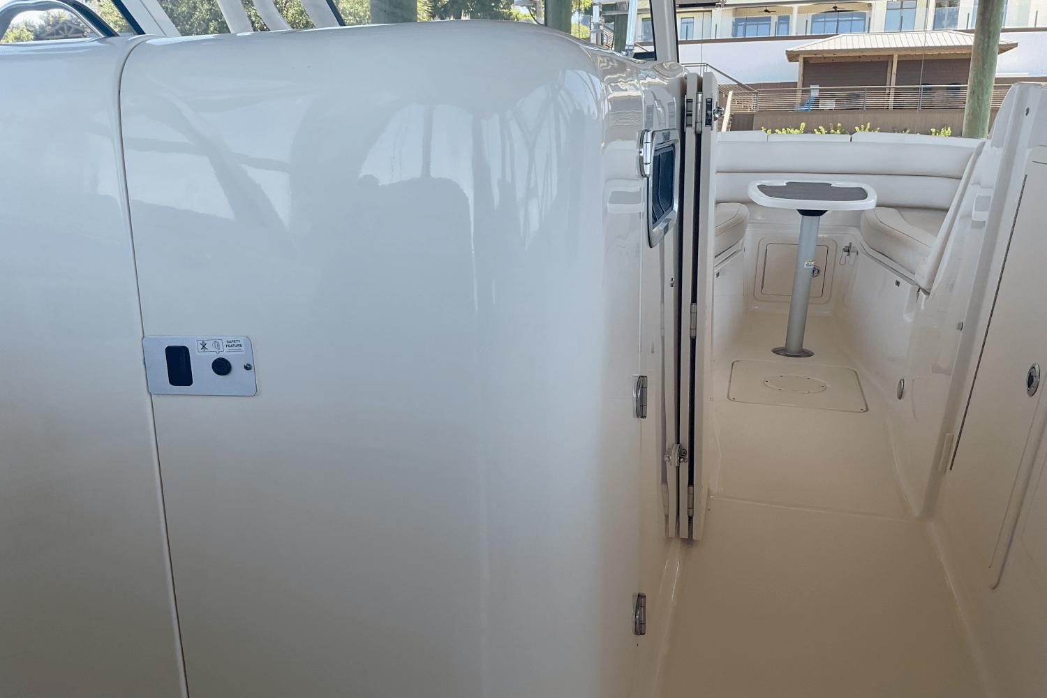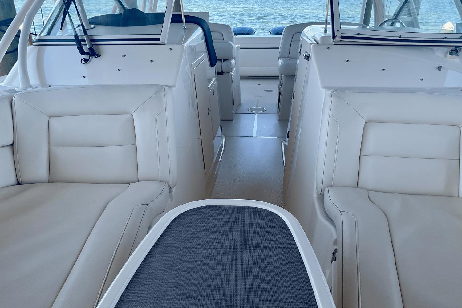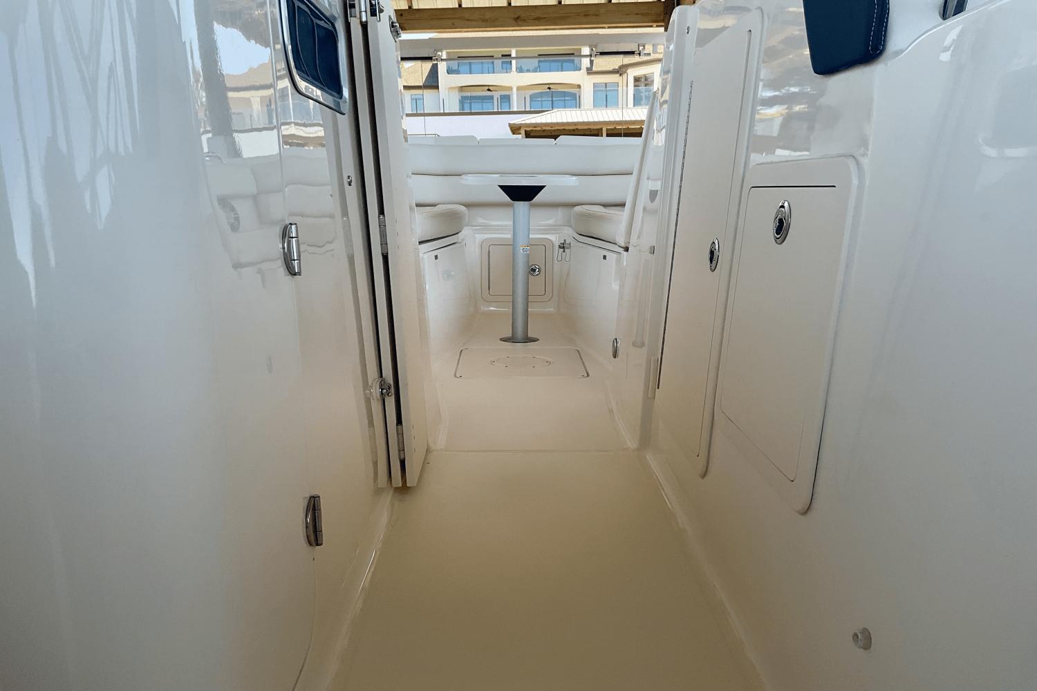 The dual-console design separates the helm and passenger areas with a large, easy-access walkway leading to the open bow seating area, perfect for lounging or entertaining. oy plush seating, a spacious layout, enclosed head with sink, wet bar, top-tier sound system, and integrated storage, all wrapped in sleek, modern design.