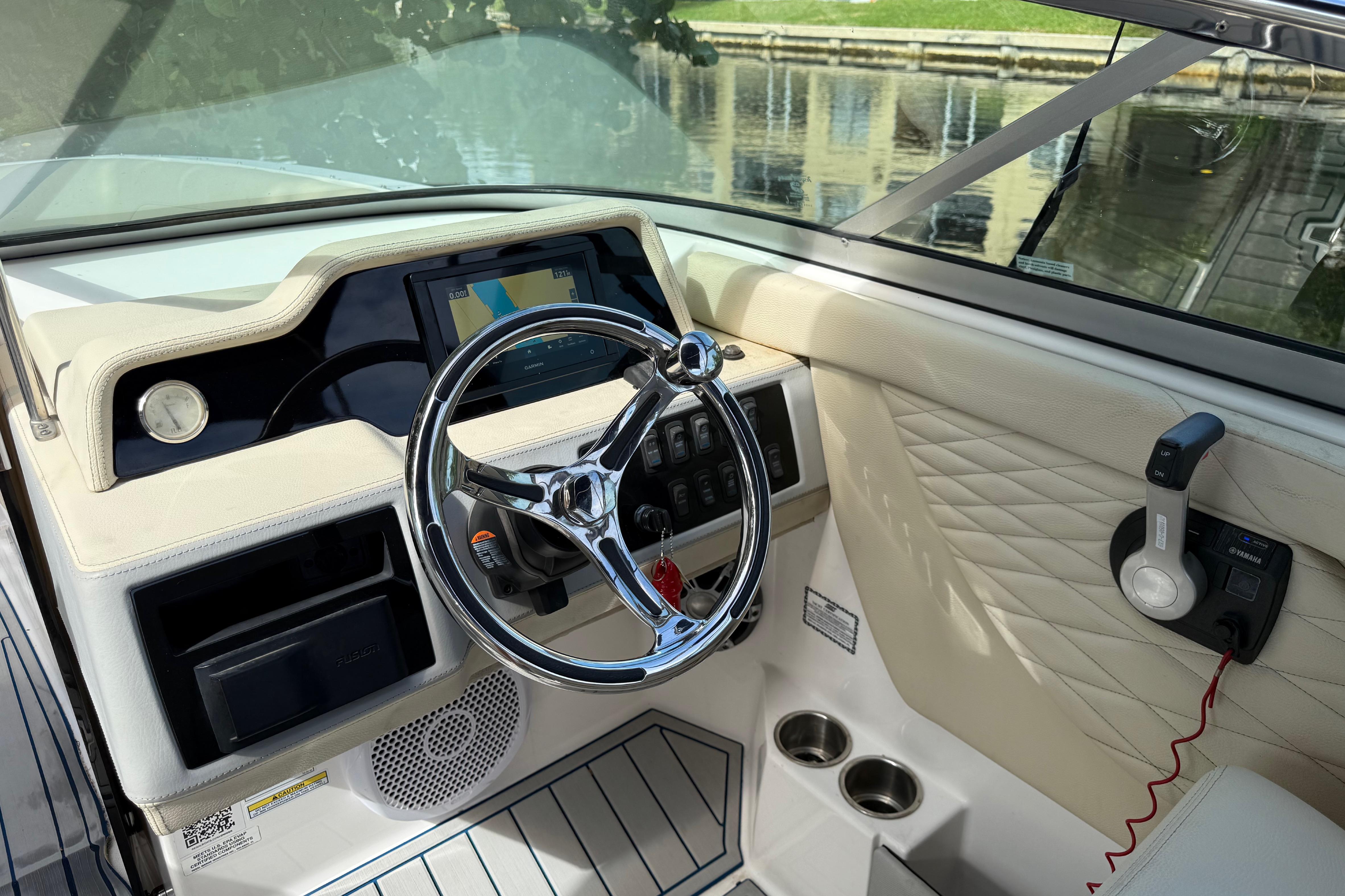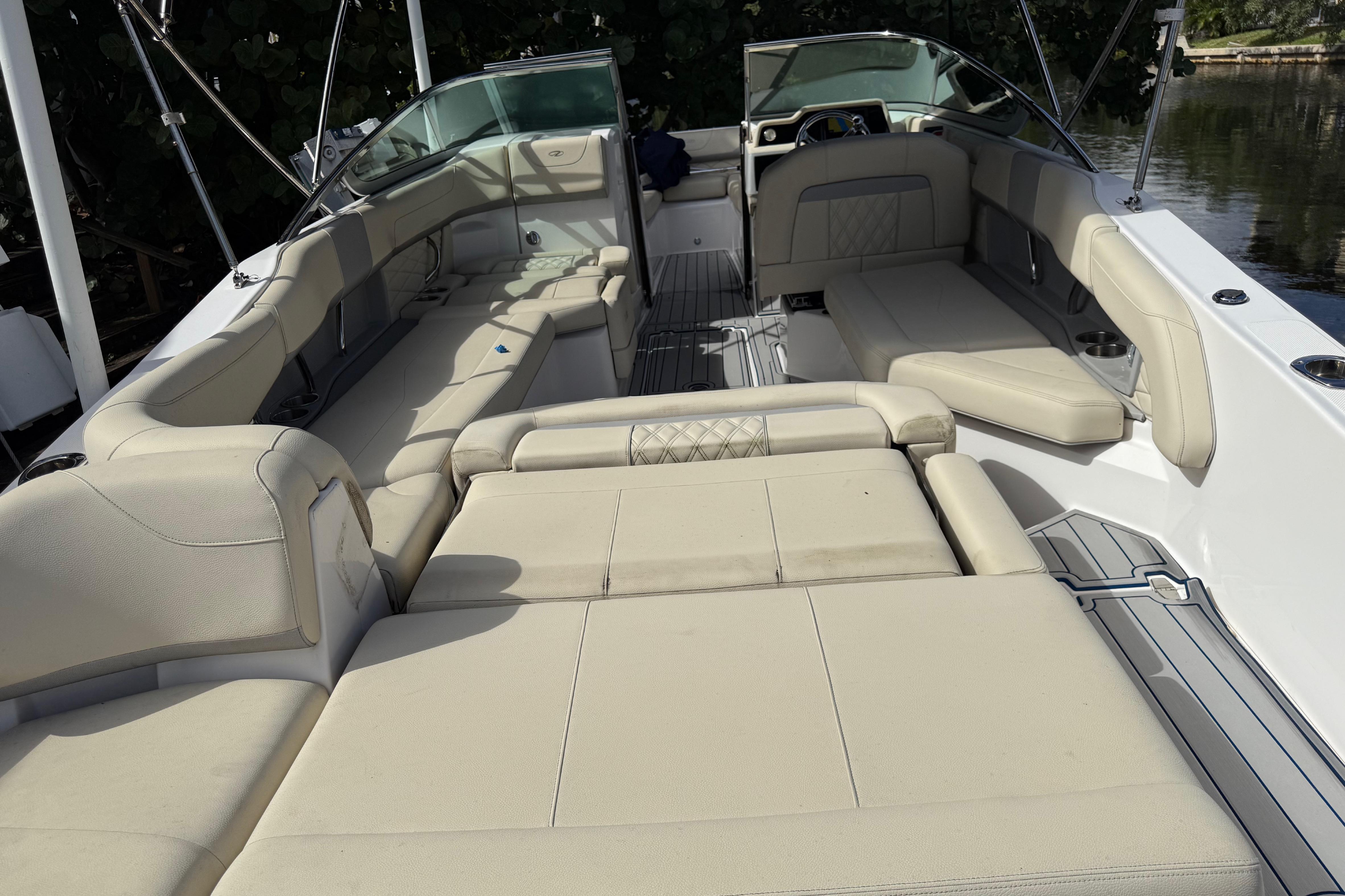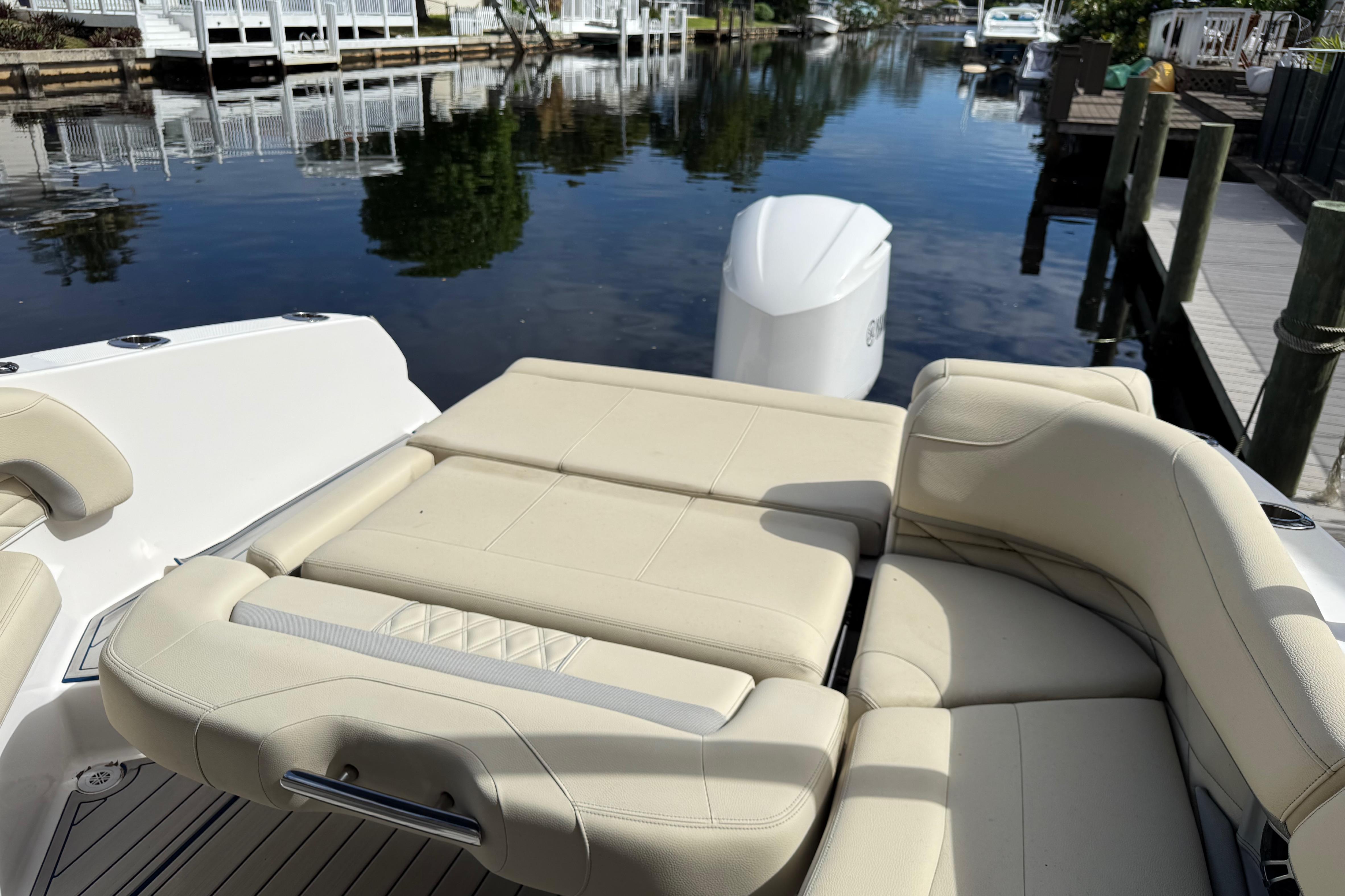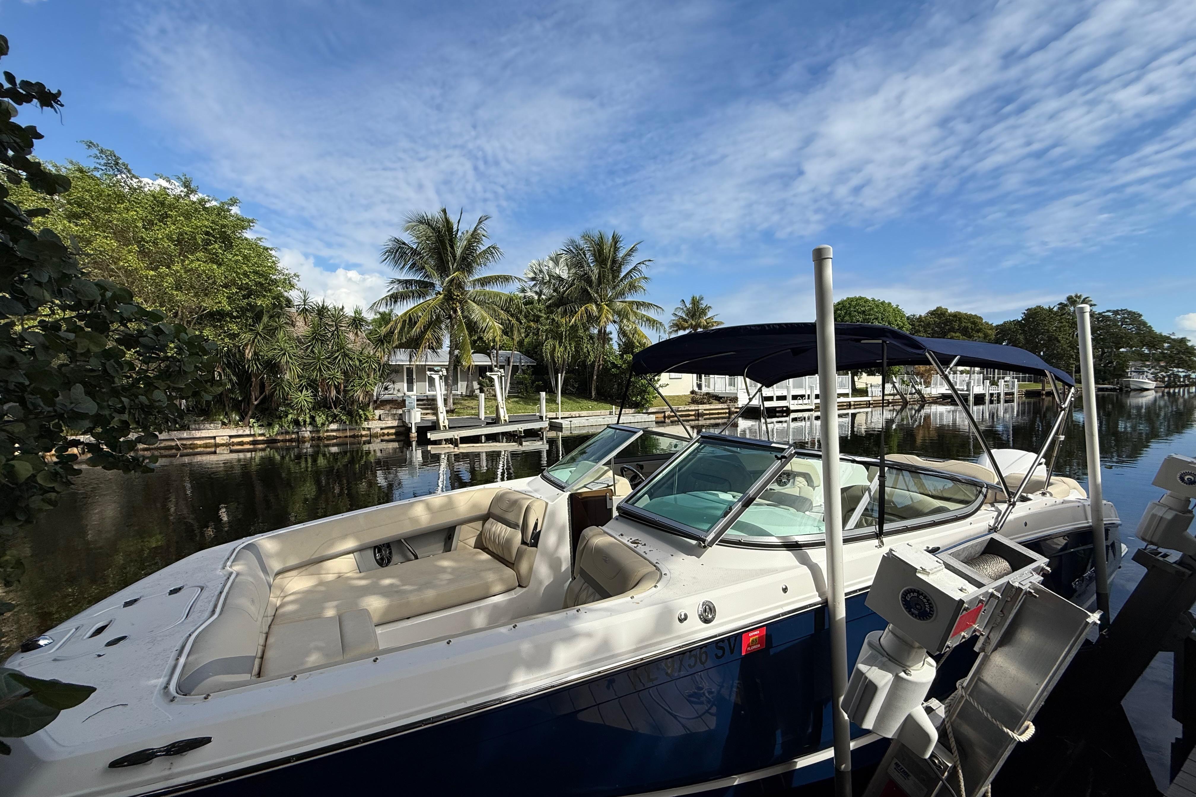 This 26-foot, versatile outboard bowrider designed for entertainment and cruising, featuring a spacious deck, versatile seating like the "Ultra Lounge," and a stepped hull for performance. It has a beam of 8' 6" and powered by a Yamaha 300, with a fuel capacity of 103 gallons.