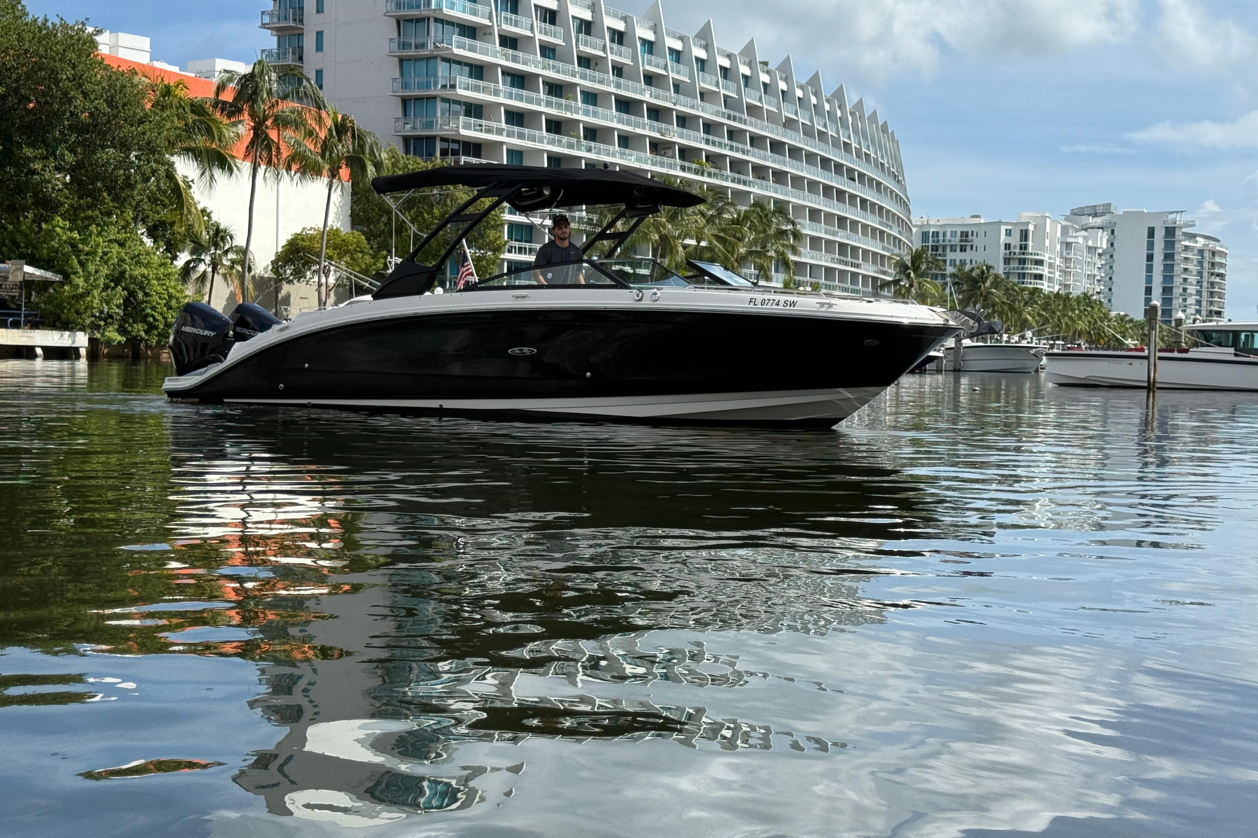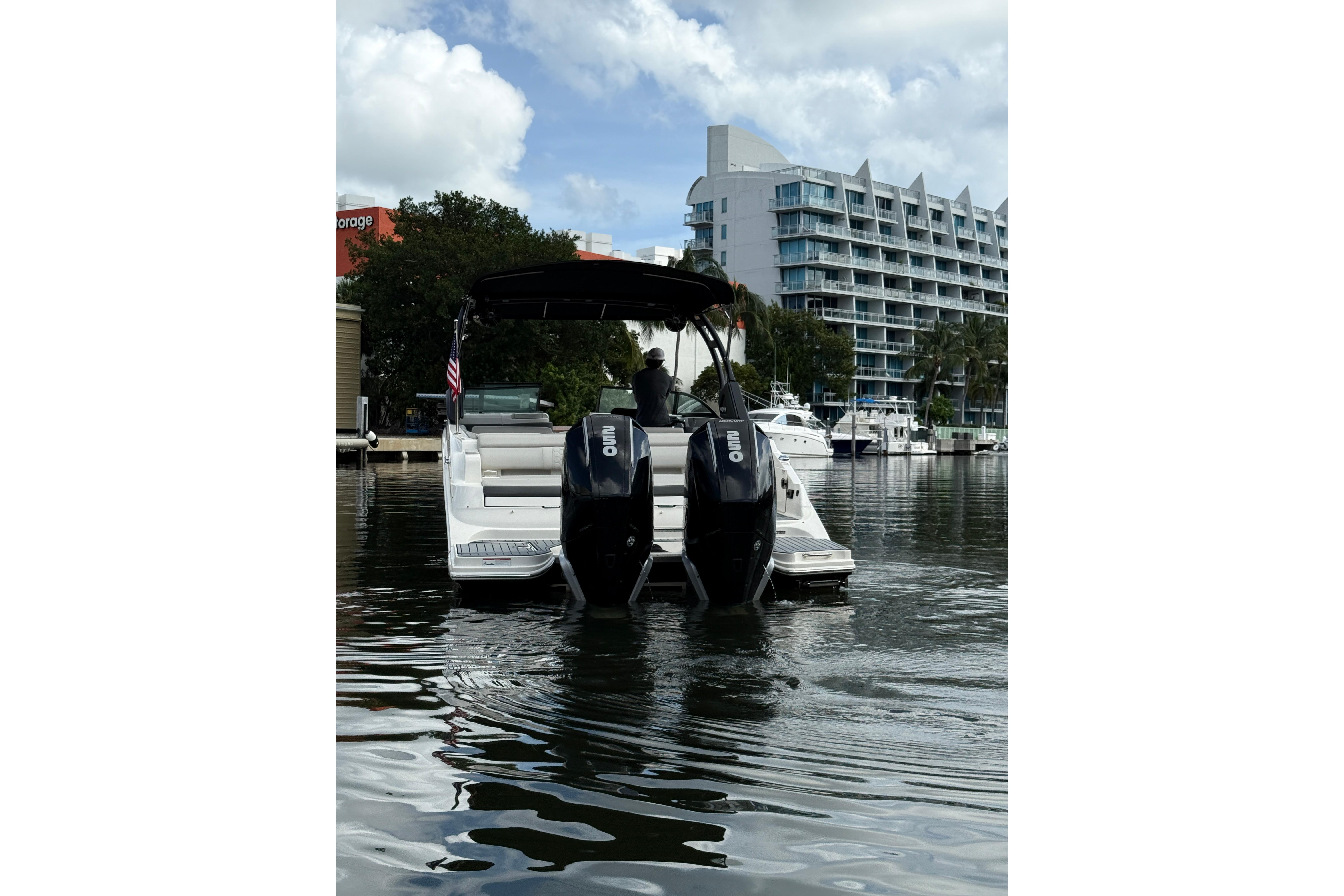 This Sea Ray SDX 290 OB is in excellent condition. Rack stored indoors, she is kept covered and out of the elements when at rest and shows like new. This model a perfect deck boat that combines practical elegance and an abundance of space. Powered by twin Mercury 250s, she is perfect for both leisurely cruising and wind in your face exhilarating rides. With less than 210 hours on the Mercury 250 fourstroke motors with recent service.
