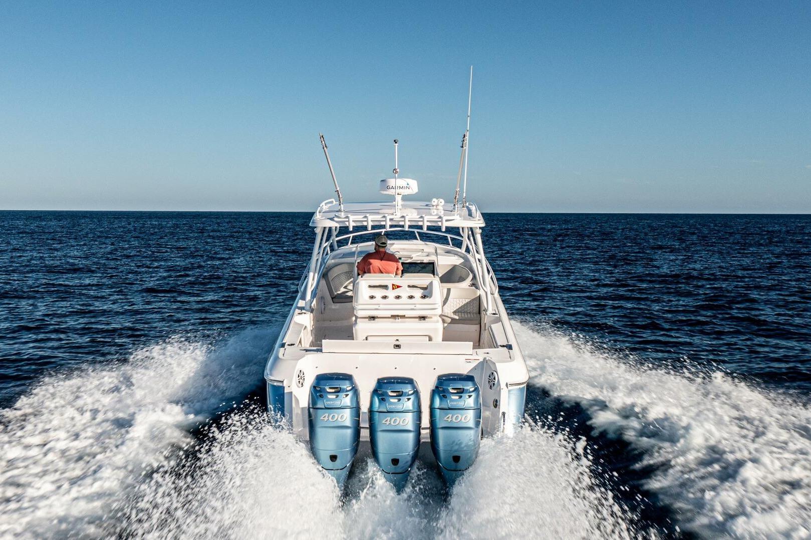 World renowned for craftmanship, Intrepid has a rich history of producing fast, efficient, and smooth-running center consoles. Built to order, each boat has finishes and customizations seldom found on production boats. A stepped hull gives efficient cruising speeds approaching 60 miles per hour all while riding on top of the water - letting the boat skip over chop and land gently without pounding. Triple 400HP Verados are painted to match the custom metallic Imron hull paint. Custom upholstery double stitching, hardwood cabin flooring, and upgraded cabin cabinetry give the boat an interior feel as rich as it looks on the water.