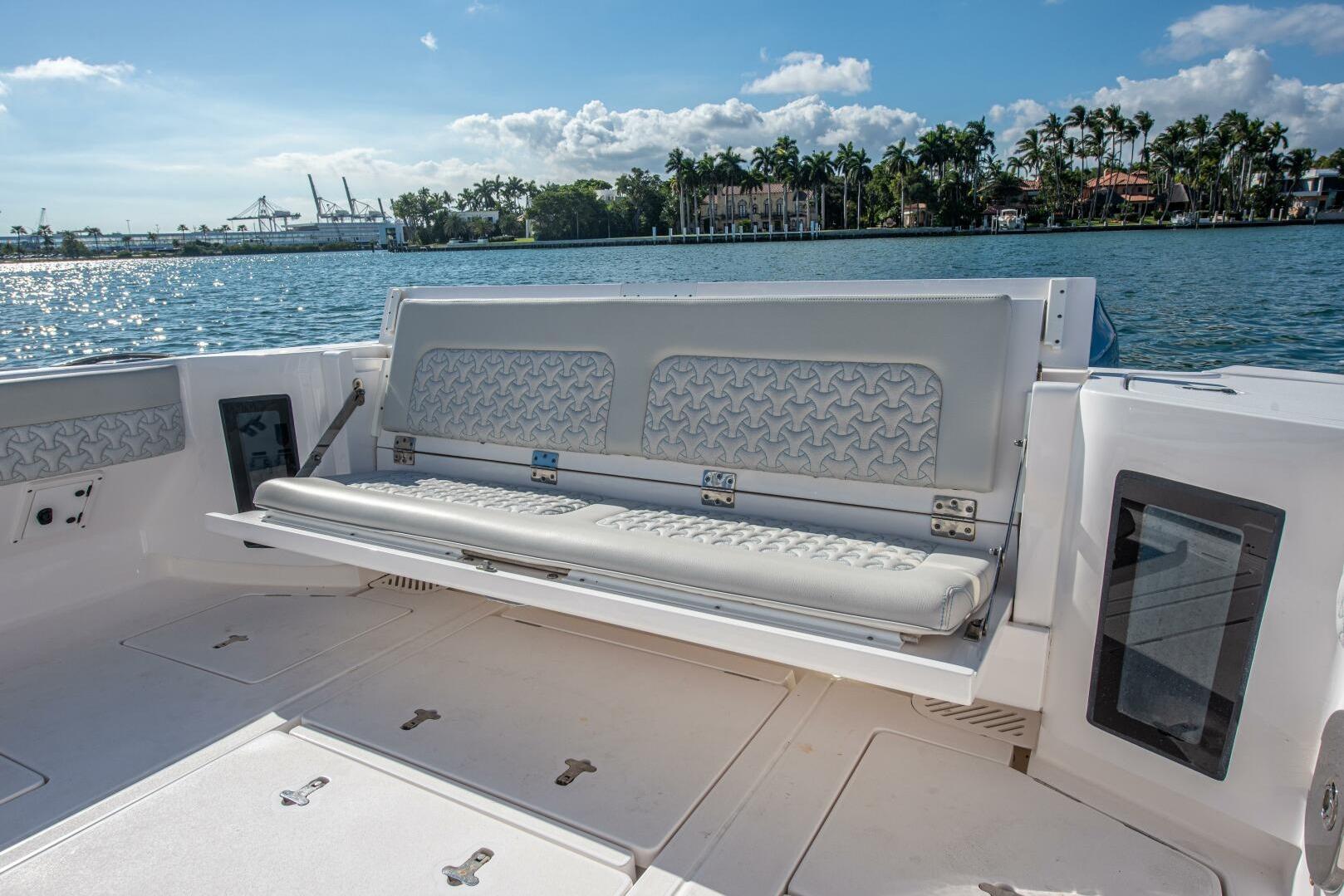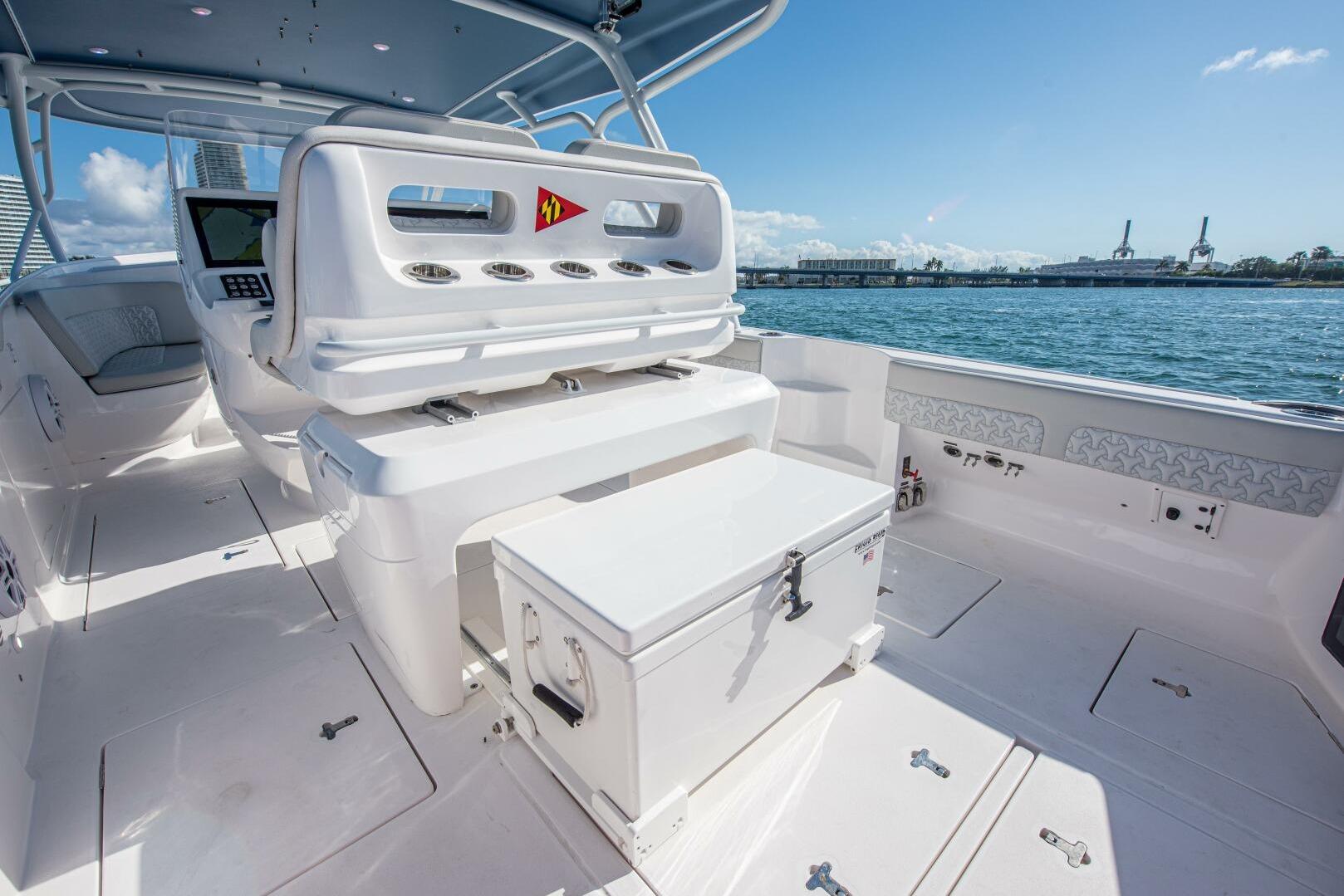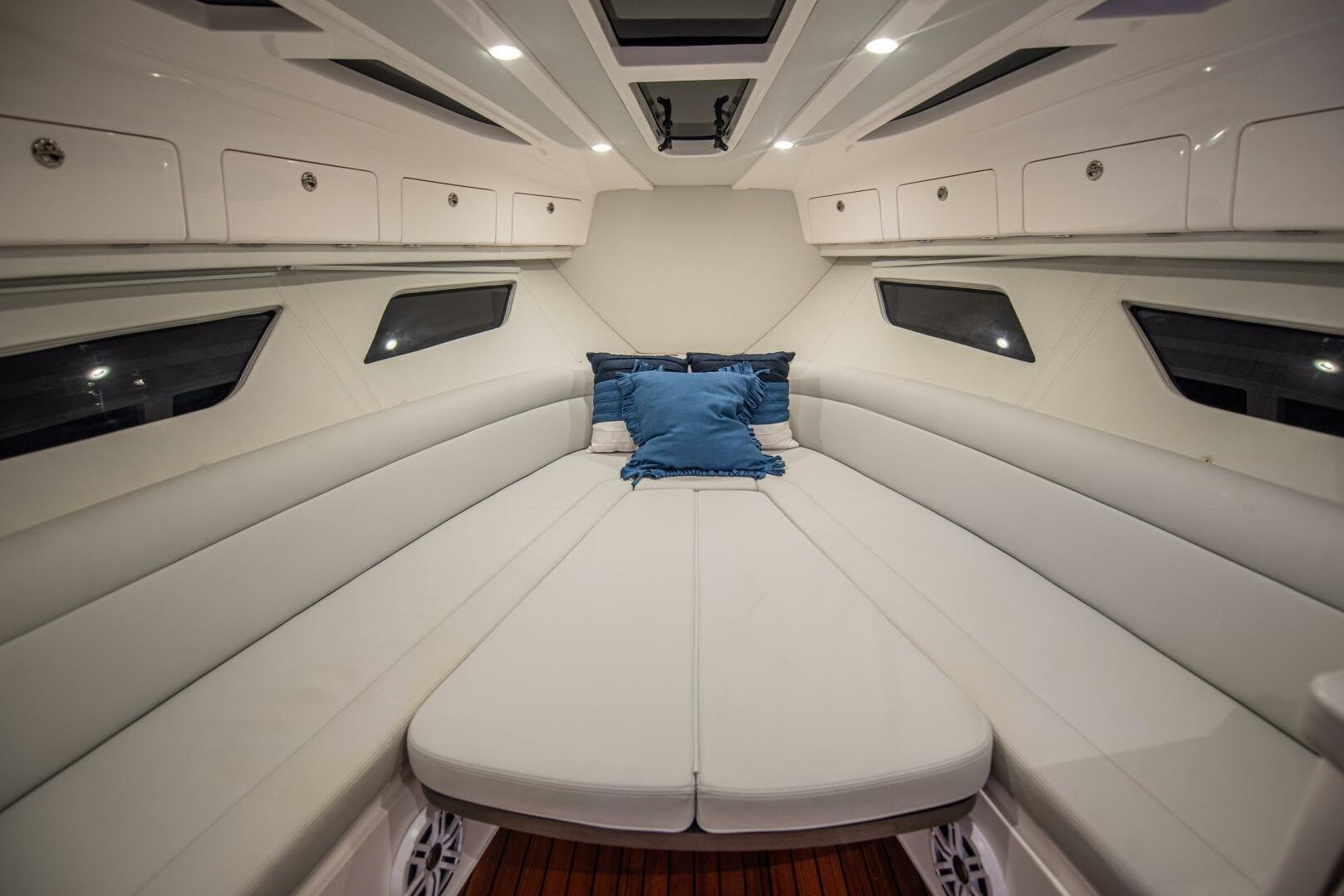 The cockpit has a large, port-side dive door with a swim ladder that easily folds out to make boarding easy and secure even with dive gear. The transom has a recirculating livewell on either wide of the transom which not only gives the boat fishing capabilities, but also serve as convenient wet storage for drinks. The transom bench deploys for more seating and completely stores out of the way for an open cockpit setup. Plenty of cockpit hatches give access to fish/storage boxes as well as machinery and bilge space. A cooler slides out from under the leaning post for fish or drinks and easily locks back under the helm seating, completely out of the way.