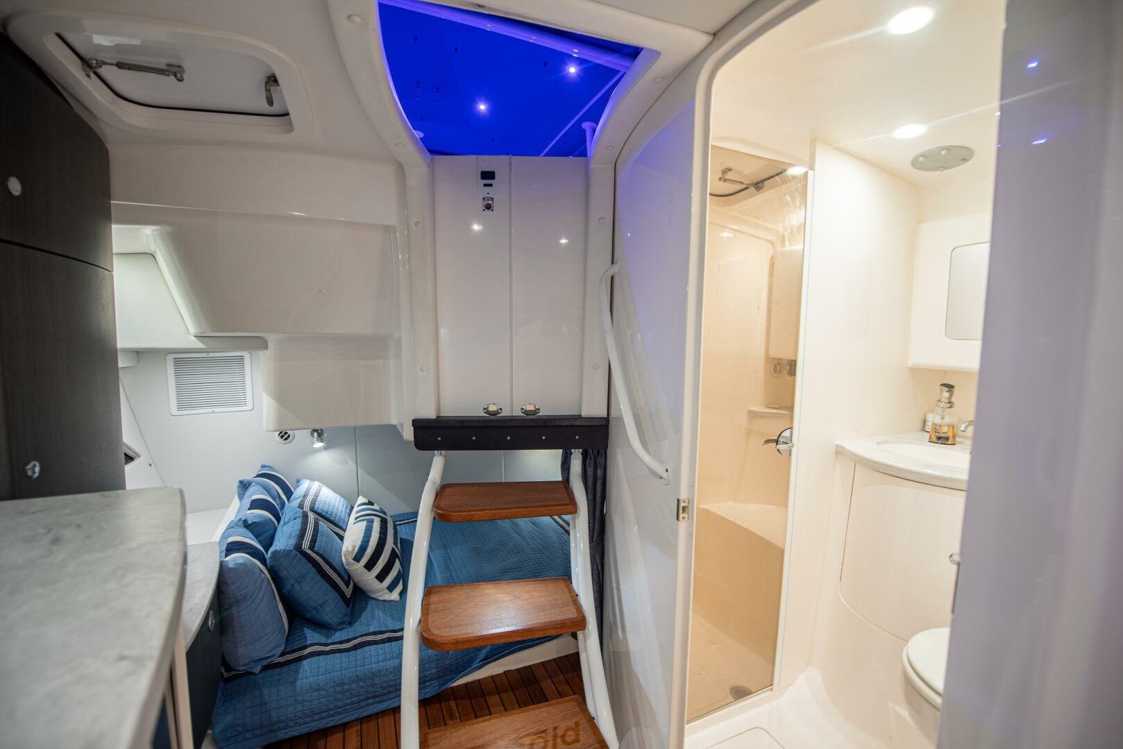 Housing all the essentials, the starboard galley has a refrigerator, sink, and microwave. The head and shower are opposite the galley, right at the bottom of the cabin entrance steps. The head has solid surface countertops, overhead mirrored storage, and a separate shower stall. A large berth for two is aft, running athwartship which reduces the footprint of the cabin while also giving a wider bed than the competition. The aft berth has a closet, nightstand, reading lights, and sliding curtain for privacy.