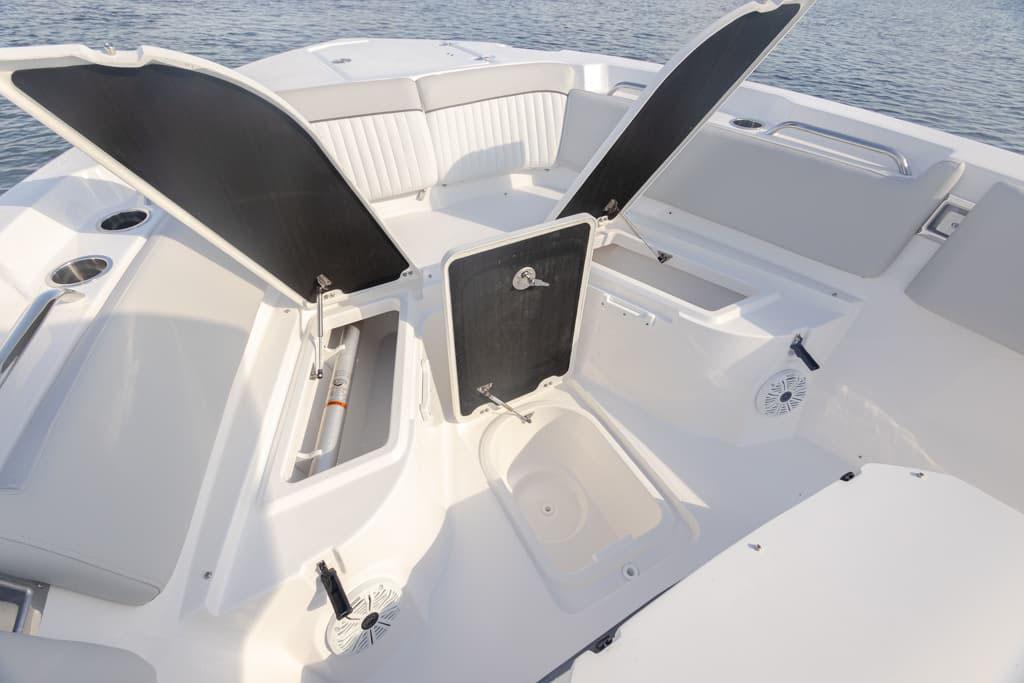 Ample storage in floor compartments and transom box