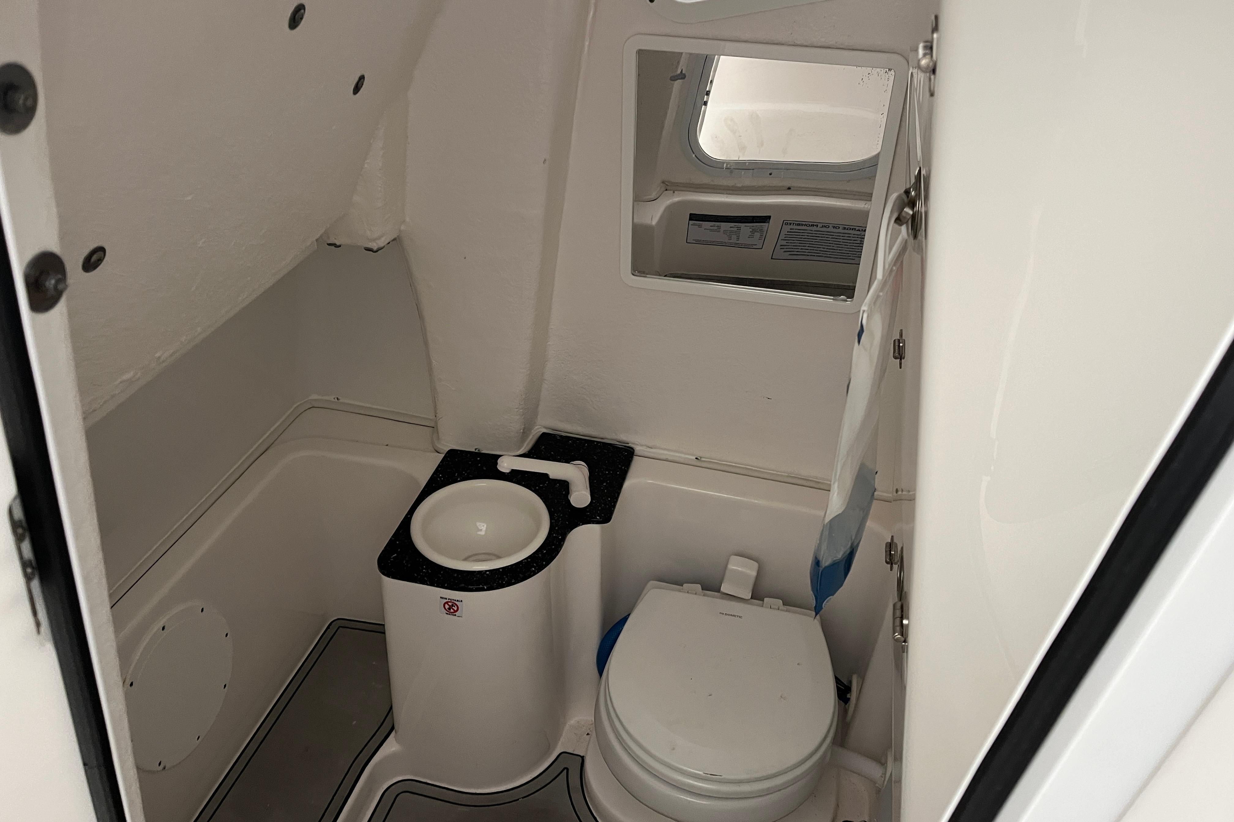 Toilet and sink with Corian countertop, dual portlights