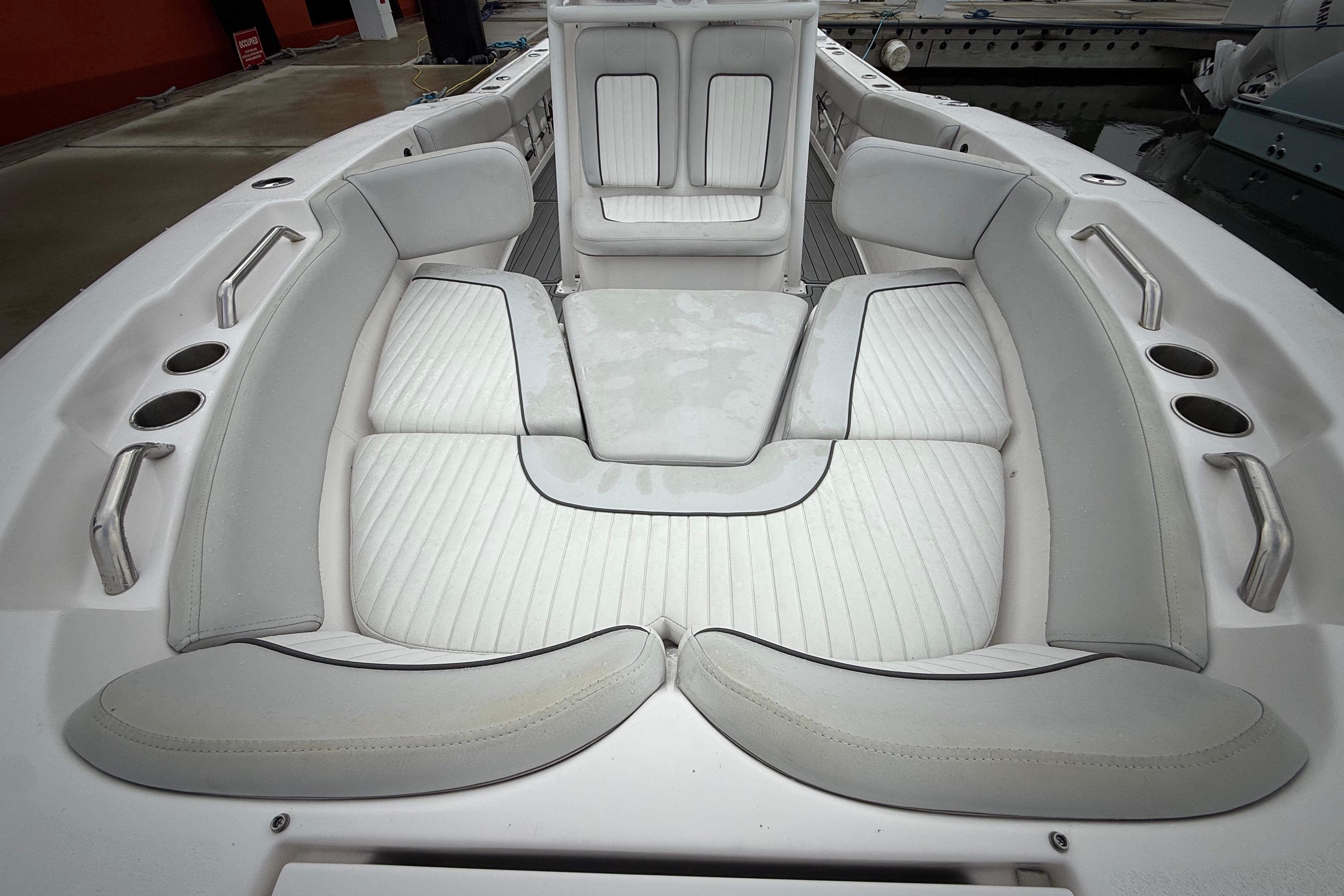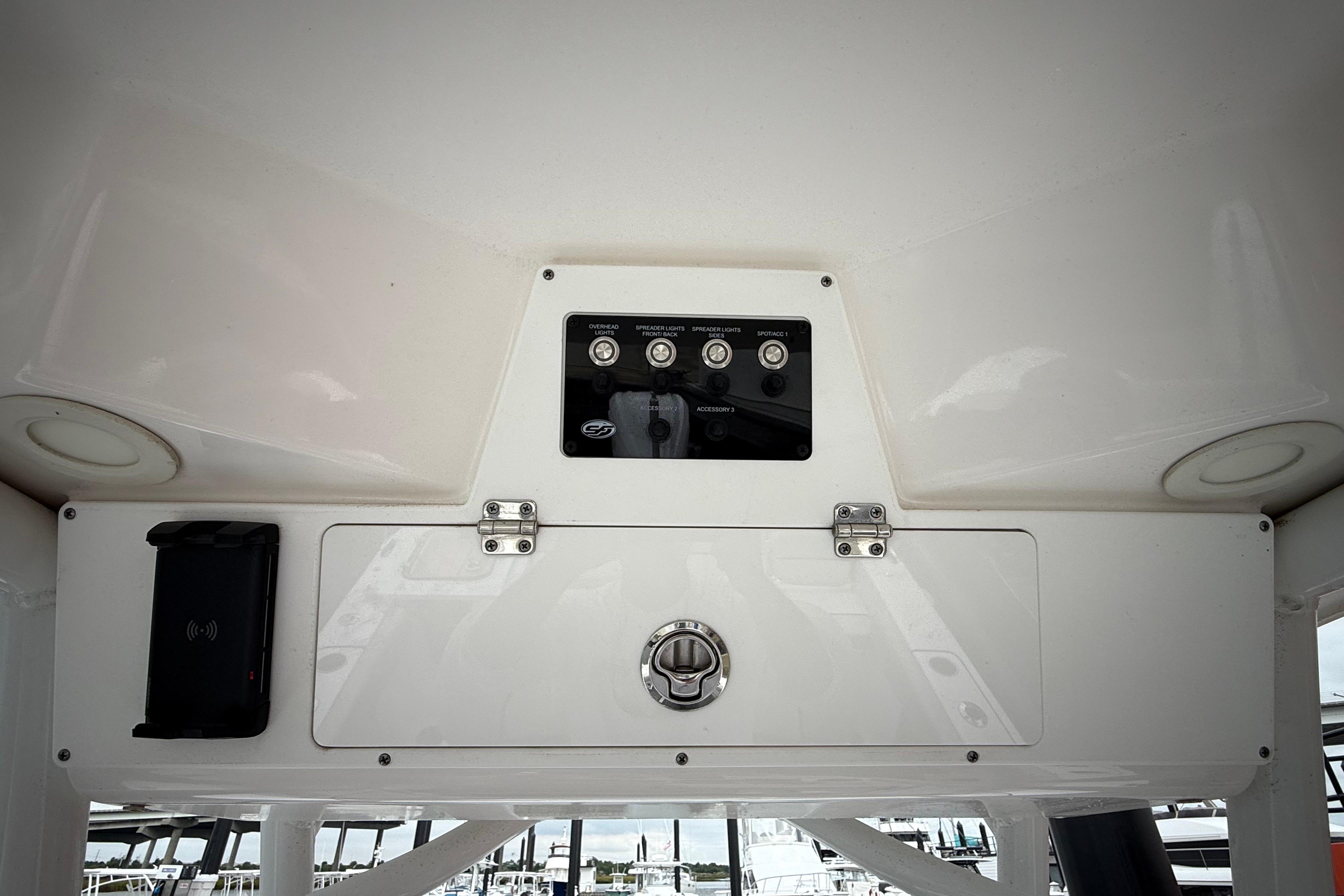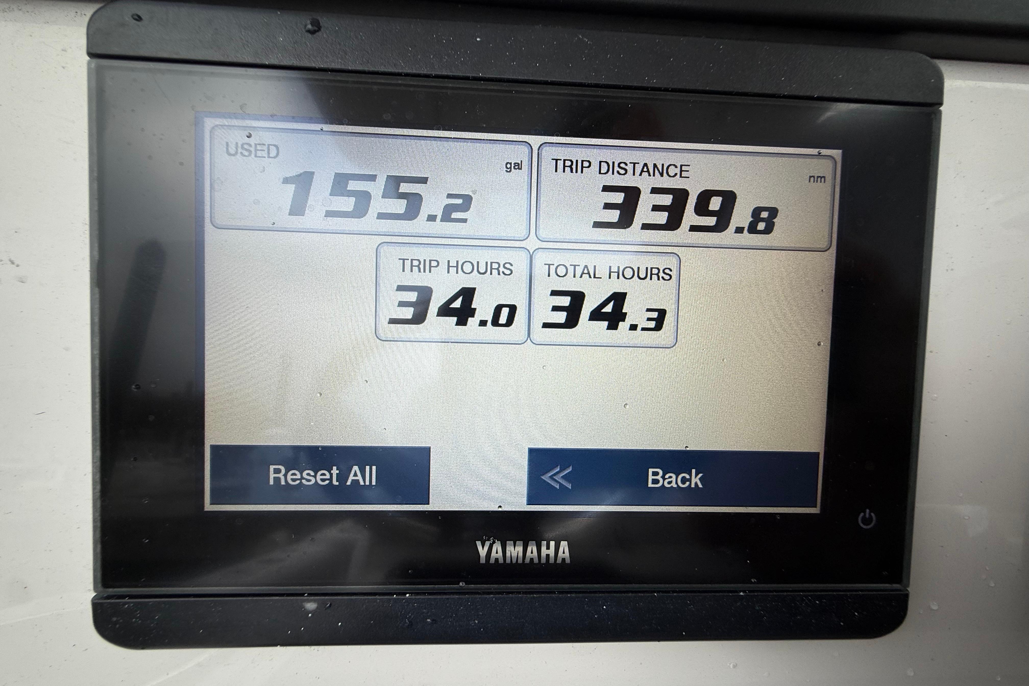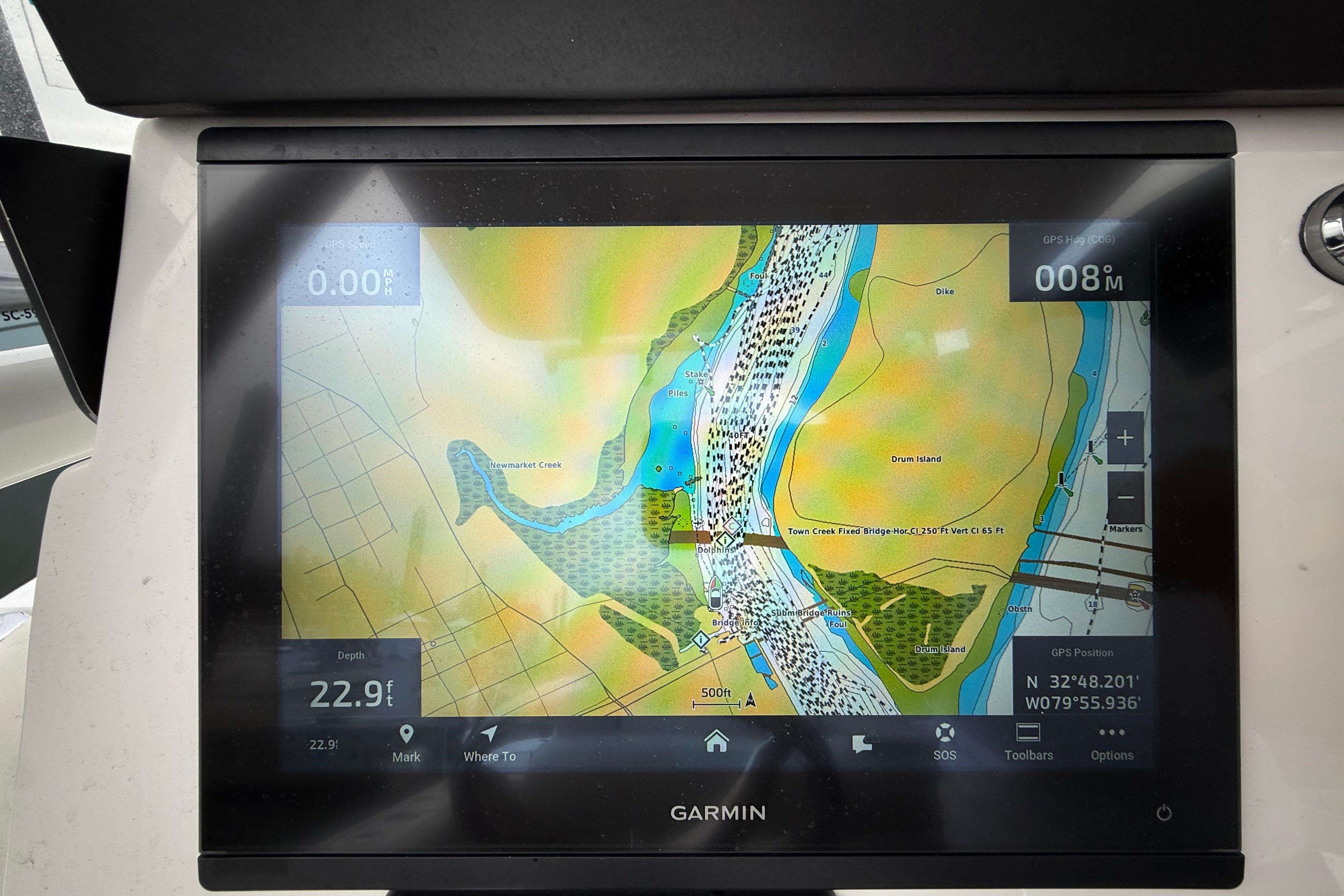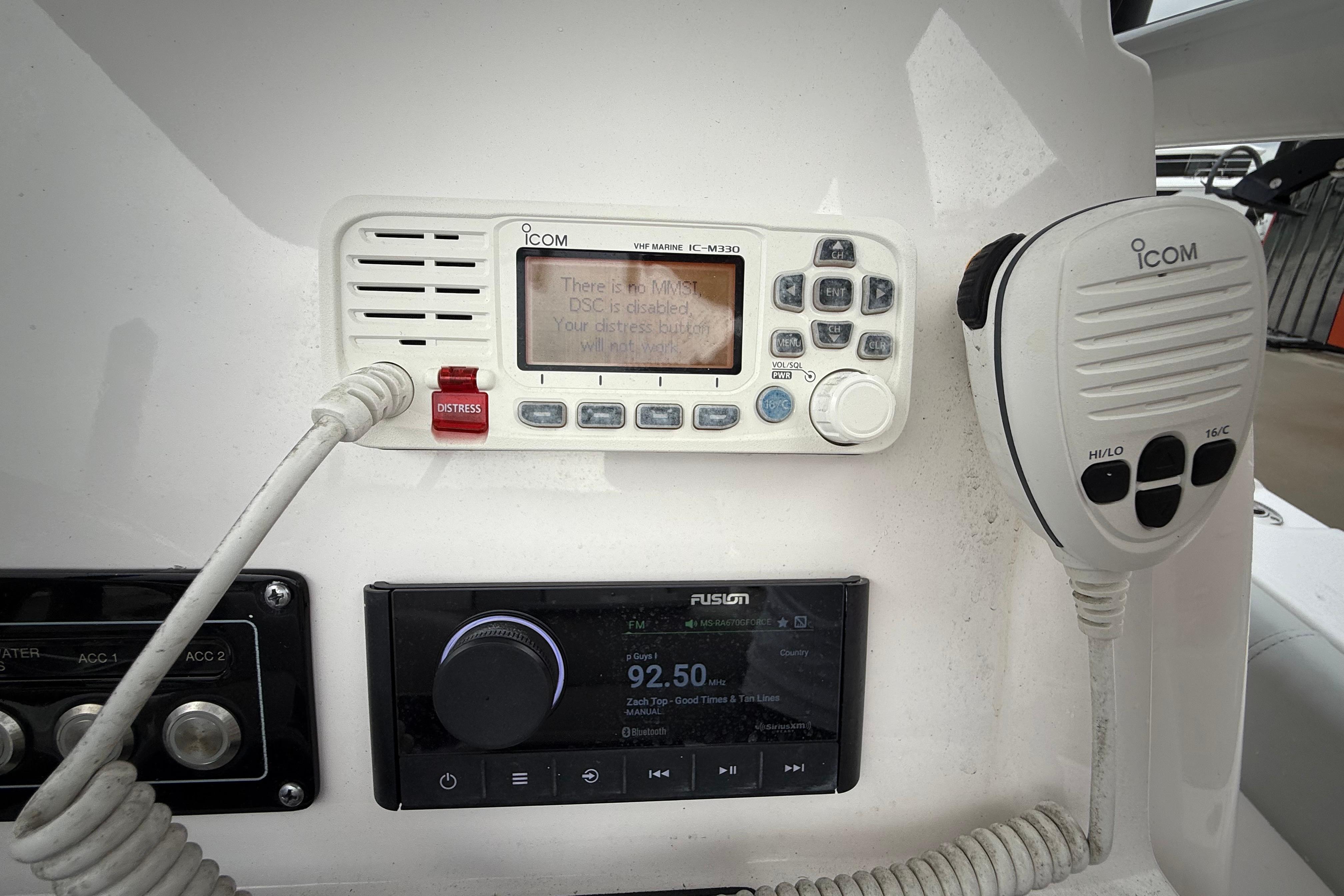 Electronics Package includes Garmin 8612XSV GPS/Chartplotter/Fishfinder, Icom M330 VHF Radio, Fusion Bluetooth Stereo System, (6) Fusion Speakers, Yamaha CL5 Multifunction Gauges, and Wireless Cell Phone Charger.
