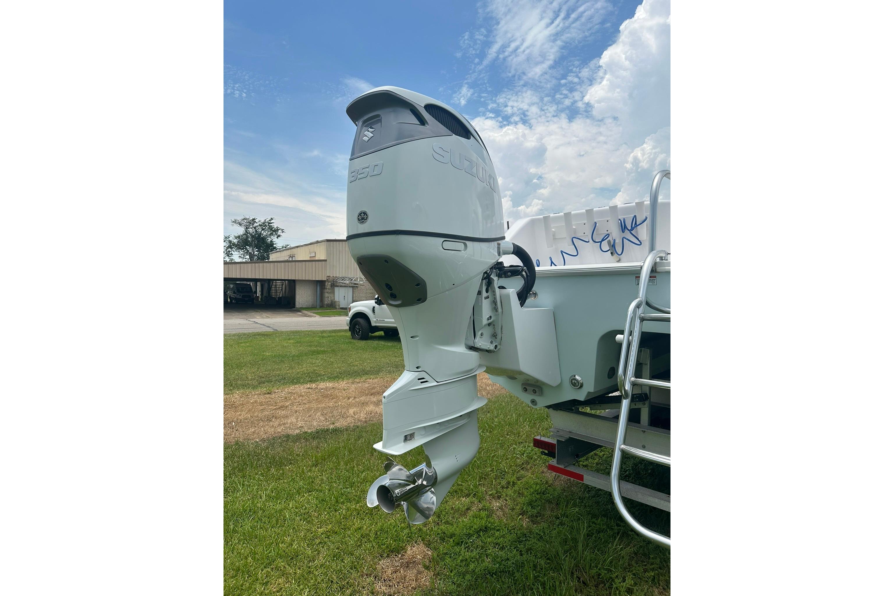 - Twin Fusion White Suzuki DF350ATXXW4 350hp Four-Stroke Counter Rotating Outboard with (4) Blade Stainless Steel Duo-Props (under factory warranty until 2027)