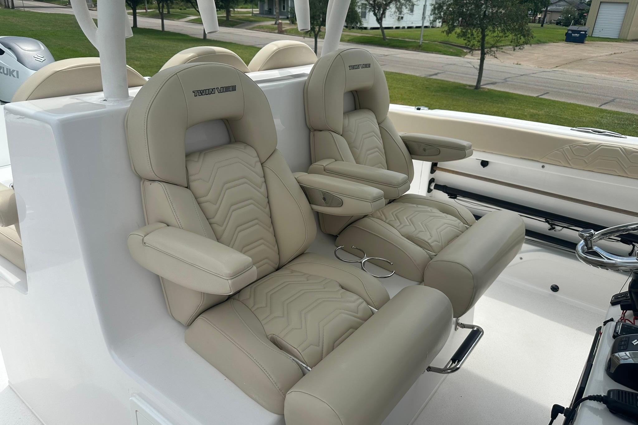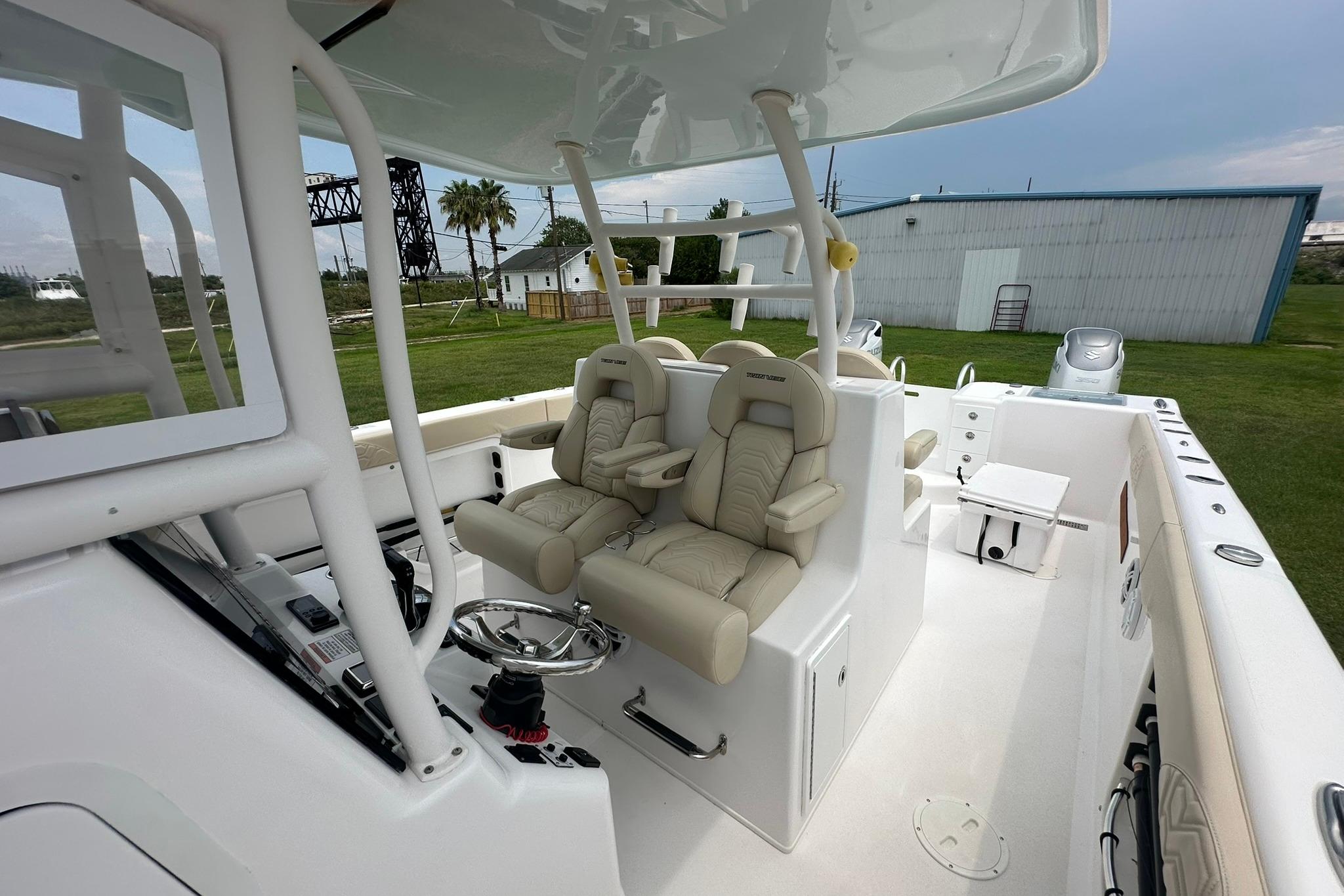 The Twin Vee 340 Go Fish-X is designed for the avid fisher and boater who lives life with a forward motion, power and performance attitude. Twin Vee’s 340 GFX is on-point , no fish will escape the boundless reach of our 340 GF X. Standard equipment includes 382 gallons of fuel capacity, 800 Maximum HP, 300 gallon fish boxes, three live wells – two in the stern and one in the helm seat, XXL coffin box, Llebroc seating and much more. Inject Twin Vee DNA, and you have a wave-eating, fish-catching beast of a nautical machine that will satisfy your passion and desire to compete as a World Class sportsman.