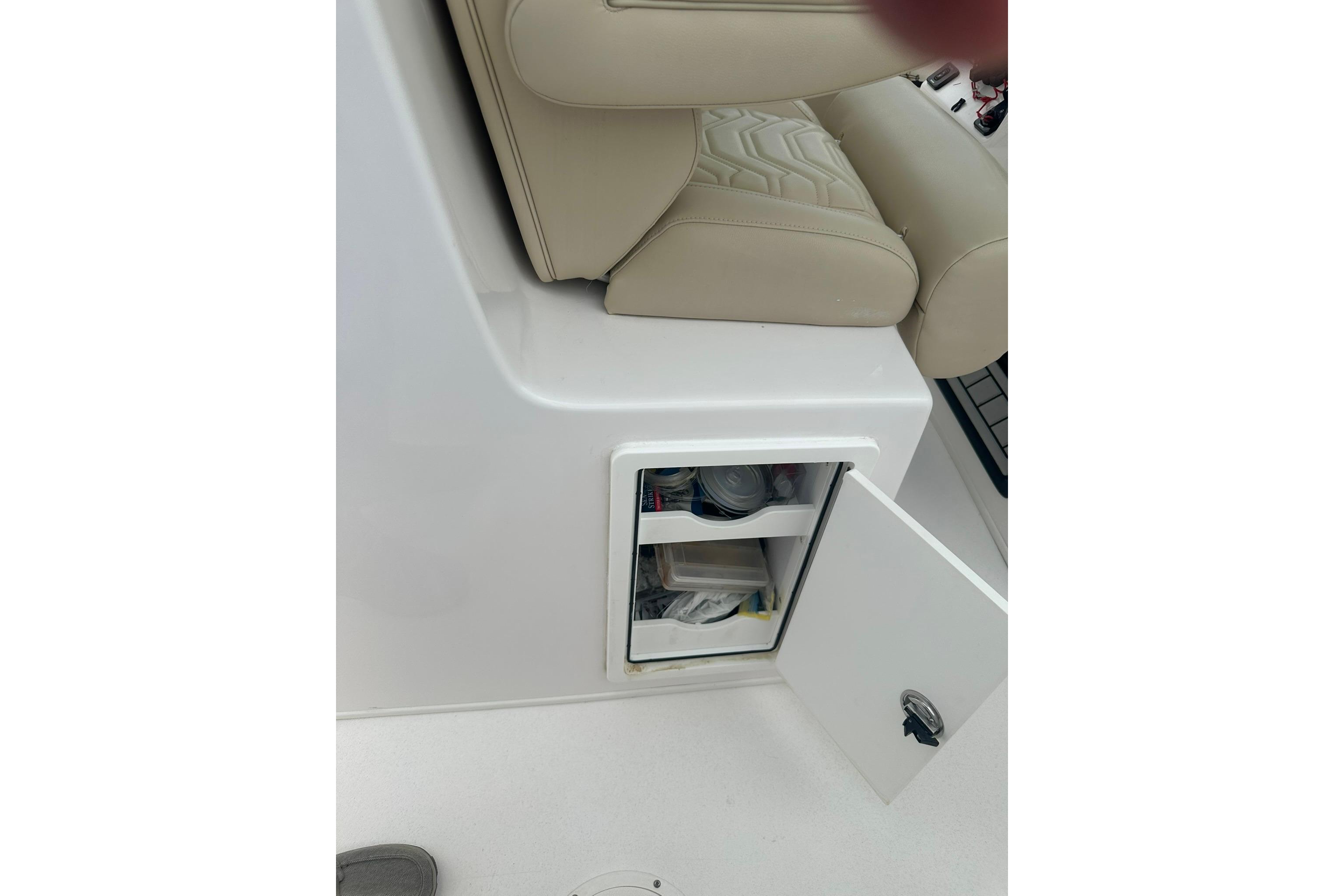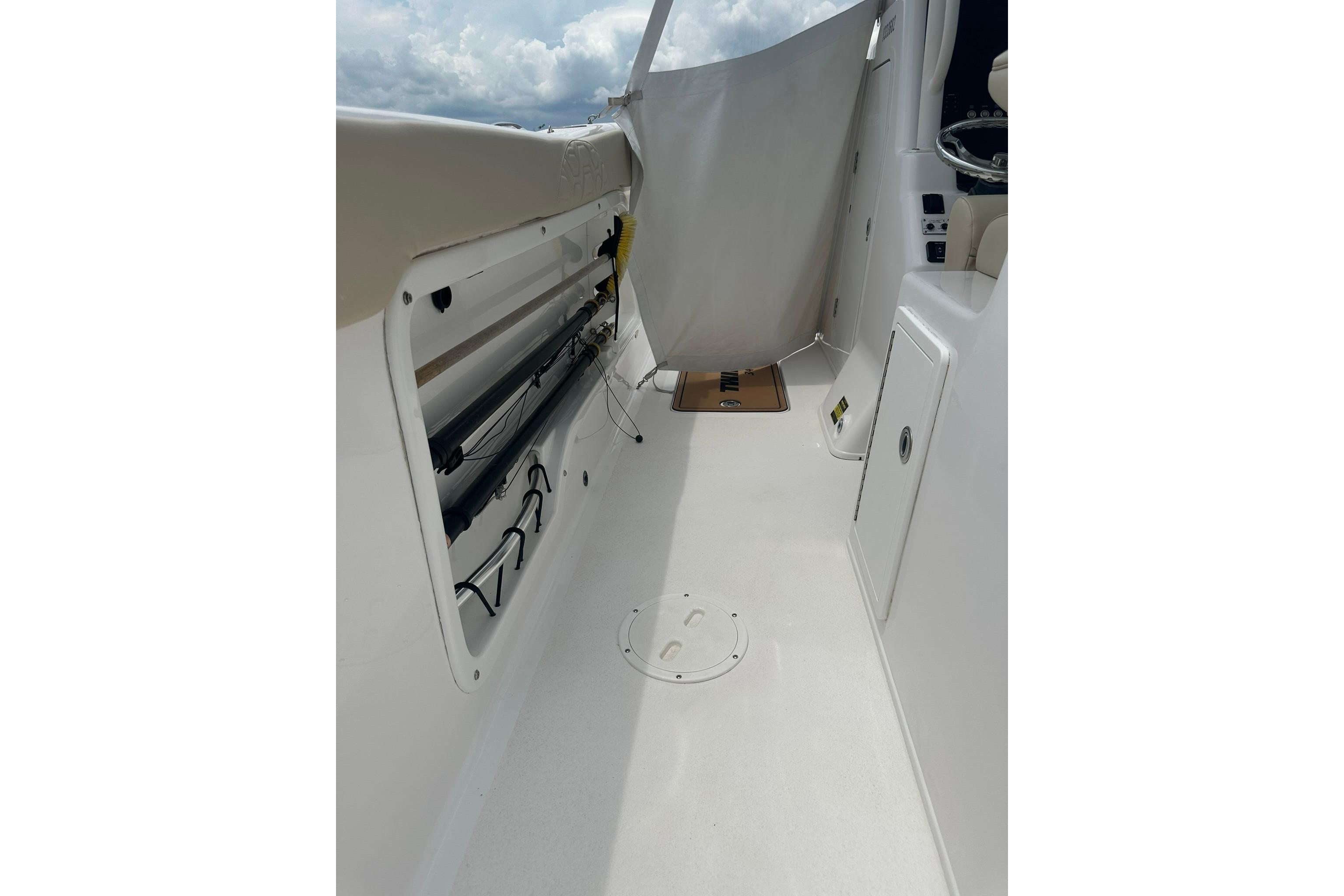- Walk-in Center Console Offers a Large Storage Area for Bow Cushions and Marine Head, Access to Panels, Fuses and Switches, with a Roll Down Curtain to hide them. Battery switches