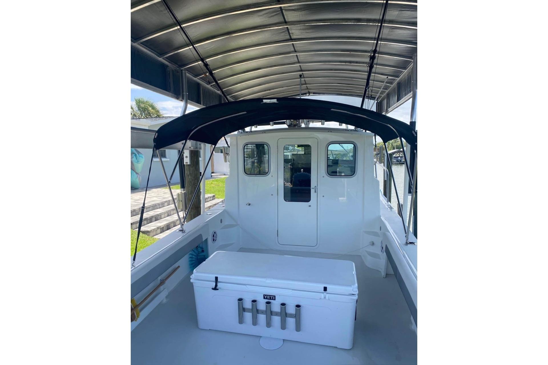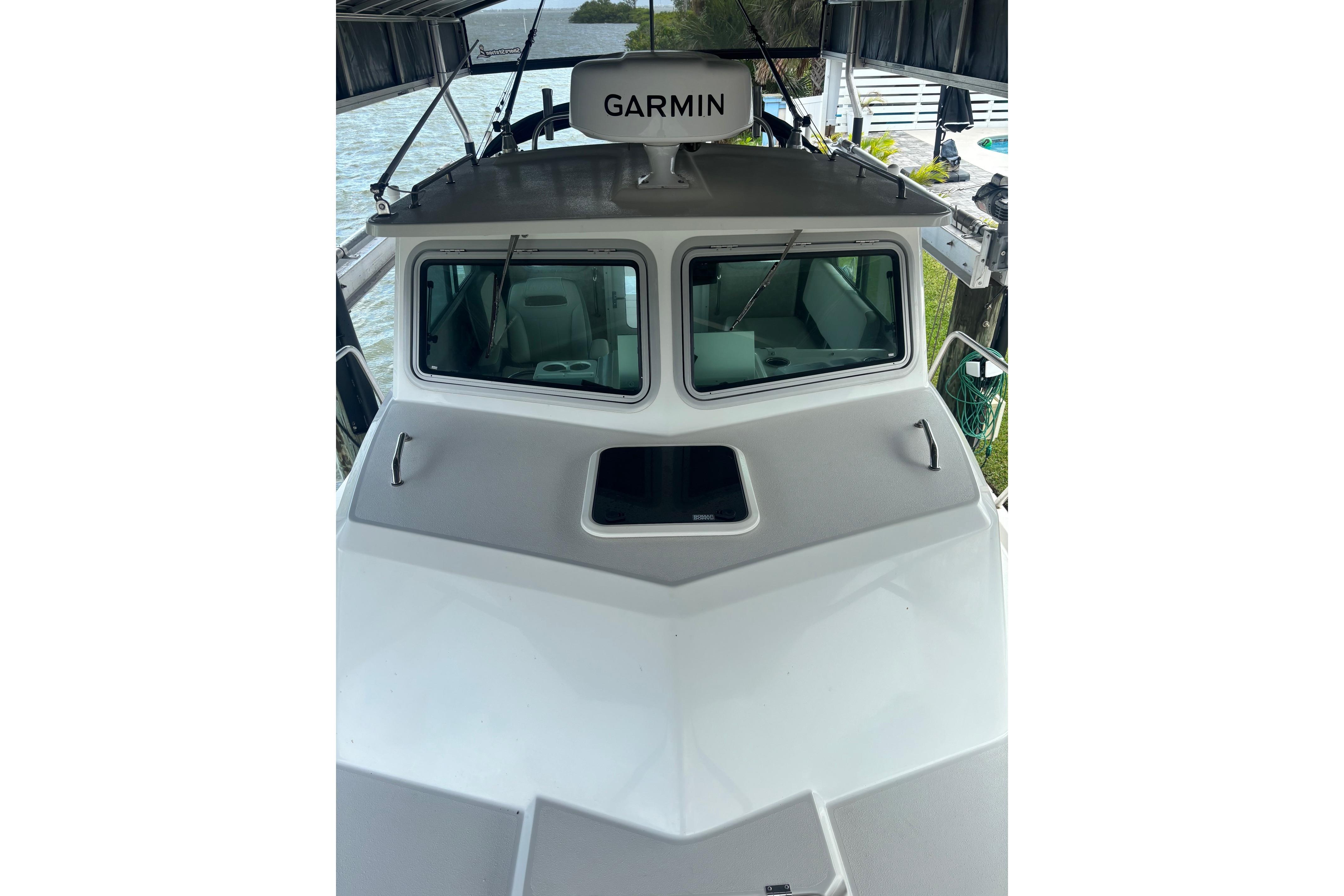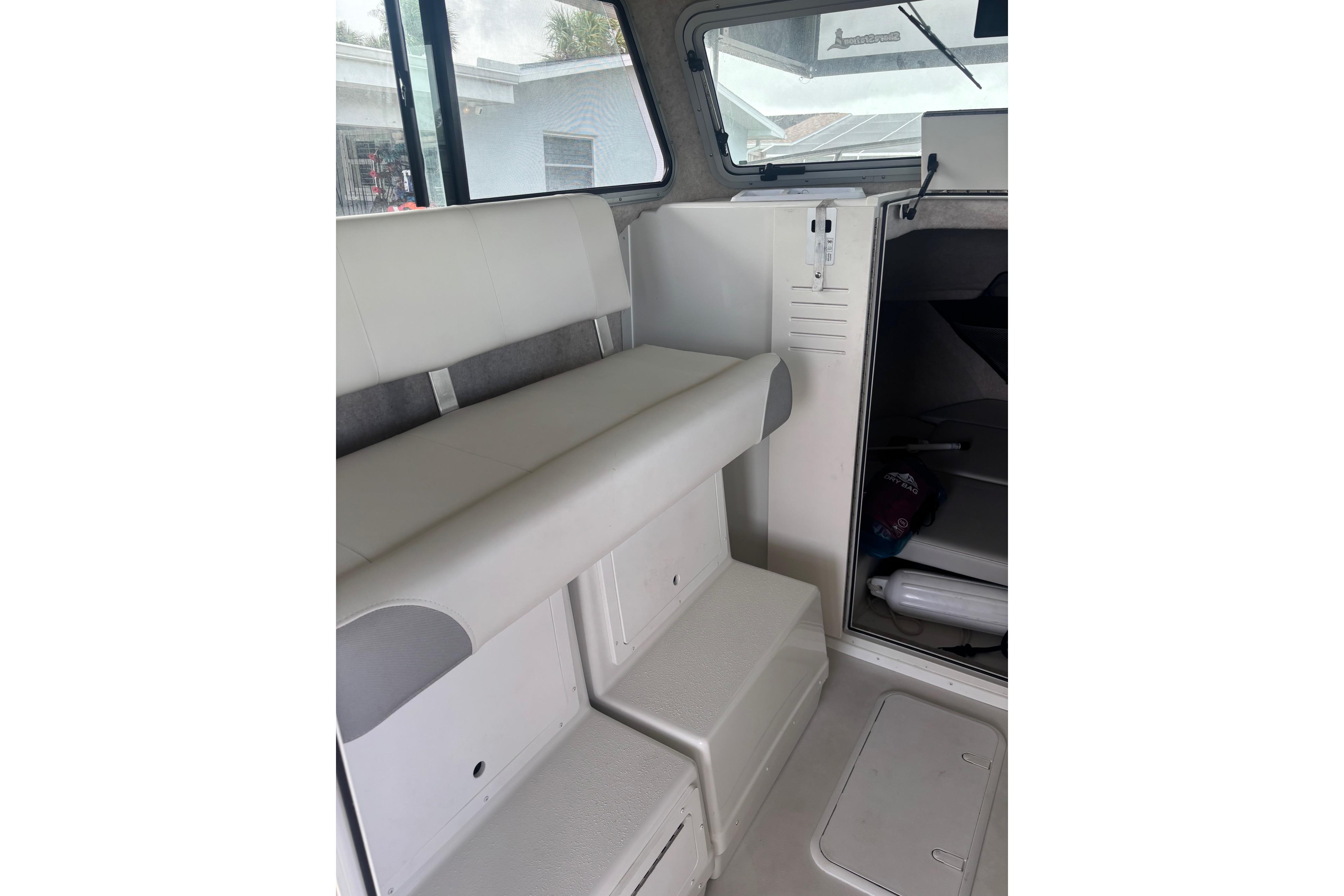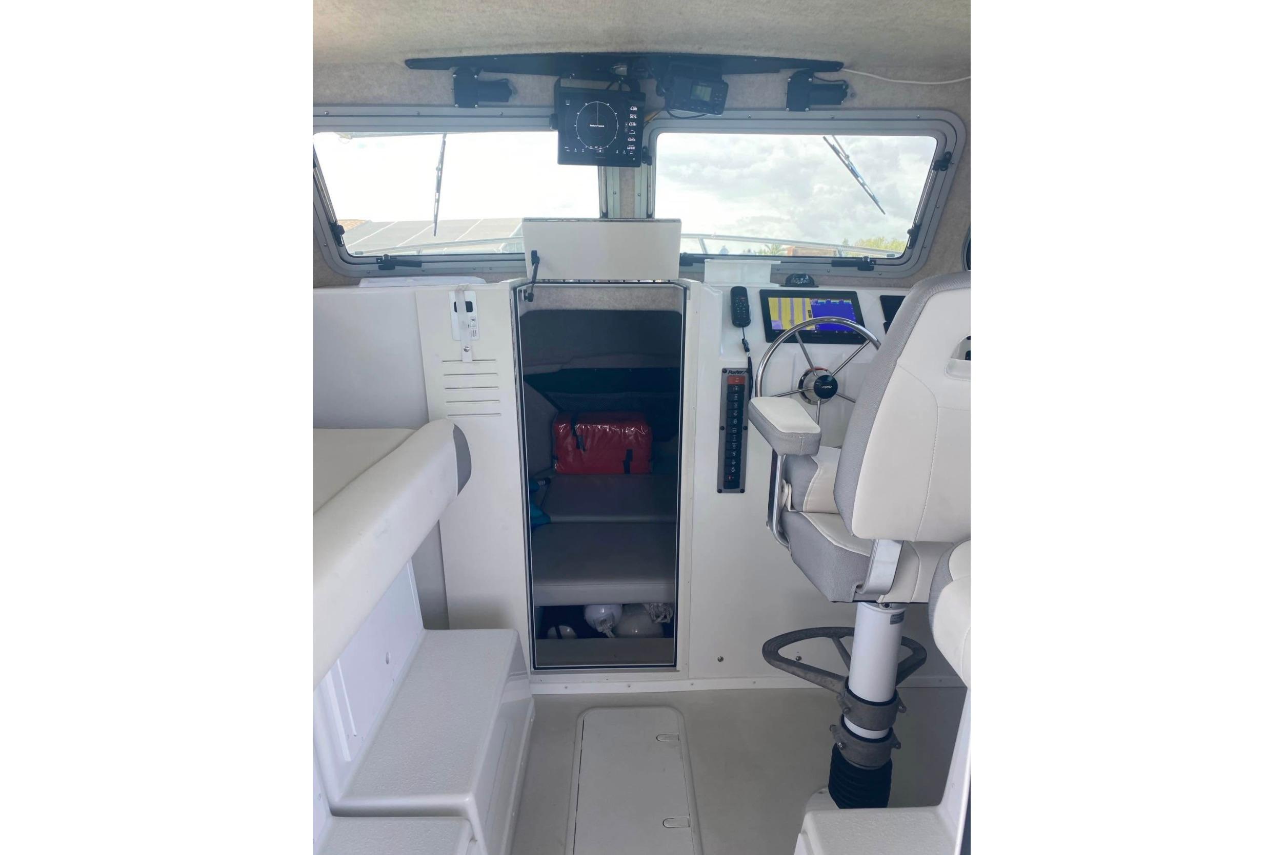 Pilothouse (59"Length, 82"Width,76" Headroom): Tinted windshields Port and Starboard opening front windows, Port and Starboard opening windows with screens with anodized aluminum frames, headliner, overhead lighting, ladder back chairs with cushions and, Port and Starboard aft companion seats with interior storage; non-skid pilothouse floor, grabrails on aft bulkhead, cup holders (2)