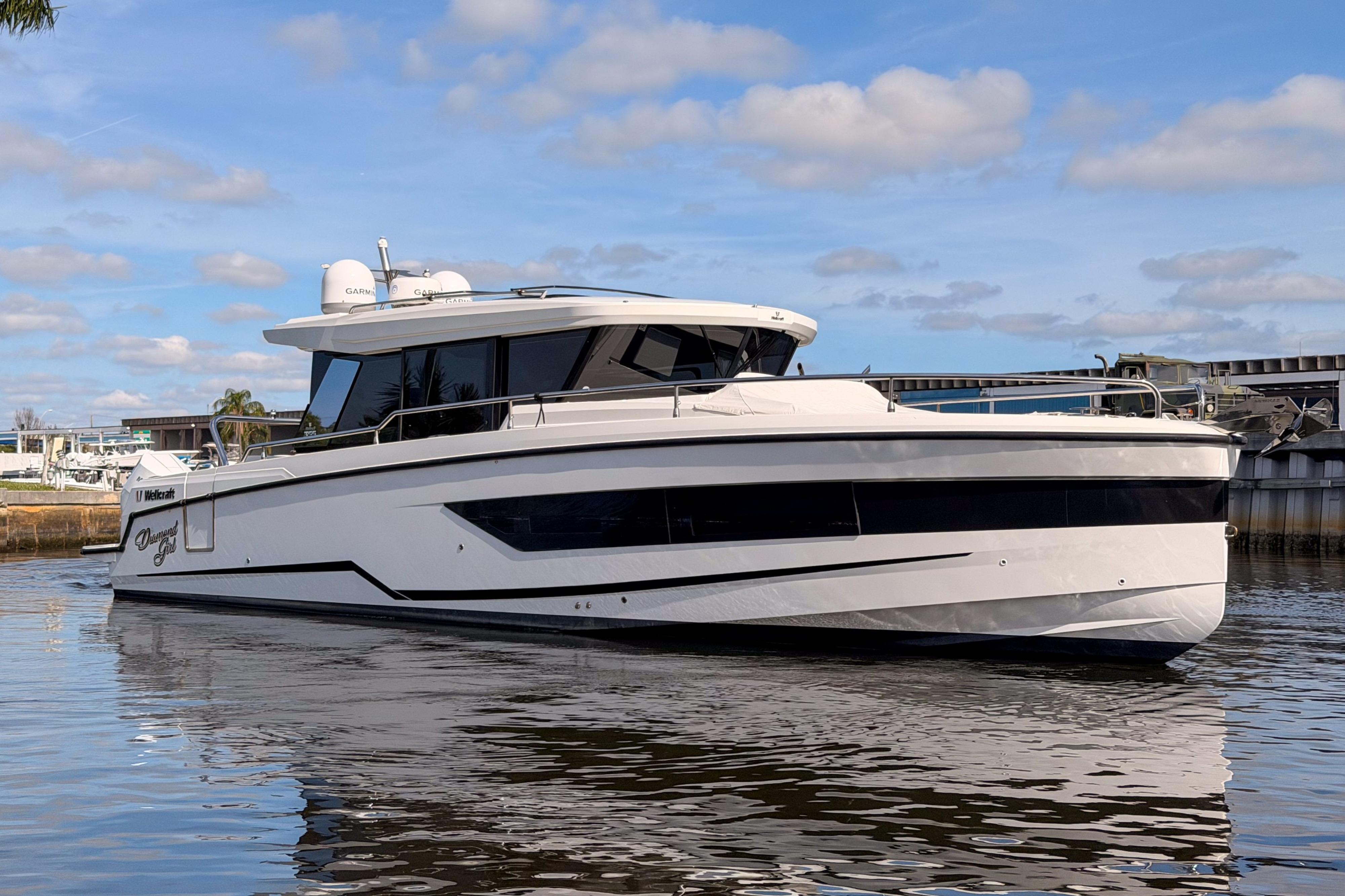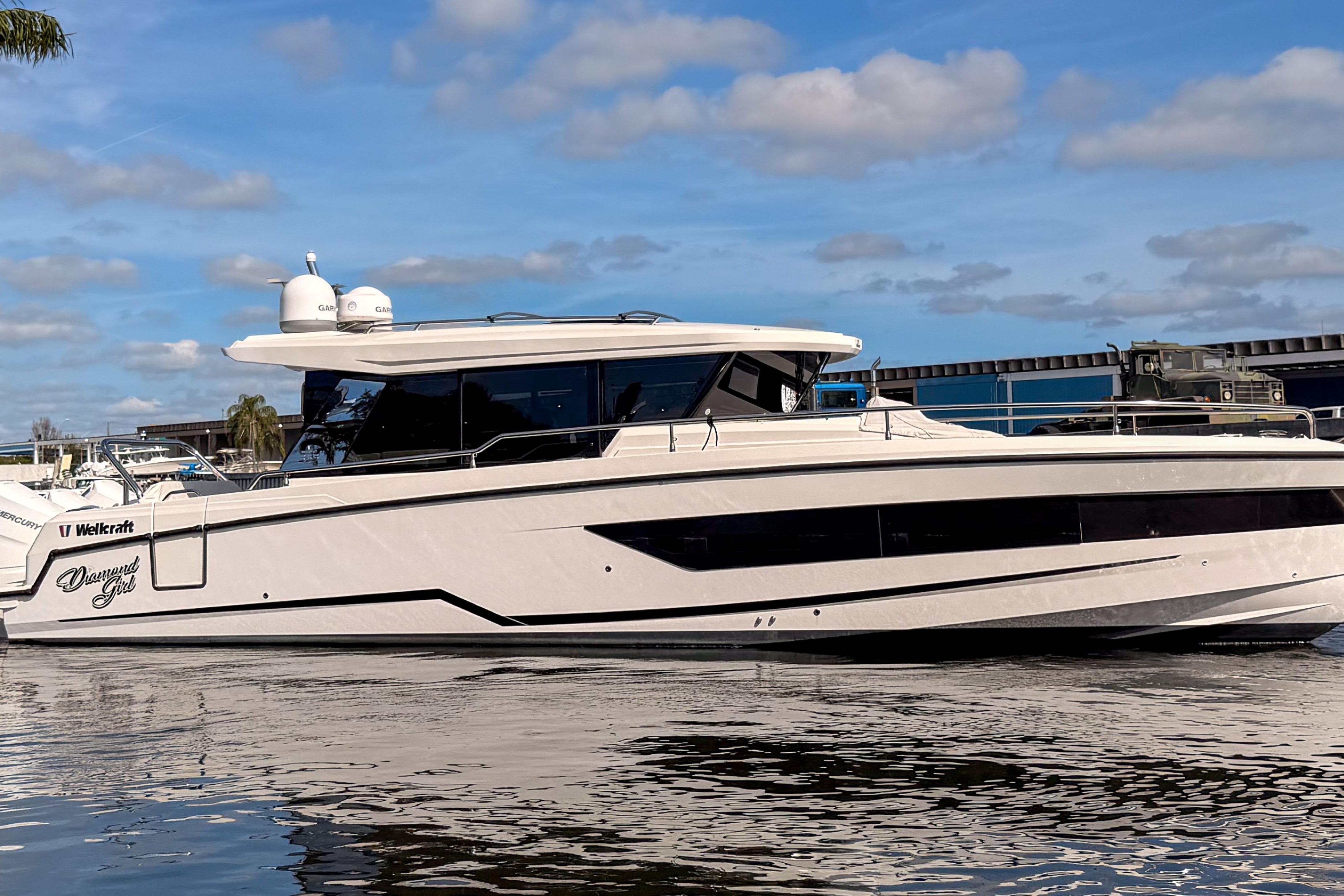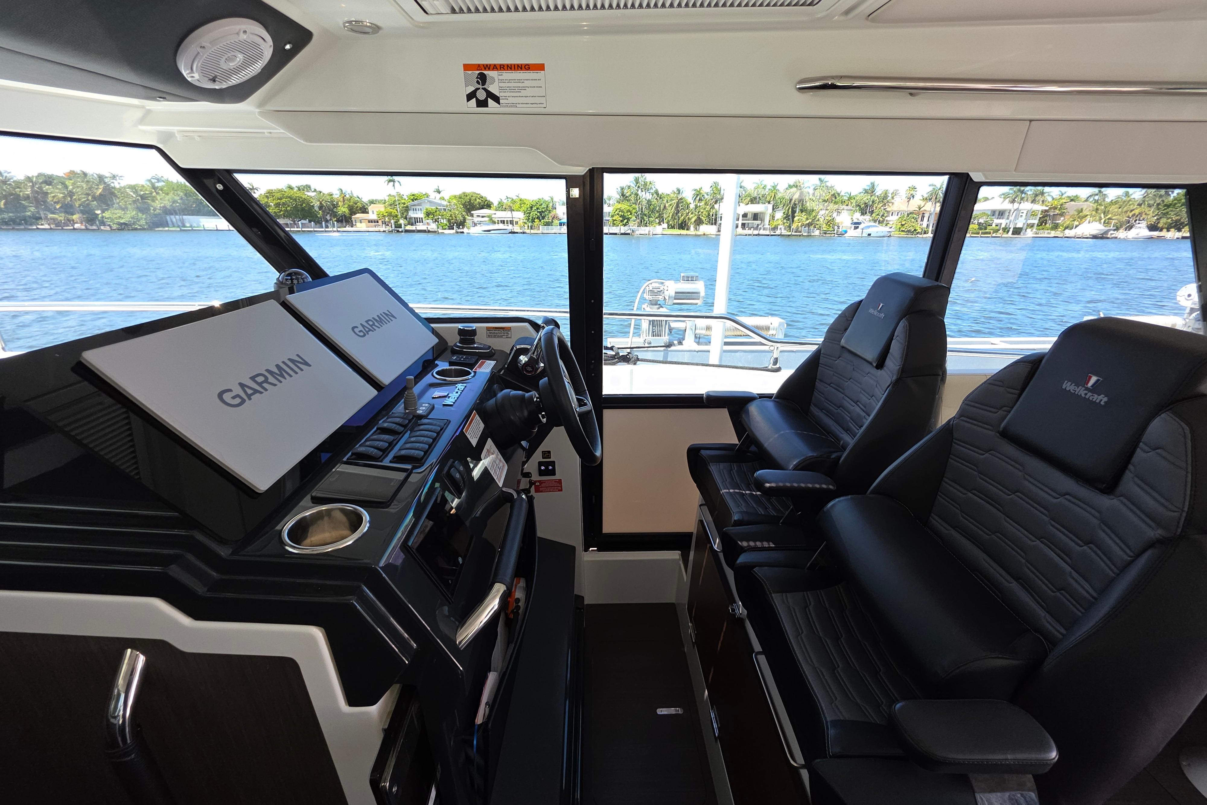 The 2024 Wellcraft 355 Commuter is a 39-foot power boat designed for a variety of water activities, combining luxury, performance, and functionality. It features a Michael Peters hull design, triple Mercury outboards, and a comfortable, versatile interior. The aft cockpit is designed for both relaxation and activity, with a hose-out floor, open layout, and optional seating configurations. It also includes a tow hook for water sports and storage compartments. The interior includes a cabin with a large bed, an ensuite head with a shower, and a galley with a sink and refrigerator. The dinette area converts into a bed, and the boat offers ample natural light and ventilation. The helm station is equipped with comfortable seats, armrests, a dashboard with multi-function displays, and a joystick for maneuverability.