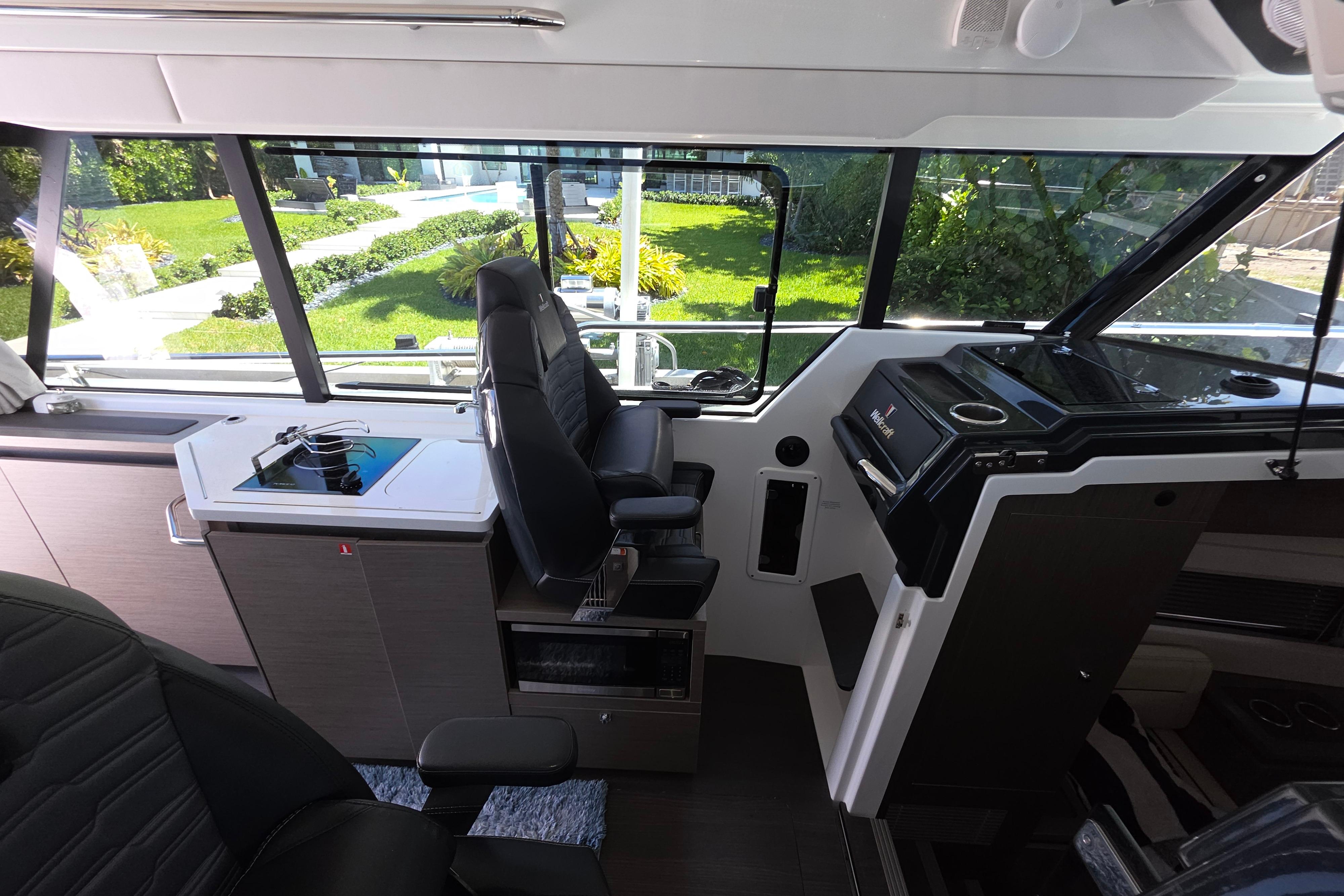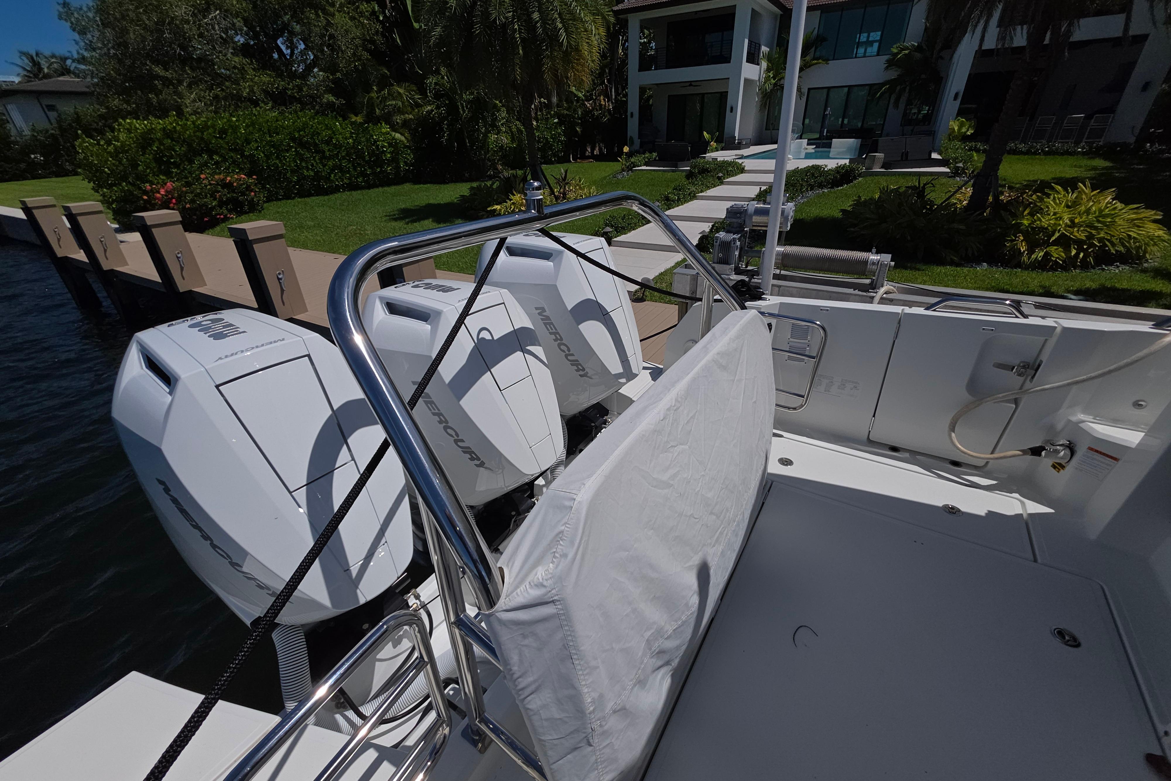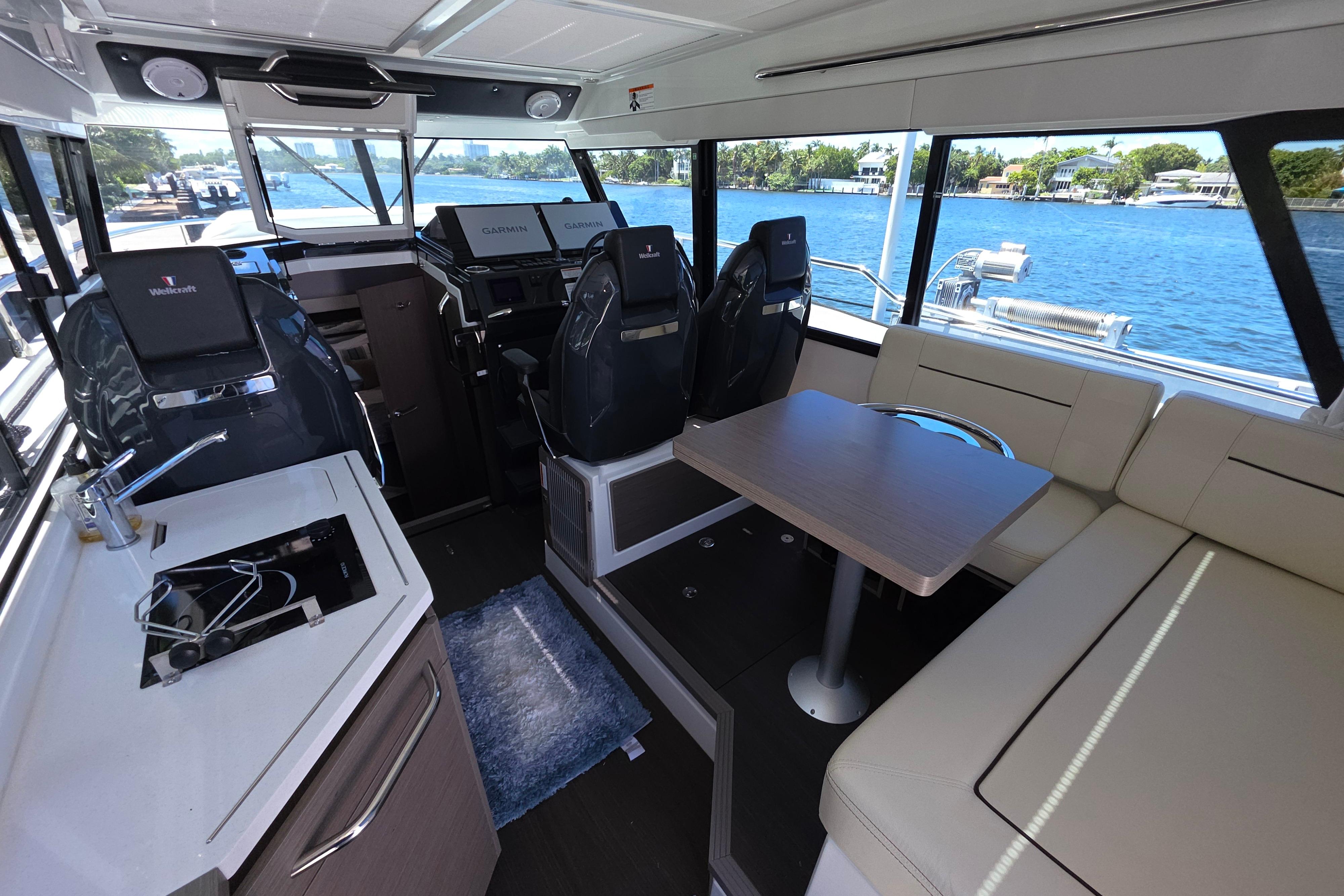 The 2024 Wellcraft 355 Commuter is a 39-foot power boat designed for a variety of water activities, combining luxury, performance, and functionality. It features a Michael Peters hull design, triple Mercury outboards, and a comfortable, versatile interior. The aft cockpit is designed for both relaxation and activity, with a hose-out floor, open layout, and optional seating configurations. It also includes a tow hook for water sports and storage compartments. The interior includes a cabin with a large bed, an ensuite head with a shower, and a galley with a sink and refrigerator. The dinette area converts into a bed, and the boat offers ample natural light and ventilation. The helm station is equipped with comfortable seats, armrests, a dashboard with multi-function displays, and a joystick for maneuverability.