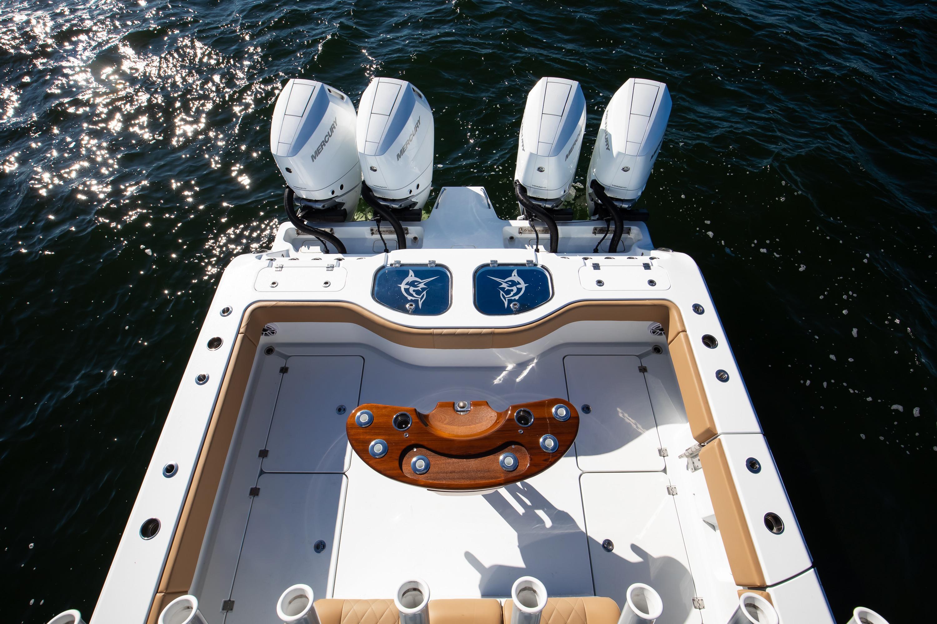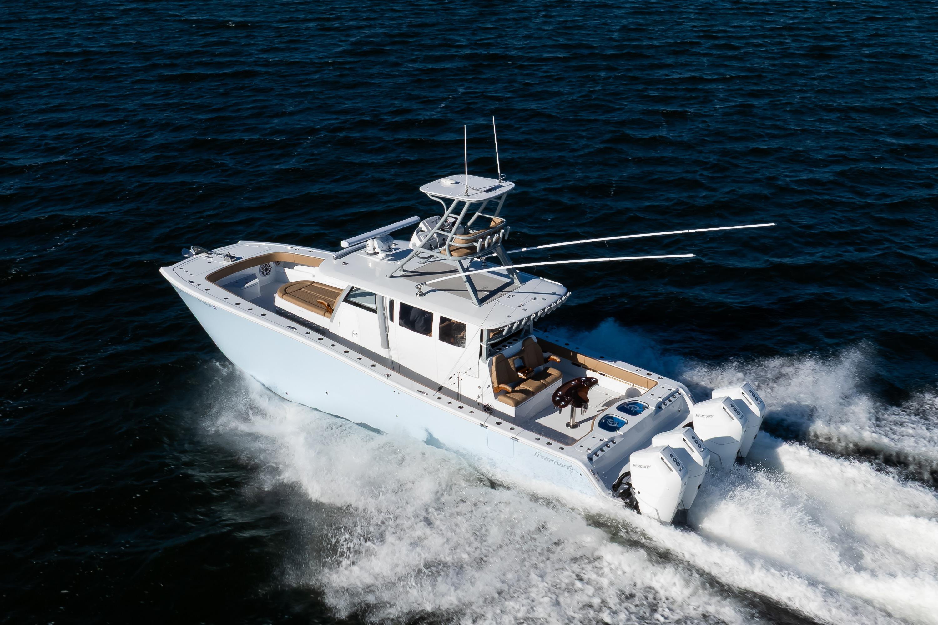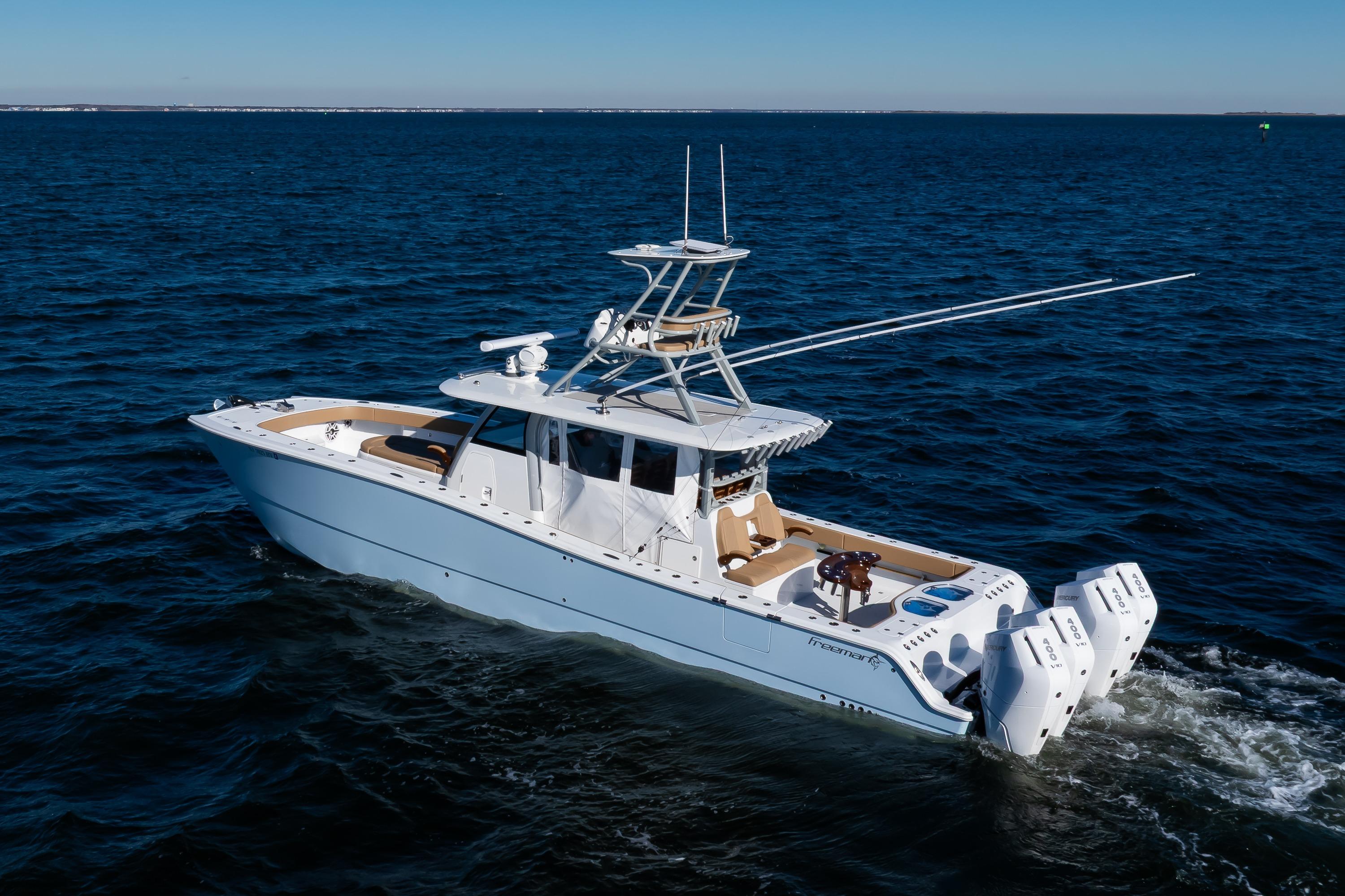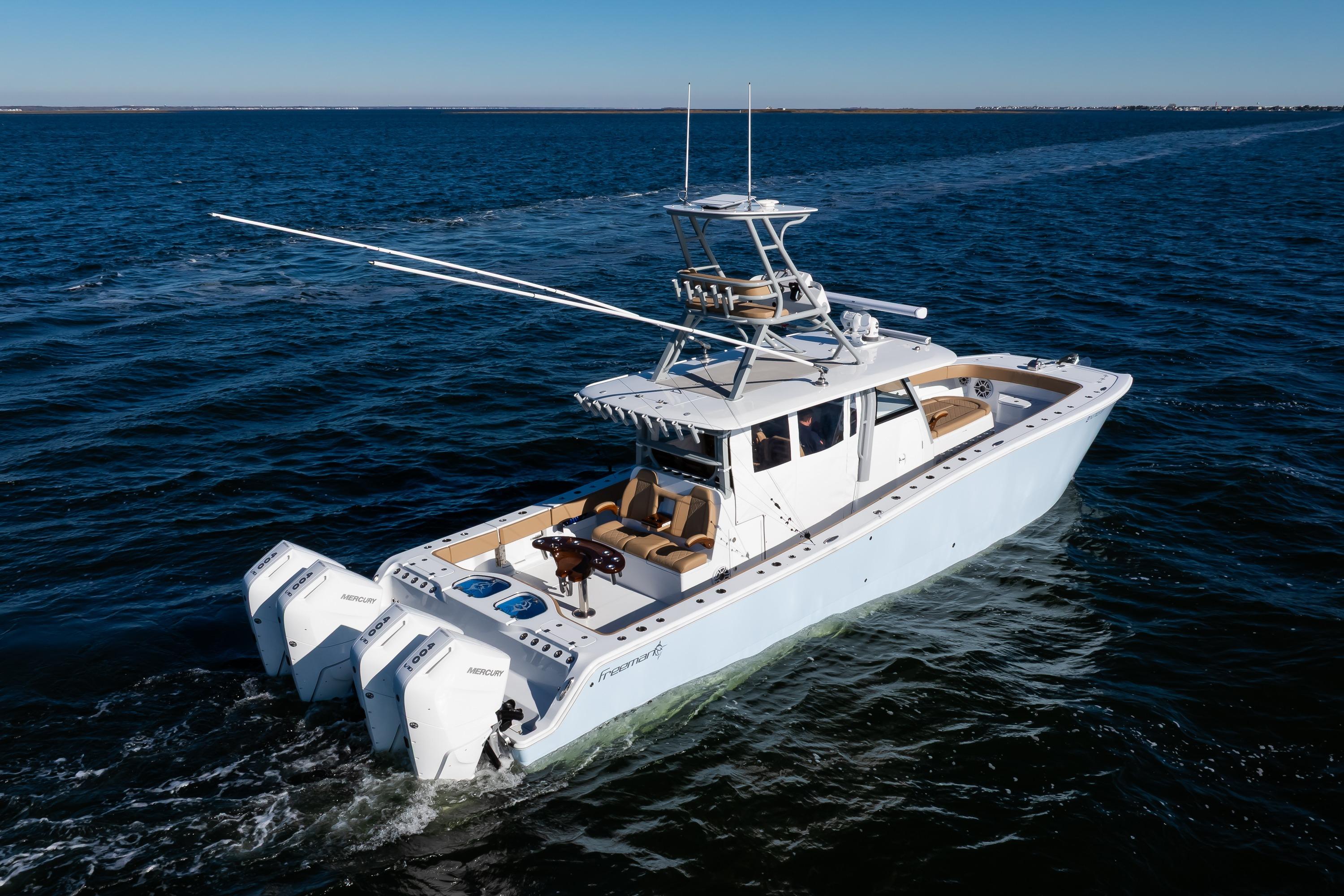 This 2025 Freeman 43 is a rare opportunity to own a highly customized, lightly used example of one of the most capable center consoles ever built. Finished in Ethereal Blue with a painted underside hardtop, she showcases Freeman’s renowned blend of performance, versatility, and craftsmanship. Powered by quad Mercury 400 V10s, this 43 delivers exceptional speed, range, and efficiency—whether fishing the canyons or cruising with family. Outfitted with advanced Simrad electronics, premium Release Marine seating, and tournament-level fishing systems, she embodies the perfect balance of power, luxury, and offshore capability.