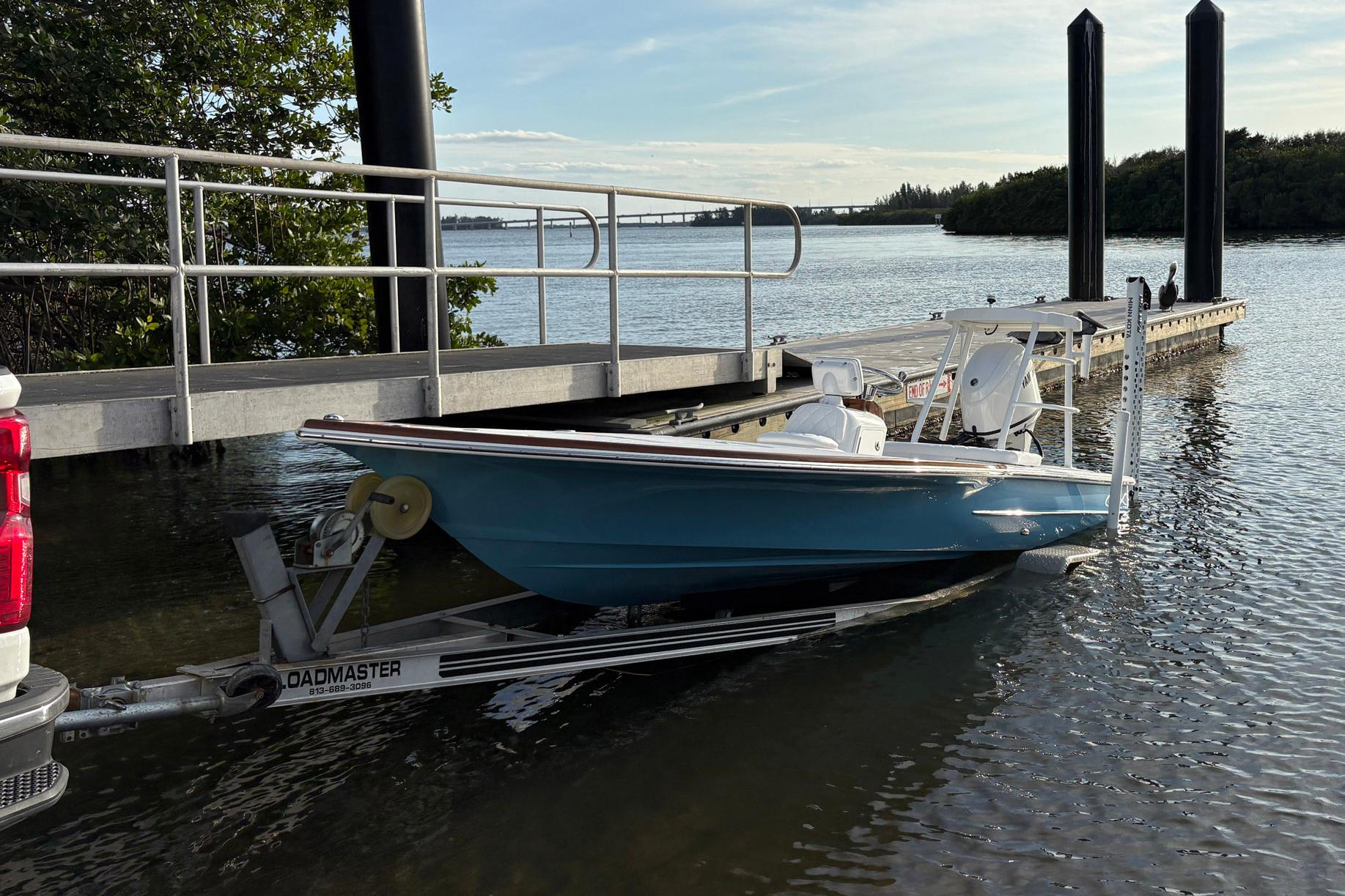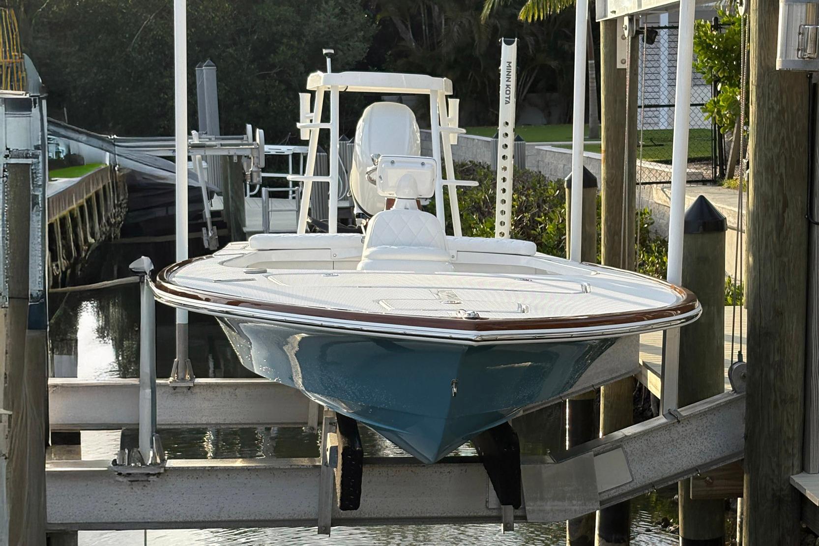 This beautiful Carolina flare light tackle skiff is equipped with a power pole, live well, Garmin GPS fish finder, Fusion stereo, battery charger, toe rail, and console.